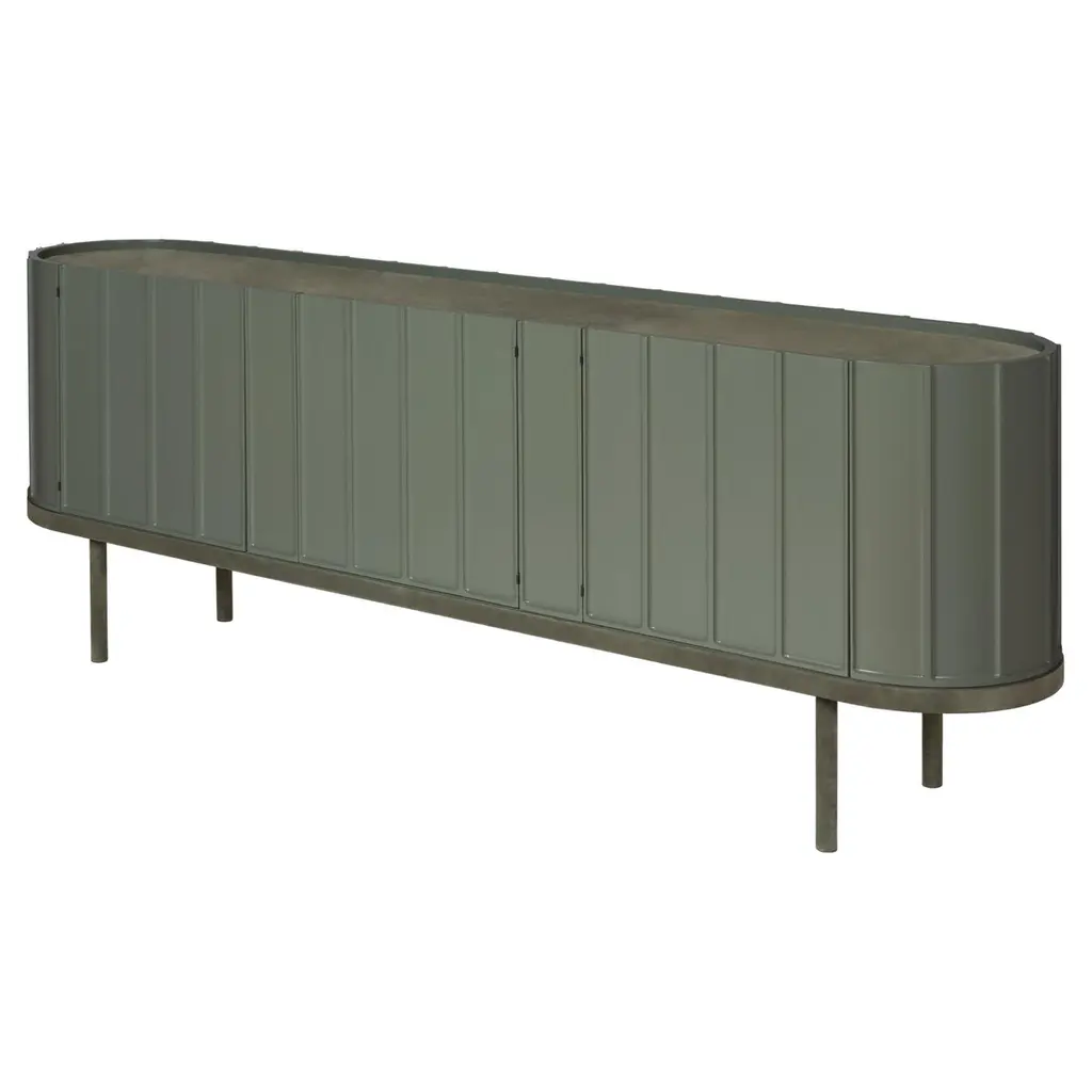 This record player console blends classic and contemporary design with its curved front and vertical slat detailing. Crafted from lacquered MDF, the piece offers durable storage for your vinyl collection and audio equipment. Featuring stabilizing feet, push-pull doors, and an elegant green finish, it stands as a functional statement piece. Available in 12 striking colors, this console is an essential addition to any modern living room.