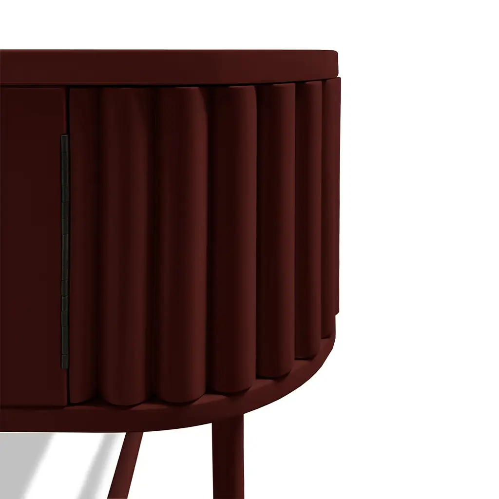 This record player console stands out with its elegant bordeaux finish. The dynamic combination of vertical slats and a curved front creates a visually engaging look. Constructed from durable lacquered MDF, the console offers a functional space for both your vinyl collection and audio equipment. Featuring push-pull doors for easy access and stabilizing feet, this stylish piece is available in 12 colors, ideal for any modern living space. Please contact the Concierge for more details.