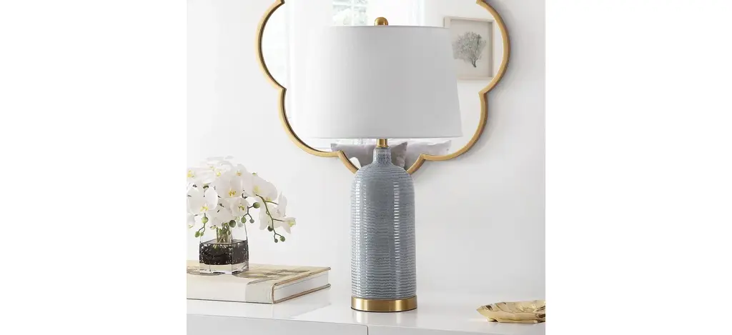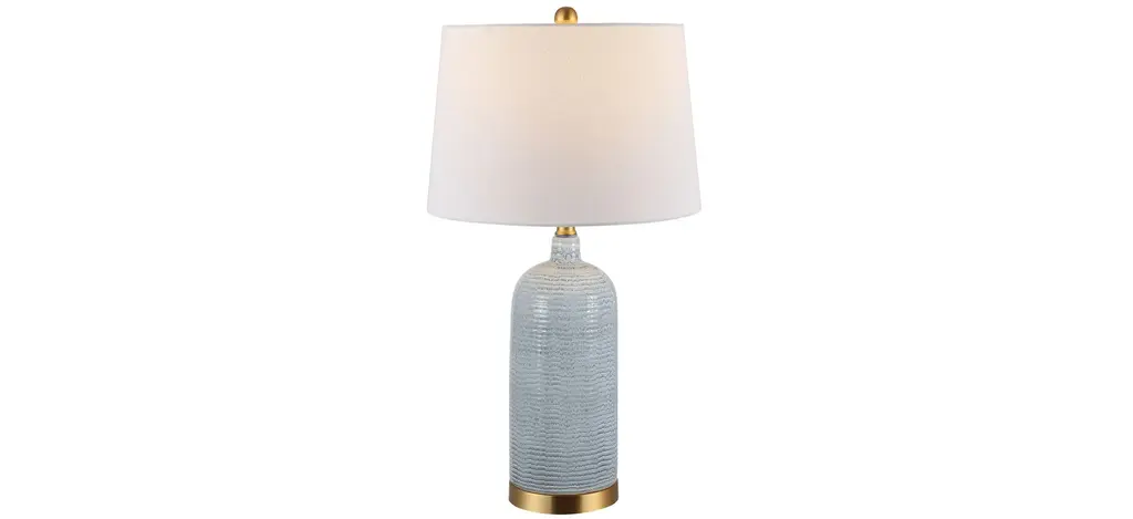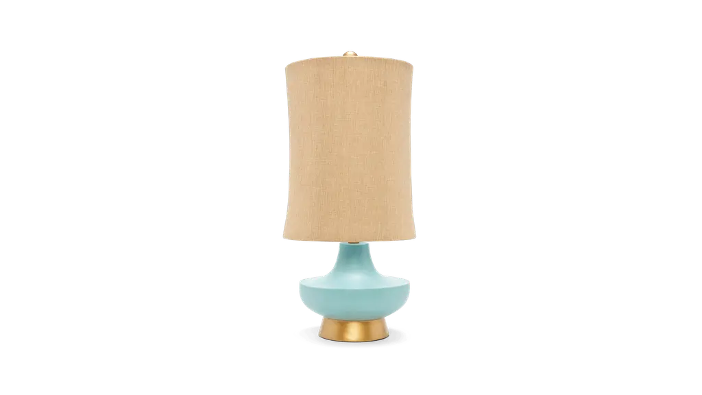 This Wade Glass Table Lamp is an icon of artistic, glamorous living. Wade's wine bottle silhouette and textured striations pair beautifully with its gently toned blue ceramic, perfectly highlighting the shining gold finish on its base and finial.