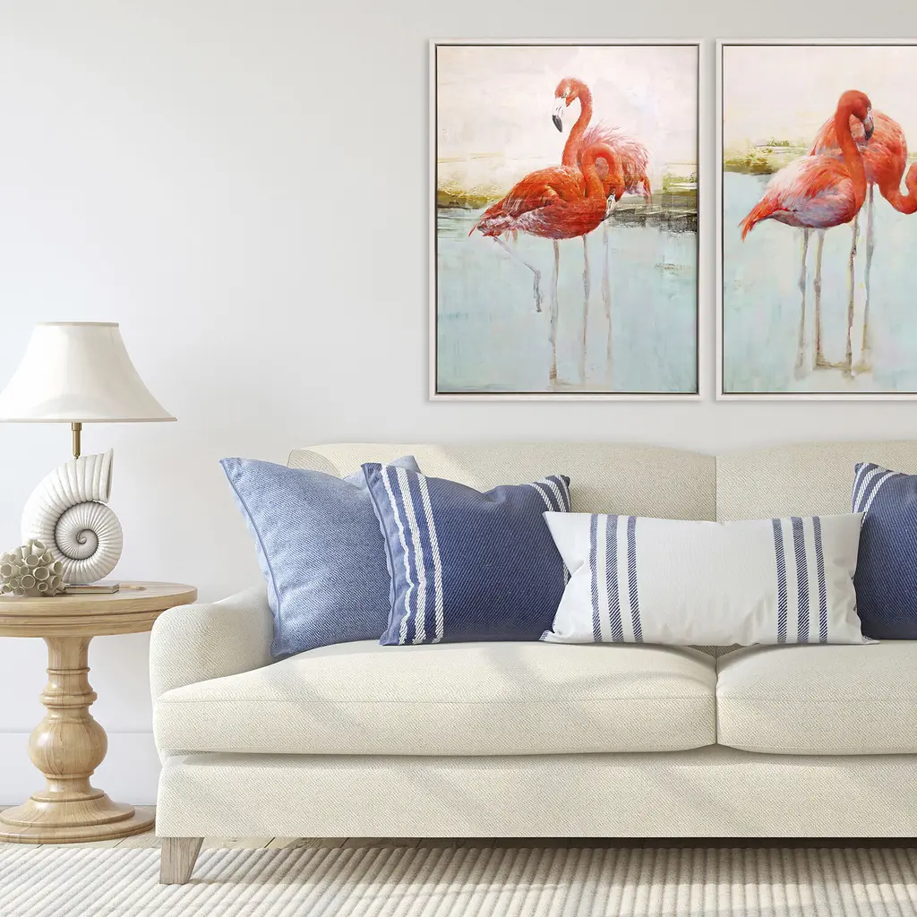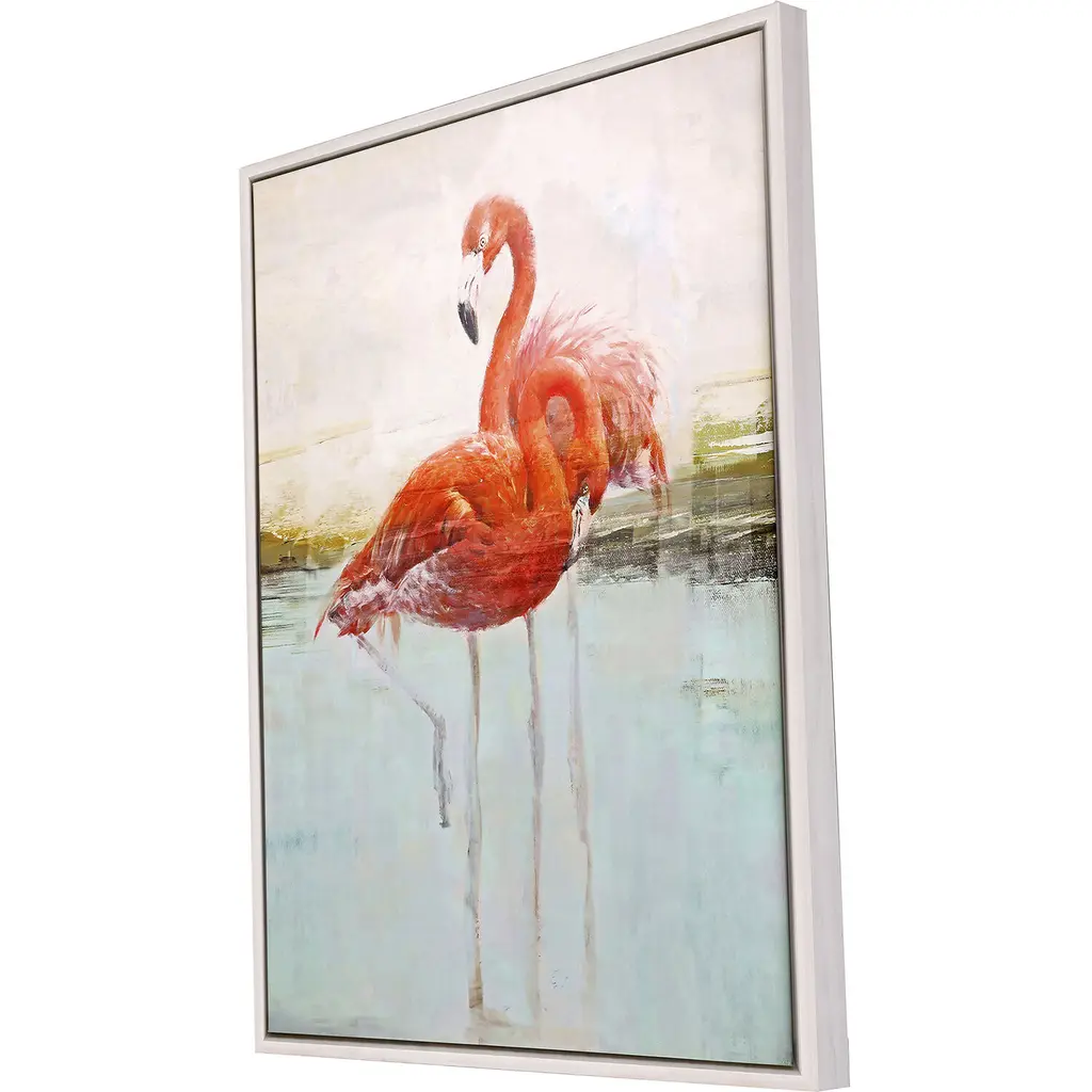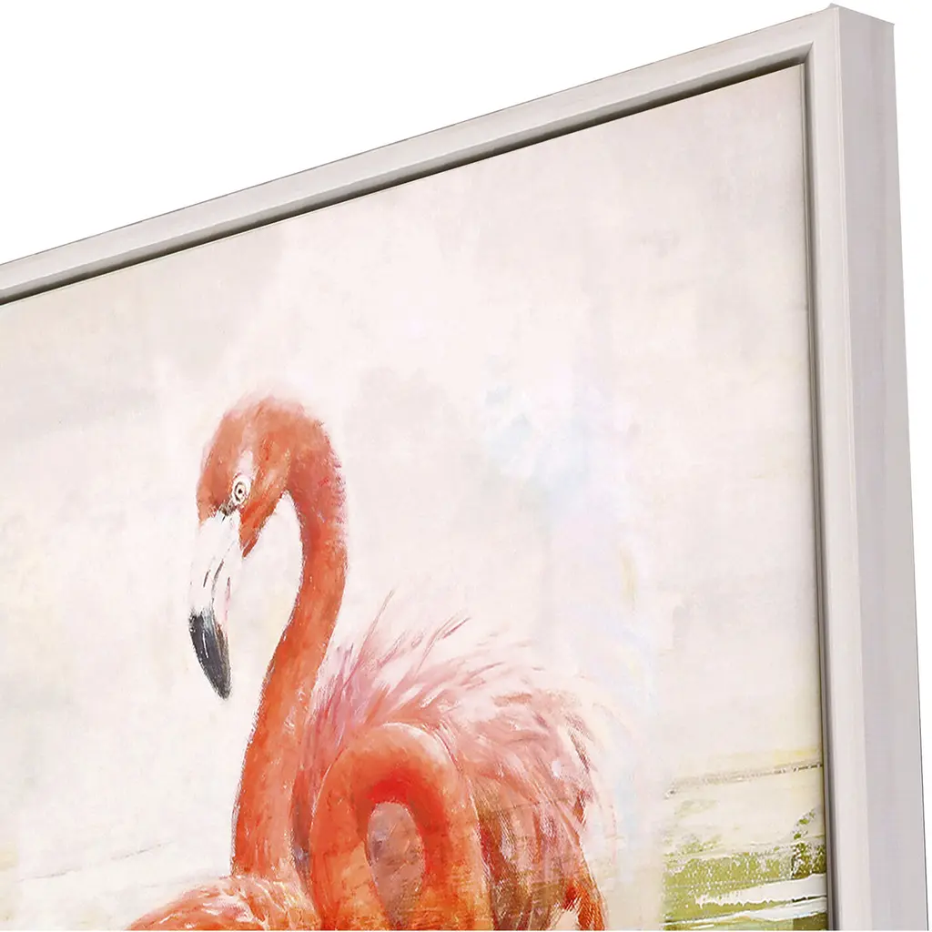 Majestic flamingos are a standout in striking shades of pink. Canvas is mounted in a whitewash wood floater frame.
