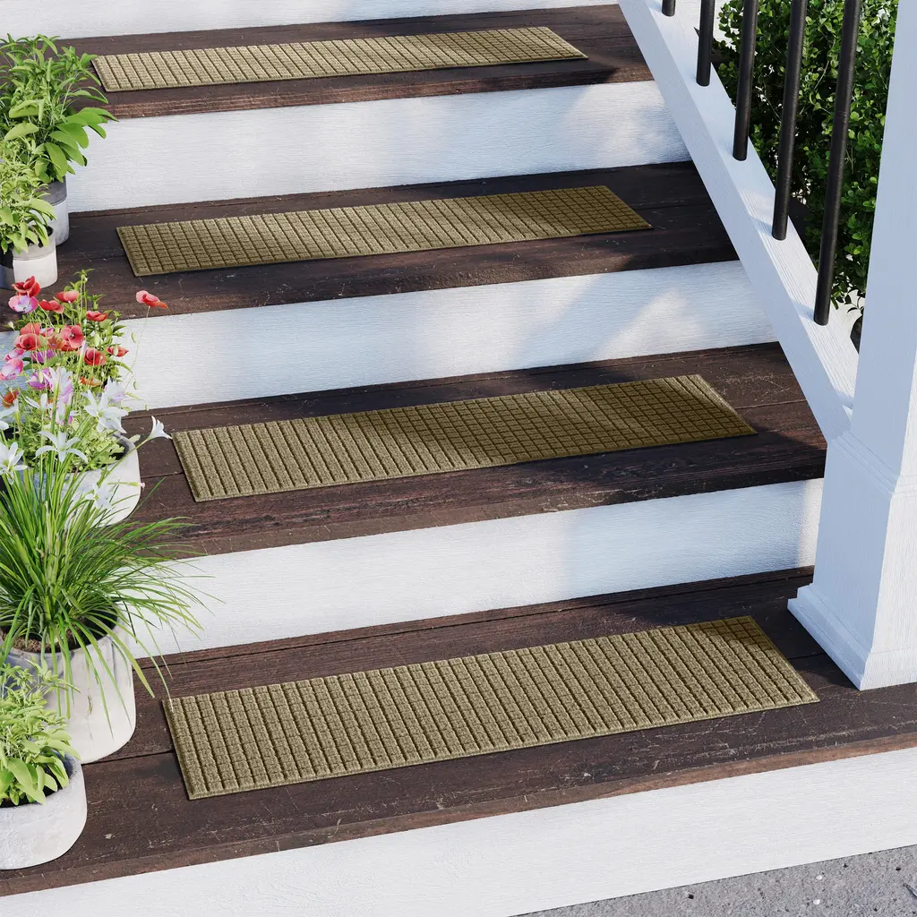 Increase traction on any staircase in your home with our Waffle Stair Treads. This set of four treads helps to provide serious grip and traction on your stairs, indoors our outside. The waffle design looks amazing, adding elements of color and texture to a surface that is often overlooked. Rubber backed treads are incredibly easy to install and are made with industrial grade materials, designed to resist stains, rotting, mold and mildew. Proudly built in the USA, these treads are resistant to heat, rain, sleet and snow, making them ideal for decks, patios, porch steps and more. Build with spills in mind, designed to keep up to 1 gallon of water off of your floors!
