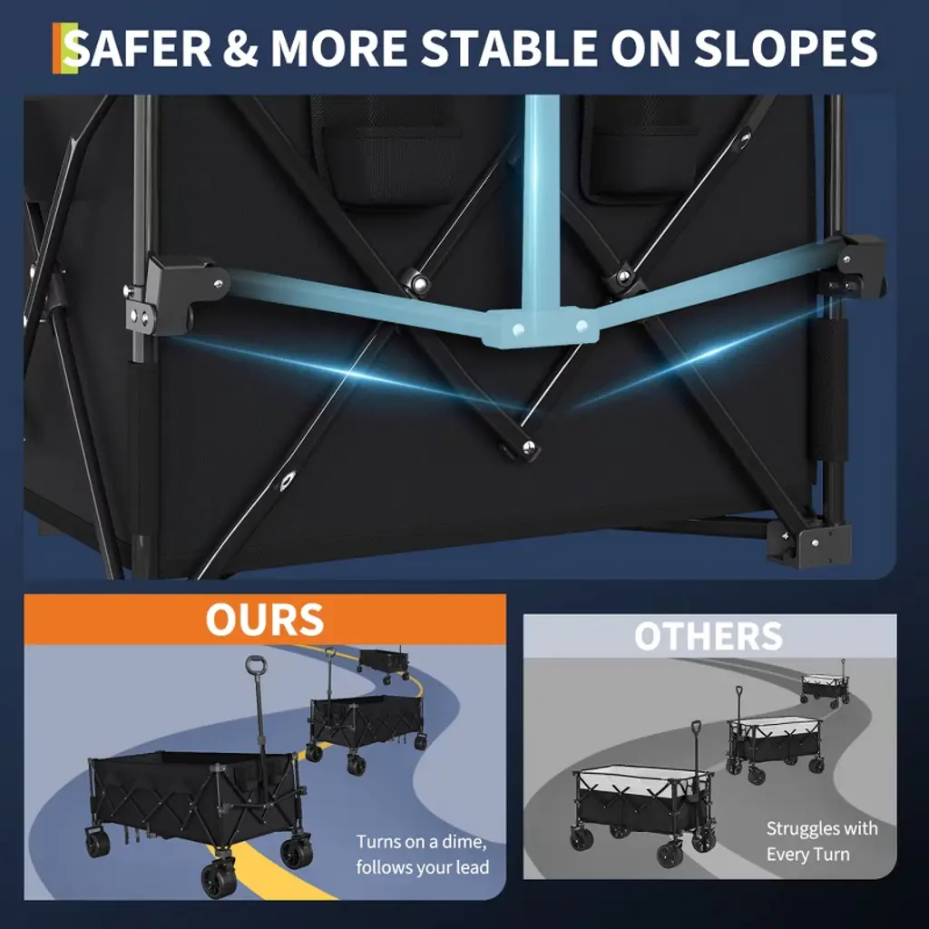 This Wagon Cart Foldable offers a versatile storage solution with its innovative liftable dual-layer design, allowing users to expand the capacity up to 360L when needed. Whether for groceries, beach trips, or camping supplies, the adjustable structure ensures ample space while maintaining a compact form when collapsed. The reinforced telescoping frame, constructed from high-carbon steel, combines durability with a lightweight build, effortlessly supporting substantial loads.