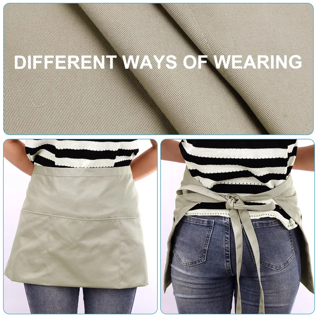 A waist apron is a type of garment that is worn around the waist to protect clothing from spills and other messes. It typically covers the lower half of the body, extending from the waist down to the thighs or knees, can be used for various purposes such as waitress, hotel, restaurant, home, kitchen, cleaning, oil, cooking, baking, craft, etc., providing you with neat clothes when working. Specification:Material: Polyester 80% + Cotton 20%Size: 32 x 58.5cm/12.6 x 23.1 Inch (L*W)Strap Size: 81cm/31.89 Inch (L*W)Packing List: 2 x Waist Apron with PocketsAdvantage:Our half apron with pockets are design with large capacity pocket for you to store tools, book, waiter book, etc. Made of sturdy material ensures longevity and protects against spills and splashes, keeping you clean and professional throughout your shift. Lightweight fabric ensures comfortable wear. With adjustable strap design, one size fits most.Instruction:Slip the short apron with pockets over your body and adjust the straps at the back to ensure a comfortable fit.Note:Avoid exposing the apron to excessive heat or fire to prevent damage.