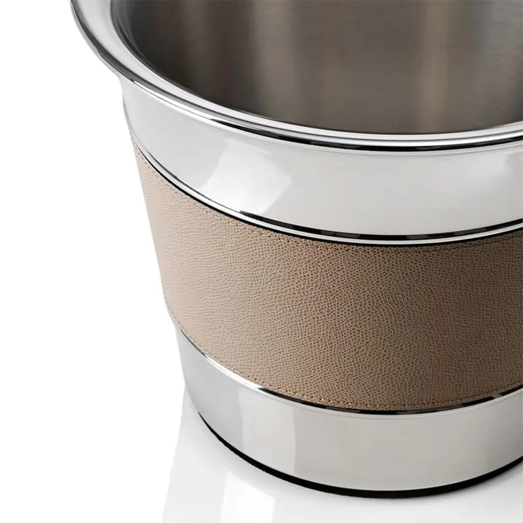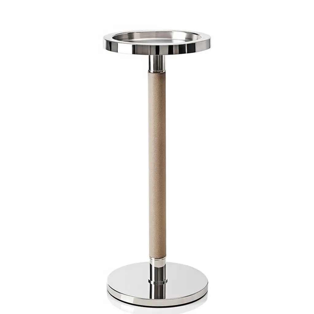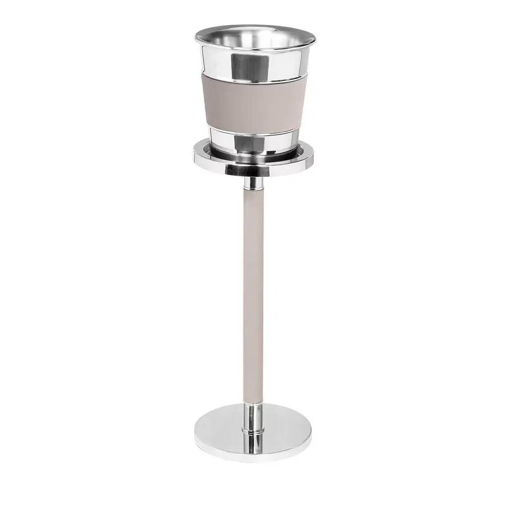 Champagne cooler waiter beige on stand, for 2-3 bottles,Including a polished stainless steel stand covered with beige genuine Leather and a champagne cooler bucket in stainless steel, inside in brushed Finish and outside in polished finish, covered with beige genuine leather.Stand dimensions: Ø 25 x H 62cm.Champagne Bucket: Ø 29,5 x H 24cm.