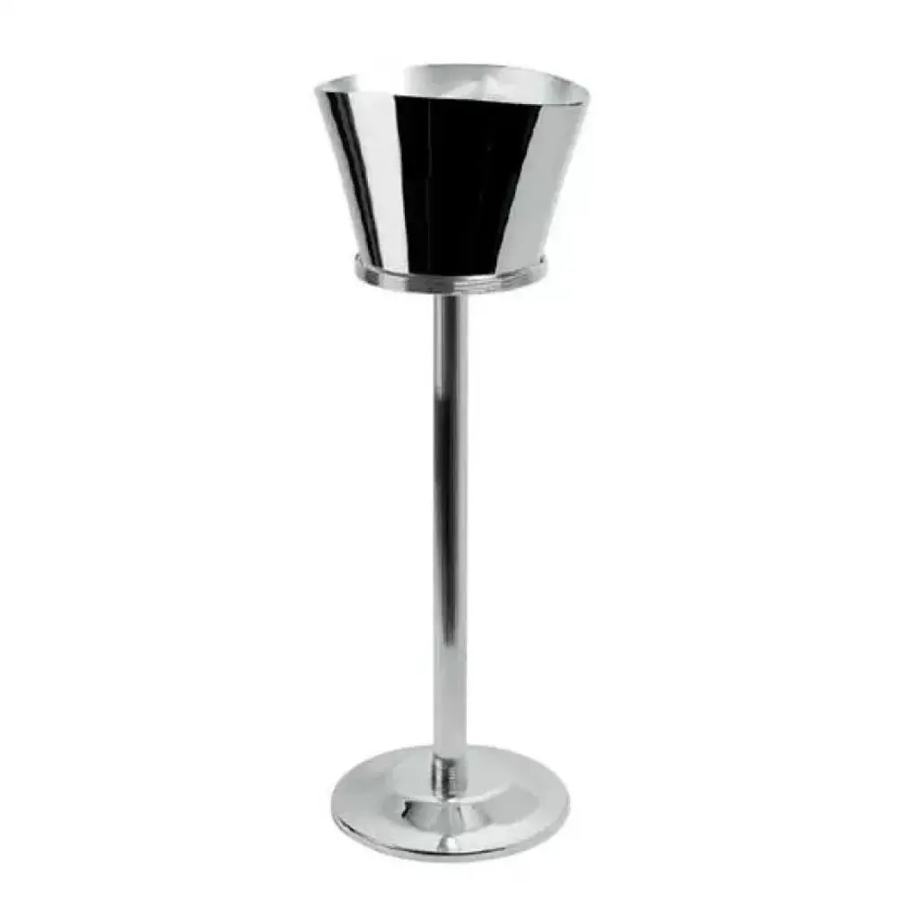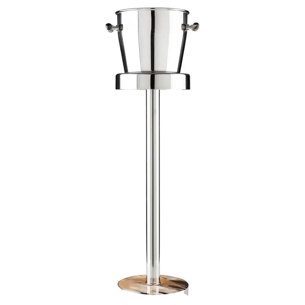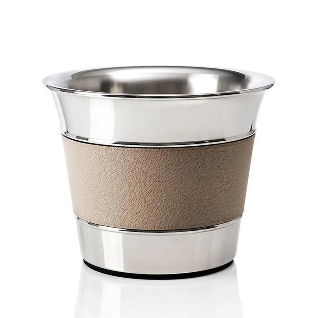 Champagne cooler waiter beige on stand, for 2-3 bottles,Including a polished stainless steel stand covered with beige genuine Leather and a champagne cooler bucket in stainless steel, inside in brushed Finish and outside in polished finish, covered with beige genuine leather.Stand dimensions: Ø 25 x H 62cm.Champagne Bucket: Ø 29,5 x H 24cm.