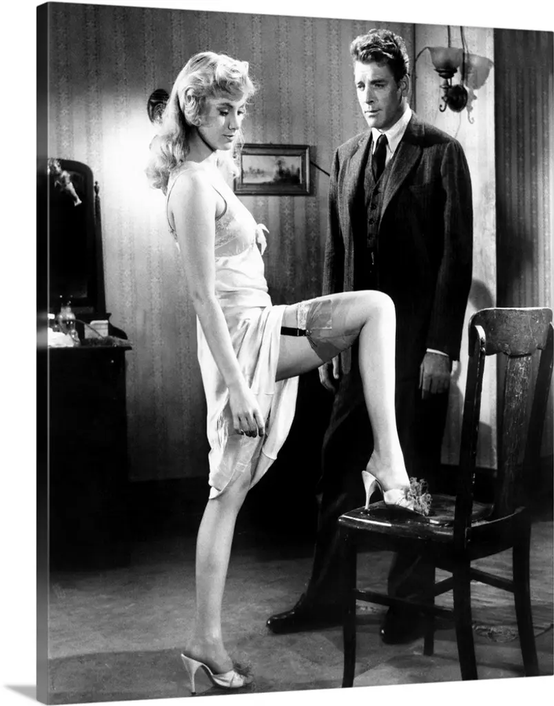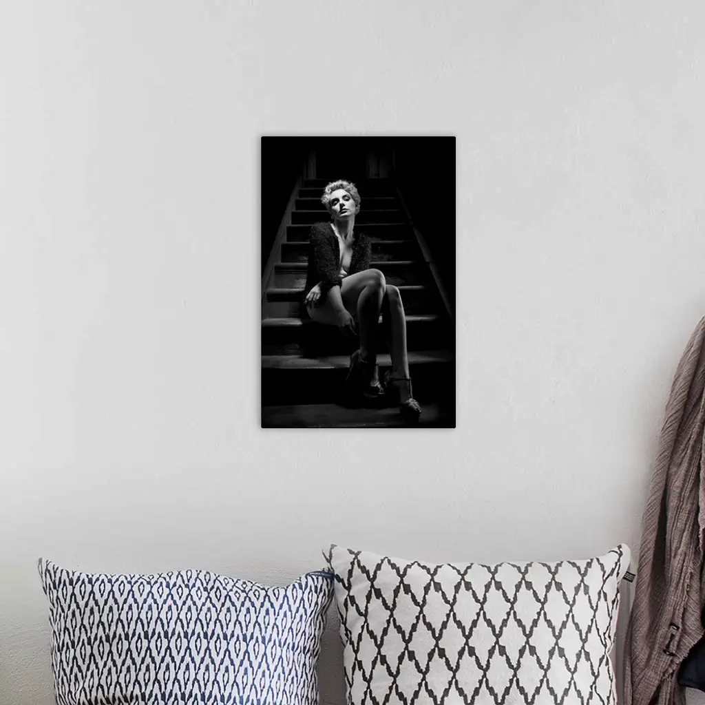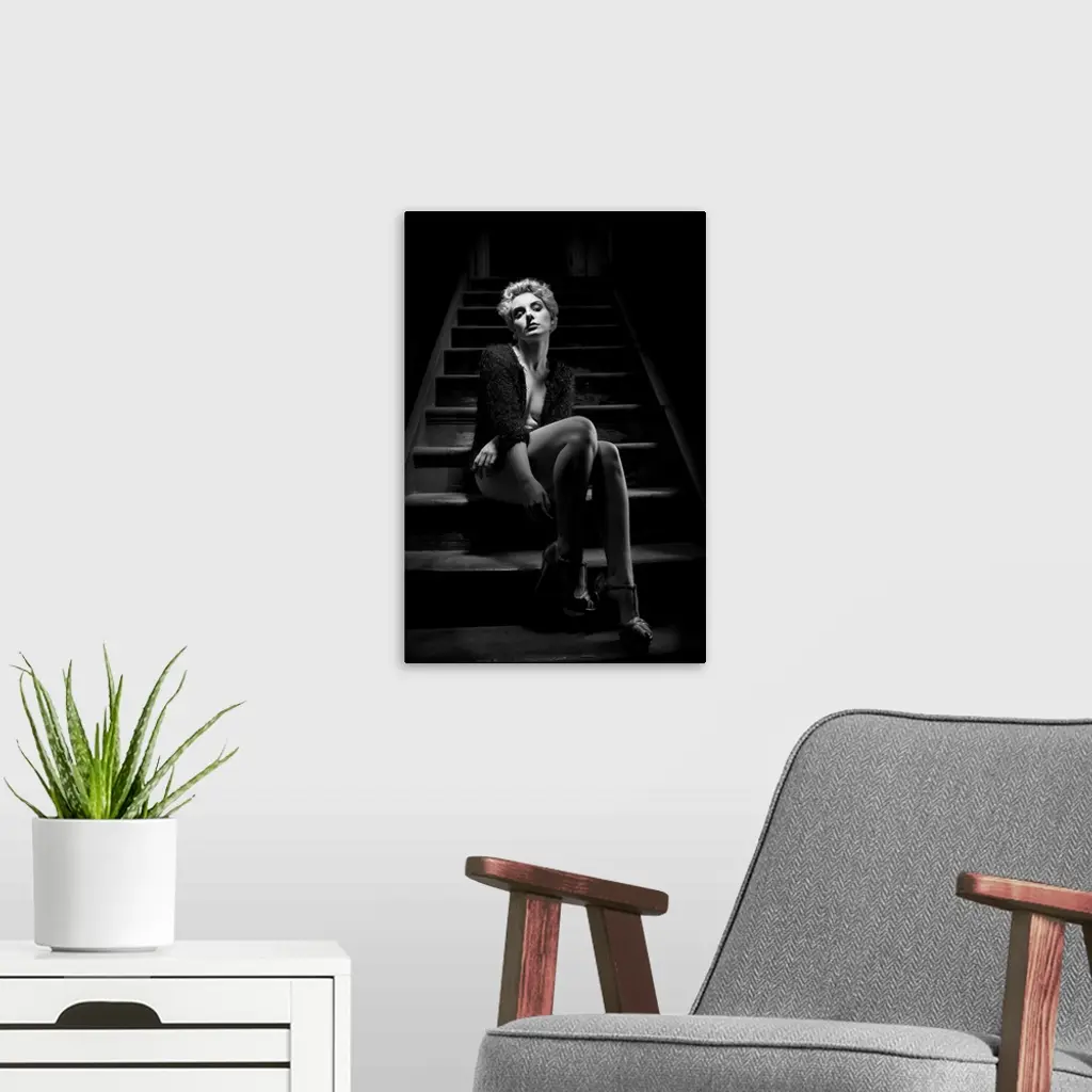 A portrait of beautiful woman in lingerie sitting on a steps of a staircase.