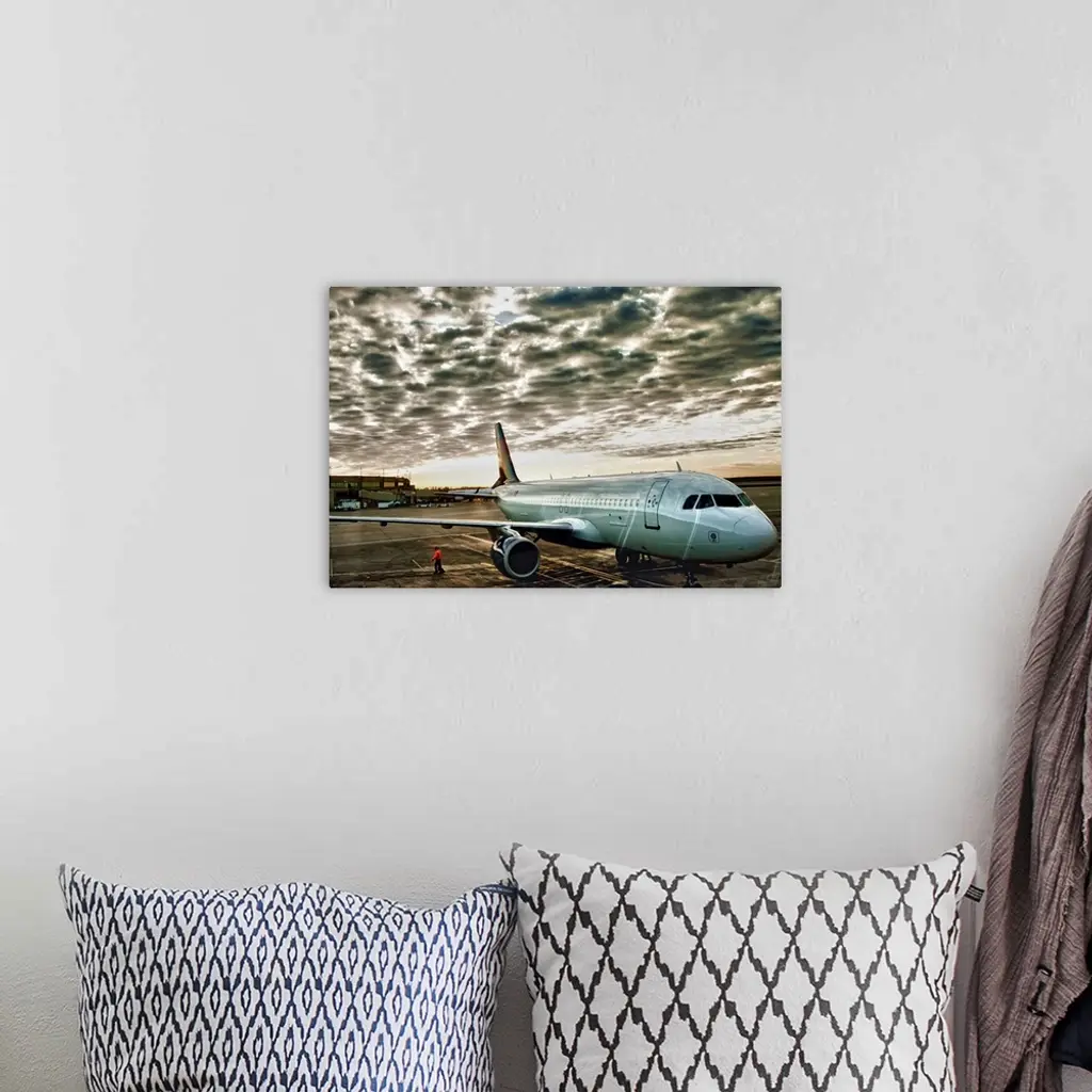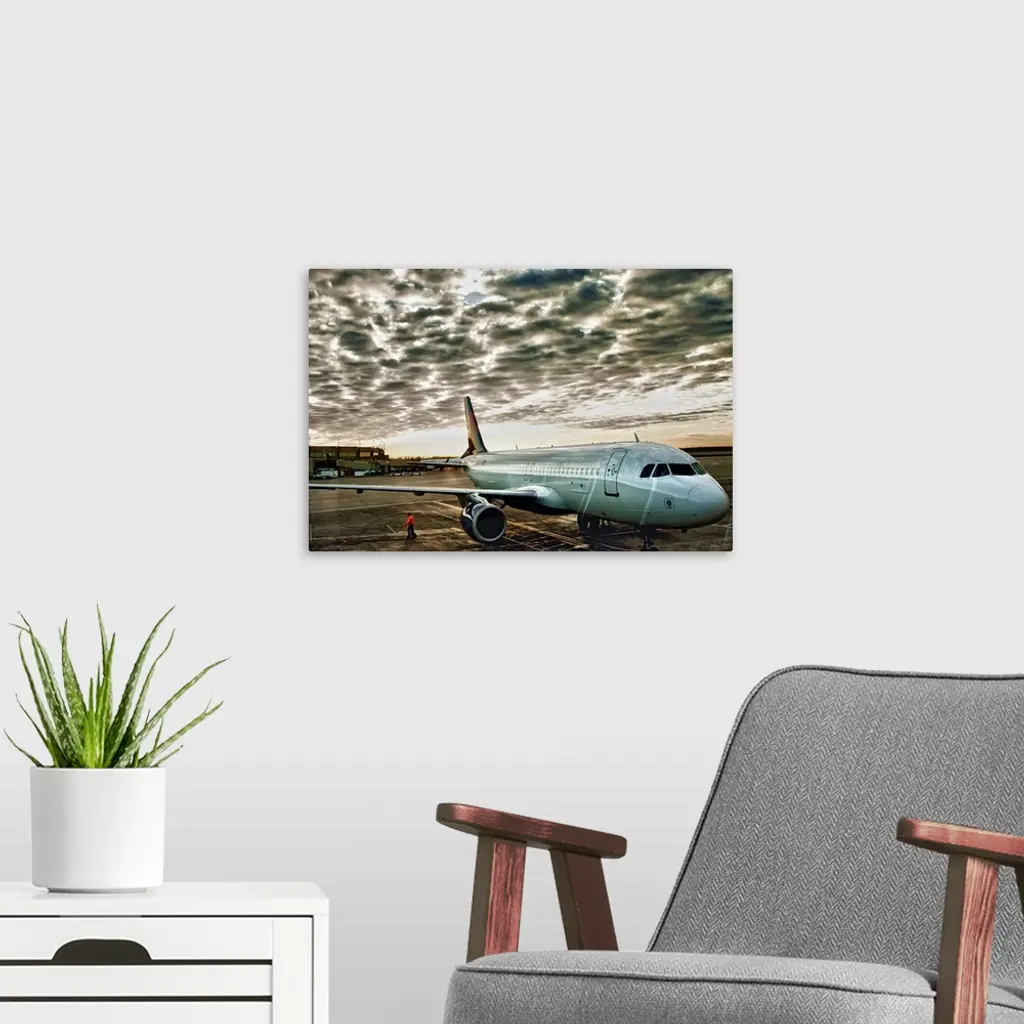 Airport daybreak shot of plane waiting to depart as storm clouds pass overhead.