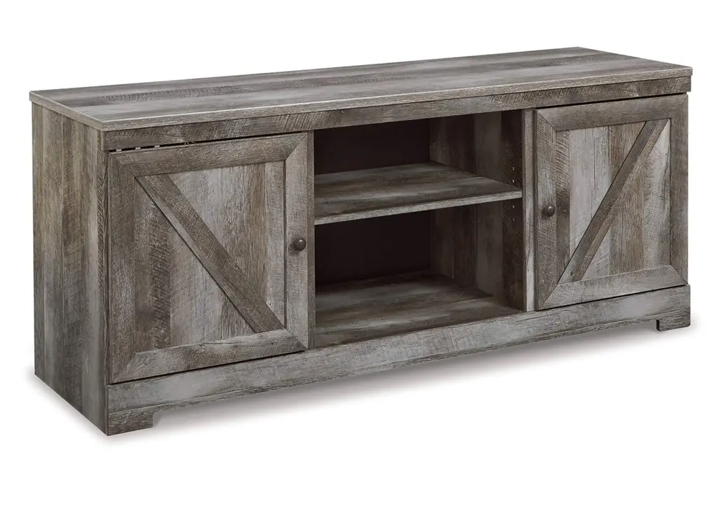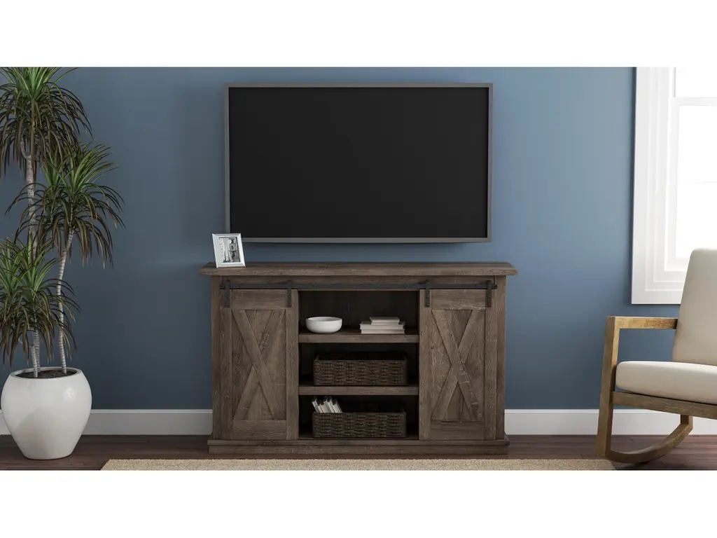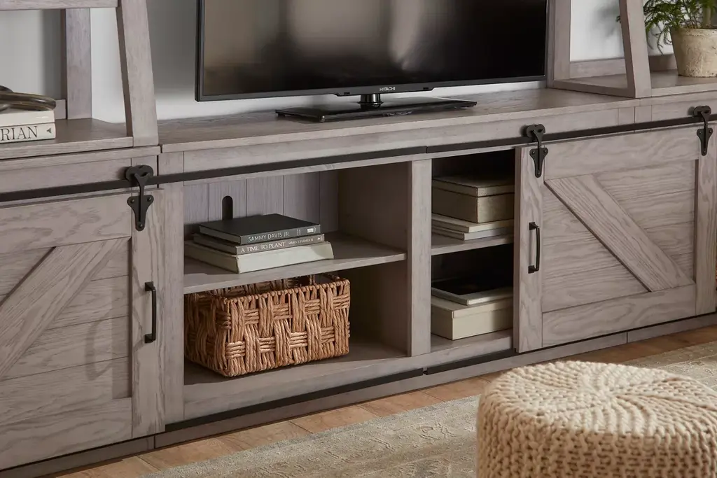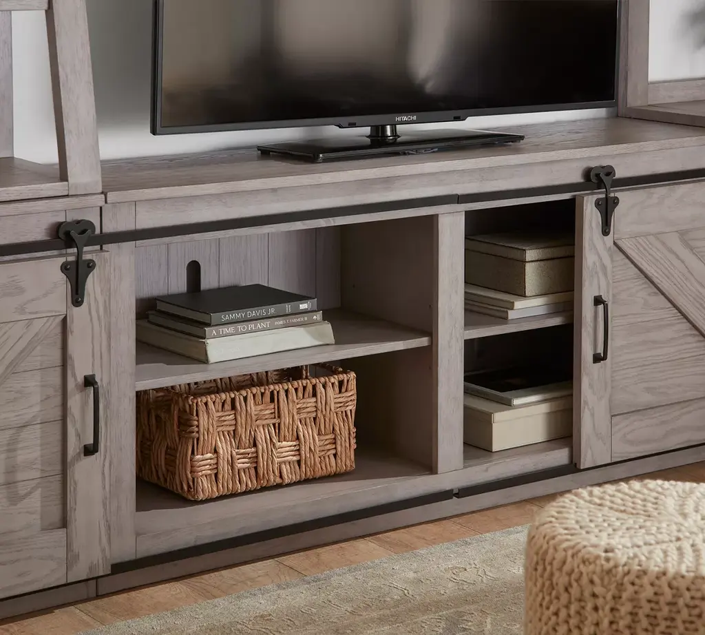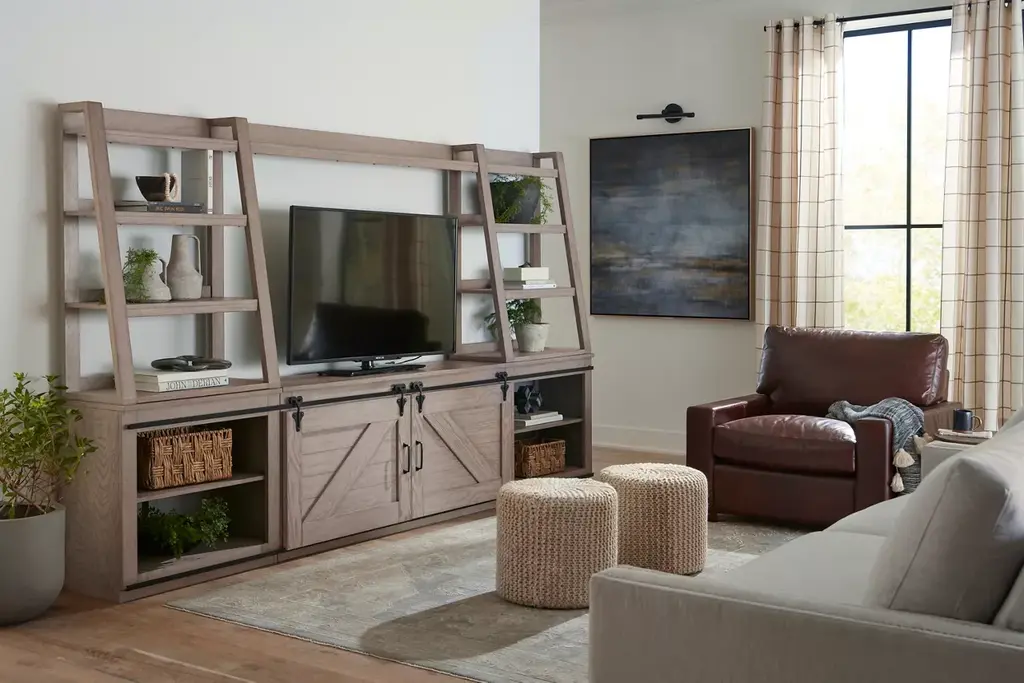 With its unique leaning pier design and abundance of shelf and storage space, our expertly crafted Wakefield entertainment wall is sure to be a conversation starter. Featuring both fixed and adjustable shelves, cord management and sliding barn doors, you can keep your entertainment space organized while showing off your personal style.