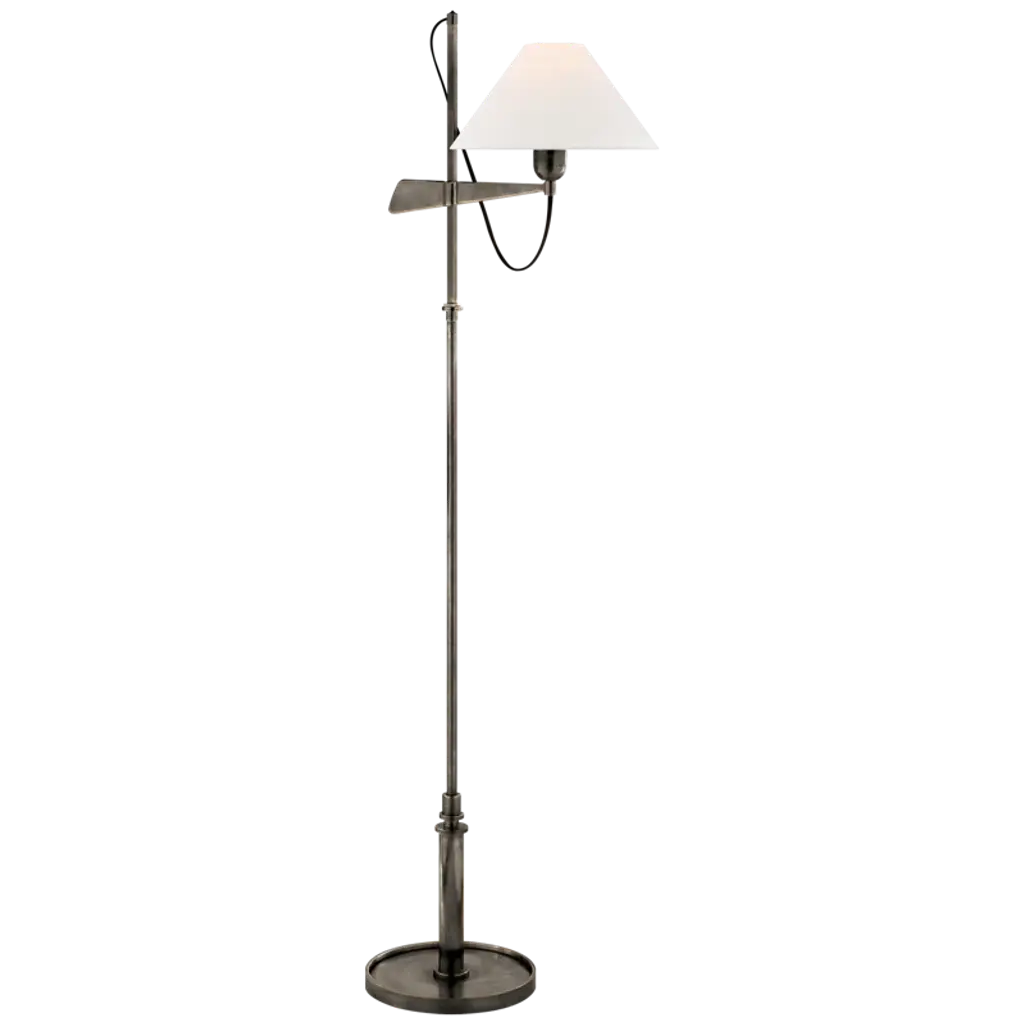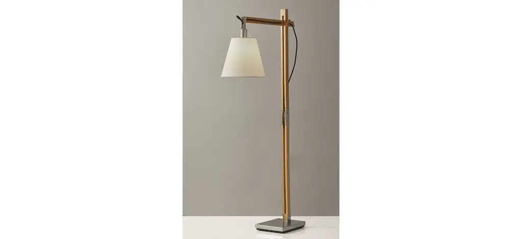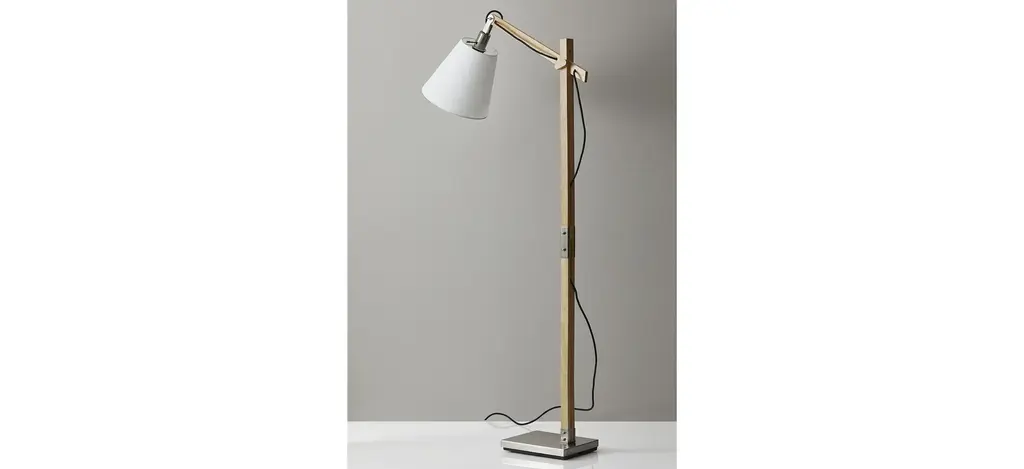 Introduce this Walden floor lamp into rustic, contemporary or eclectic settings. Wooden joints adjust the balance arm to change the height and angle of the shade. The black fabric cord threads through the square wood post body and drapes out the back. The satin steel base and accents enhance an industrial style, while a clean off-white fabric shade softens the look. An three-way rotary switch is located on the socket. The 3-way rotary socket switch will only work with a 3-way light bulb, otherwise this lamp will function with simple on/off switch at its highest setting. This lamp is smart outlet compatible. Bulb is not included.