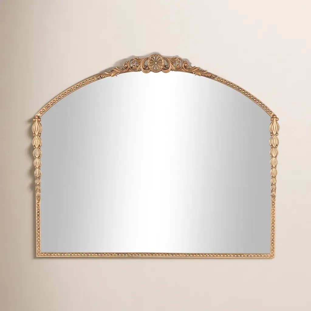 Standing tall, adorned with an elegant shell emblem, the Waldorf Mirror gleams with a gold leaf finish over a metal frame. Designed by Bradshaw Orrell.