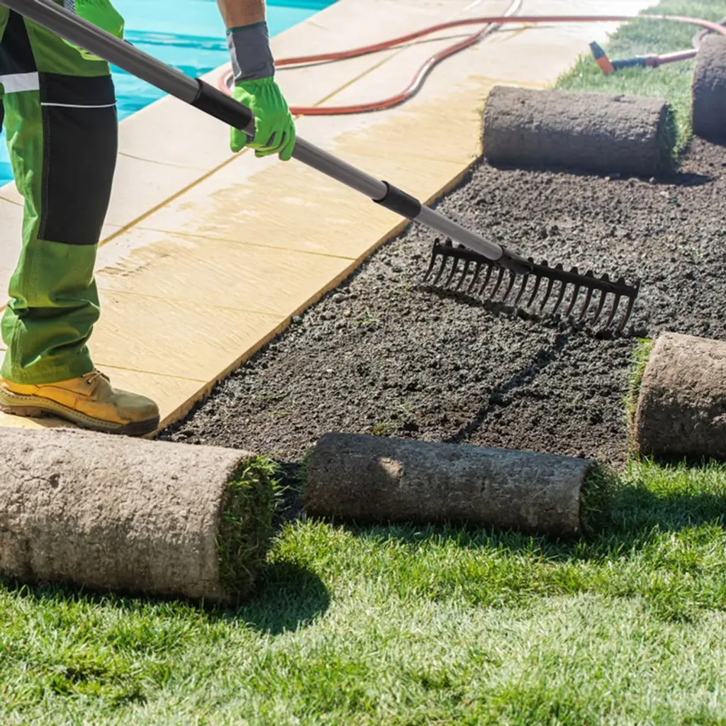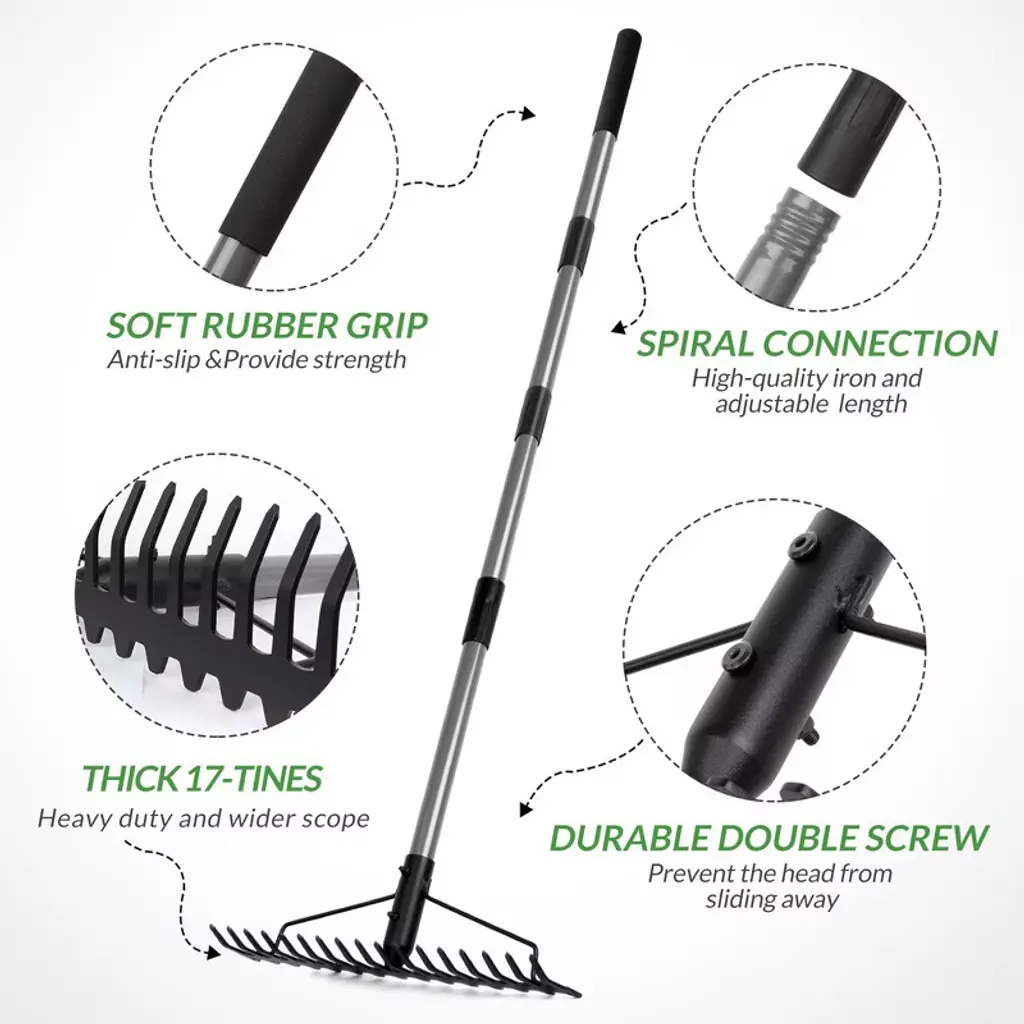The Walensee Bow Rake is made from premium durable stainless steel with anti-rust coating for long-term use. It is 63 inches long, 17 inches wide and 3.7 inches deep. The spiral connection is made of high quality iron and provide adjustable length. The 2.5-inch long tines and 17-inch wide head make it ideal for leveling. Thick 17-tines, heavy duty and for wider scope, covering more ground, and reaching deeper into the soil without damaging plant roots. Soft rubber grip is anti-slip and can provide strength. This versatile rake is perfect for laying sod, loosening soil, pulling dead grass, spreading mulch, leveling areas before planting and gathering leaves. The adjustable handle is made from multi-section poles, allowing you to customize the length for different users, including seniors and kids. Durable double screws prevent the head from sliding away. Its detachable design makes storage easy and saves space.