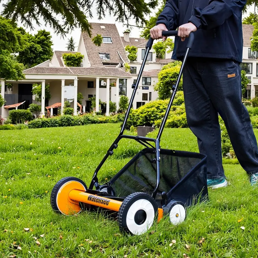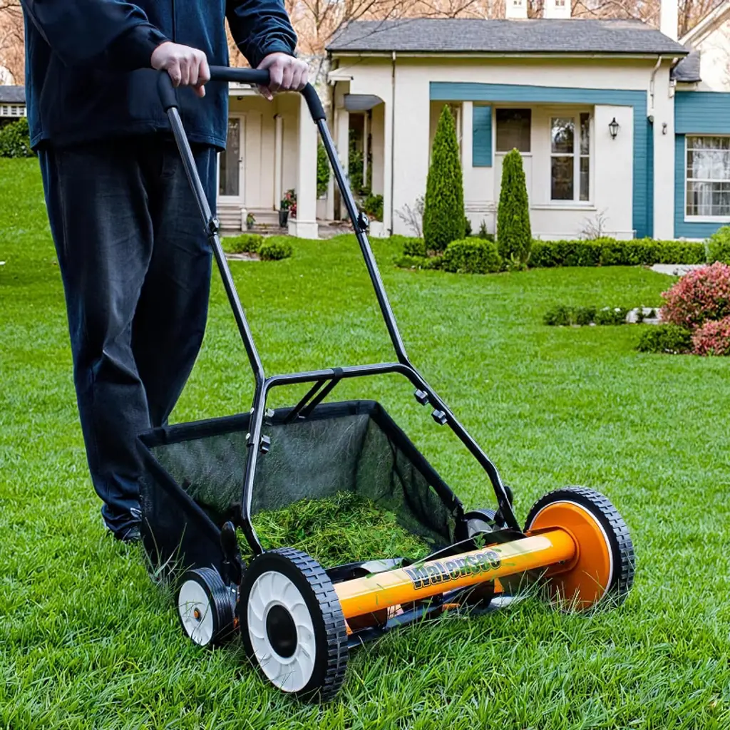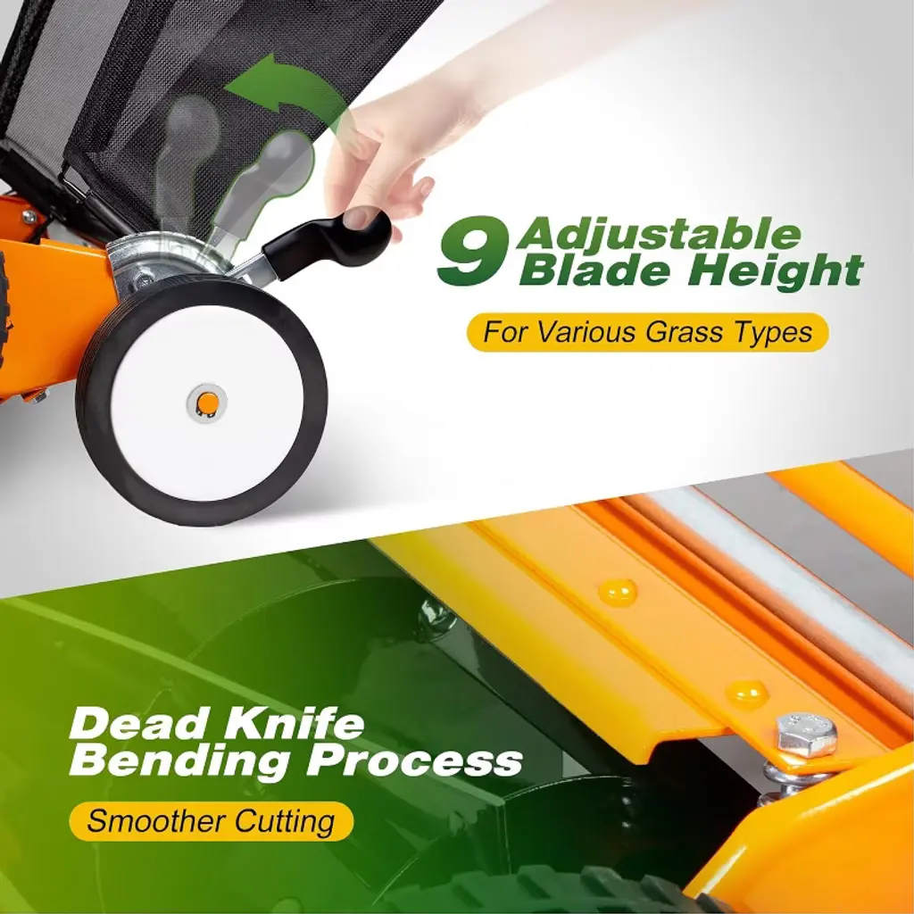 This 5-blade push reel mower delivers precise scissor-cut trimming for a healthier lawn. Features 4-height adjustment (0.5-1.5 inches), durable alloy steel blades, and a removable grass bag. Eco-friendly, quiet operation with 8.5-inch self-lubricating wheels for smooth maneuvering.