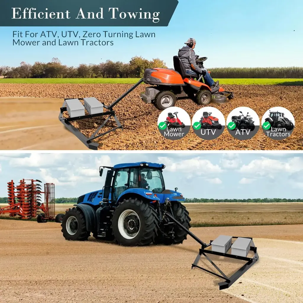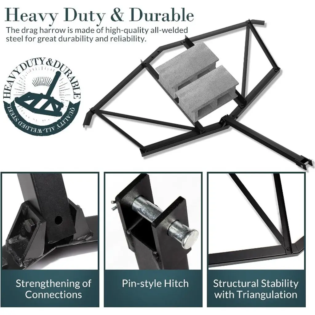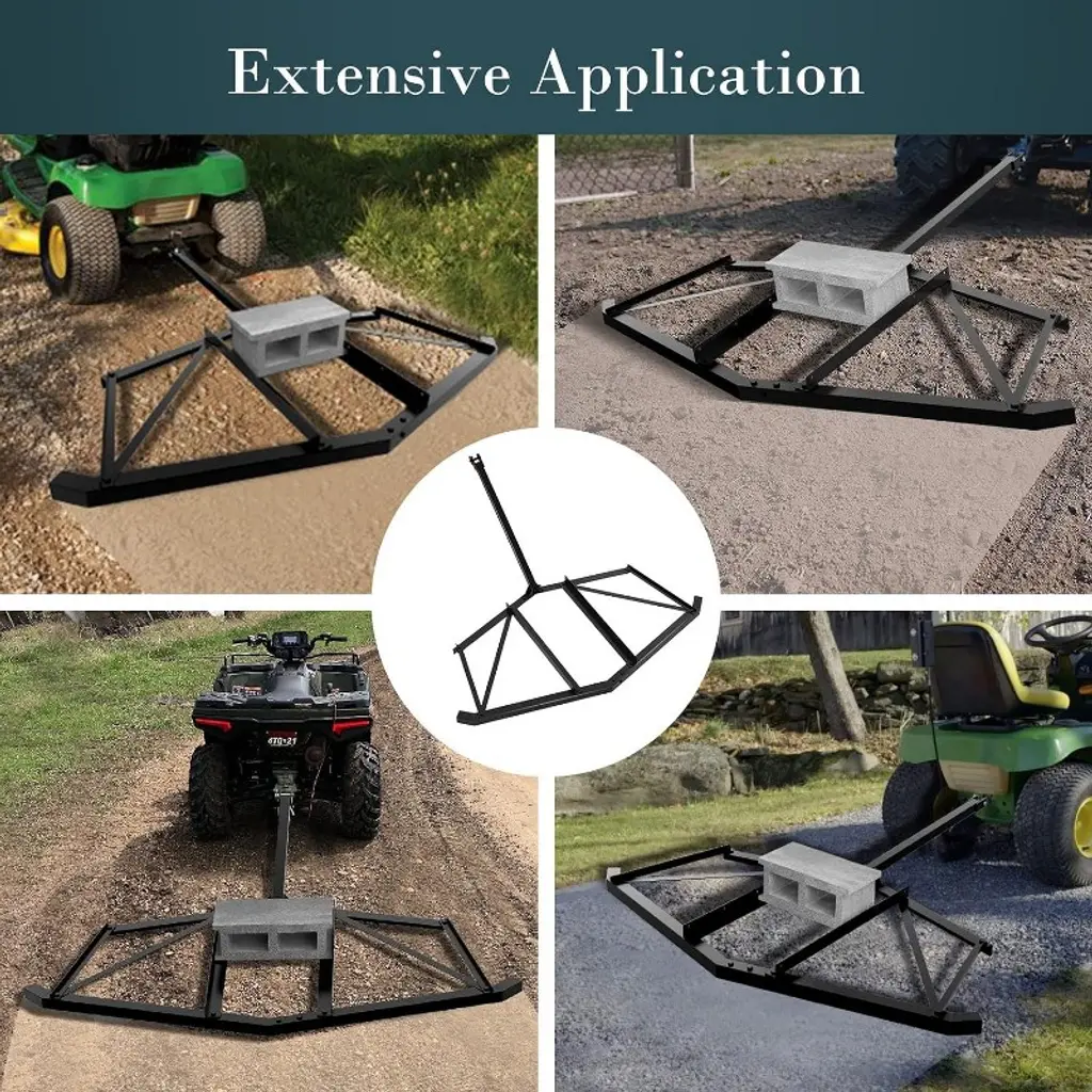 The Walensee Driveway Drag is a heavy-duty 66¡± steel grader with a powder-coated, rust-proof finish for lasting durability. It features a pin-style hitch and 35¡± connecting rod for easy towing behind ATVs, UTVs, and tractors. The lightweight design minimizes vehicle strain while effectively leveling driveways, yards, and fields. Its center bar allows for adjustable weight with bricks to achieve deeper or finer grading. Ideal for preparing land for planting or maintenance, this drag harrow combines efficiency with ease of use.