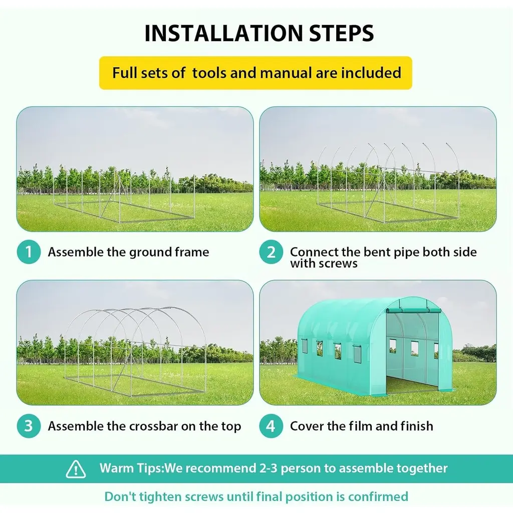 Spacious Walk-In Design: Measuring 15 x 7 x 7 ft, this walk-in greenhouse offers ample space for growing a diverse range of plants. The spacious interior allows for easy access and maintenance of your plants, and provides room for multiple plant shelves, catering to both home gardeners and commercial growers. Upgraded Heavy-Duty Galvanized Frame: Constructed with reinforced 0.8" diameter galvanized pipes (0.02" wall thickness), this tunnel greenhouse boasts exceptional strength and stability. Enhanced stability features include reinforced rust-proof poles, added diagonal bars, L-shaped stakes, and tie-down ropes, ensuring your plants remain protected from harsh weather conditions. Thick High-Density PE Cover: Equipped with a premium 140g/m² PE plastic cover, this high tunnel greenhouse is waterproof, sun-resistant, and insulating, fostering optimal plant growth. The double-stitched seams and reinforced window seams provide extra durability against tearing. The extended edges can be weighted down with stones or buried in soil, enhancing insulation, airtightness, and humidity control for a stable growing environment. Adequate Ventilation Design: This hoop house greenhouse features 8 strategically placed mesh windows and 2 large roll-up zipper doors to promote excellent airflow. The innovative mesh net design prevents small pests from entering while ensuring proper ventilation, creating a healthy environment for your plants to thrive. Versatile Use for Multiple Settings: Perfect for home gardens, farms, and small commercial operations, this tunnel greenhouse is designed to create an ideal growing environment for various plants. It effectively extends your planting season, enabling you to enjoy gardening year-round, regardless of weather conditions.
