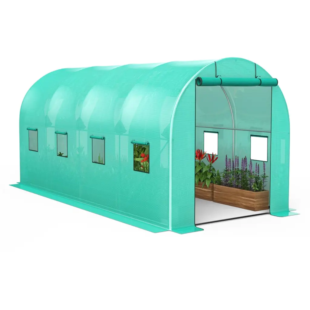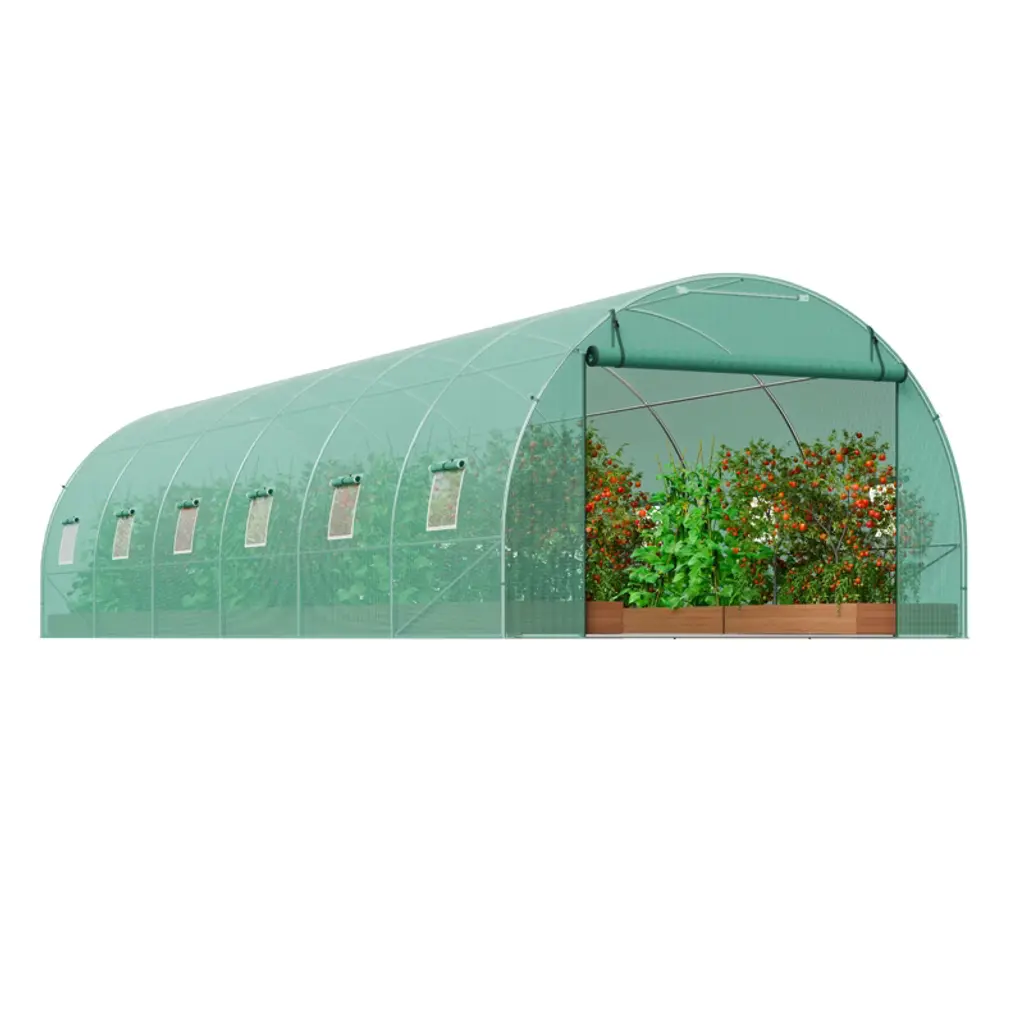 Protect your plants and extend your growing season with this spacious 11.32 x 6.4 x 6.3 ft Walk-In Tunnel Greenhouse. Engineered for durability, it features a reinforced galvanized steel frame with added diagonal bracing, U-shaped ground stakes, and tie-downs for superior stability against wind and rain. The high-density 140g/m² PE cover is UV-resistant, waterproof, and well-insulated, with double-stitched seams to prevent tearing. Its spacious walk-in design allows for easy movement and organization, making it perfect for both backyard gardeners and small-scale commercial growers. Equipped with 6 roll-up mesh windows and a large zippered door, this greenhouse ensures optimal ventilation while keeping pests out. Whether for vegetables, flowers, or seedlings, this all-season hoop house is your reliable growing solution.