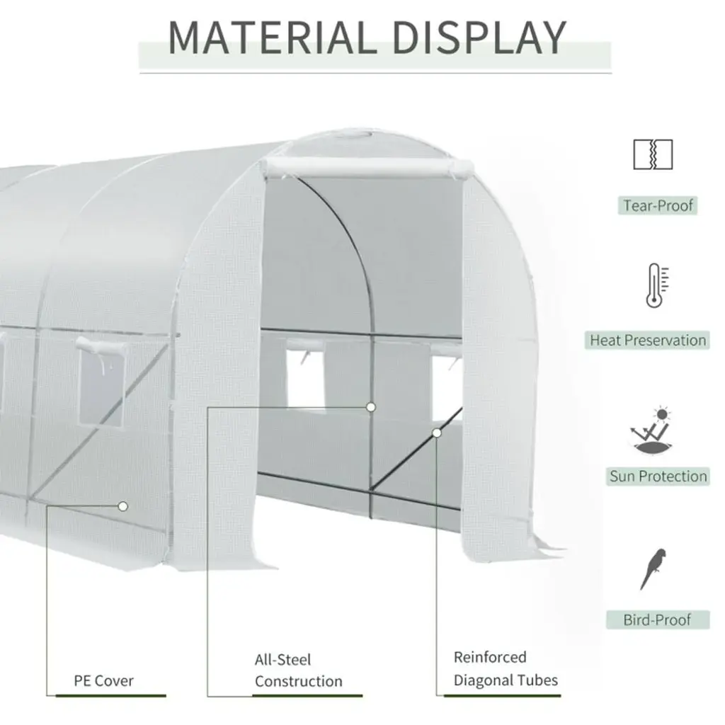 Specification: Key Features: Description:This Walk-In Tunnel Greenhouse provides a spacious and practical solution for year-round gardening, measuring 15' x 7' x 7'. Made from durable galvanized steel and a UV-blocking PE cloth cover, it’s ideal for growing vegetables and flowers. It features six roll-up windows for ventilation and light control, along with a zippered roll-up door for easy access. The greenhouse is designed with a reinforcing grid to prevent tearing and includes four pull ropes and ground stakes for secure installation. Perfect for gardeners looking for a reliable, easy-to-assemble outdoor growing space.