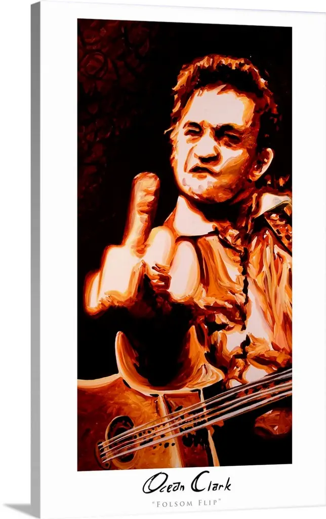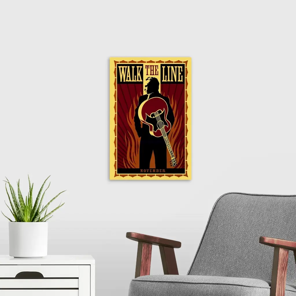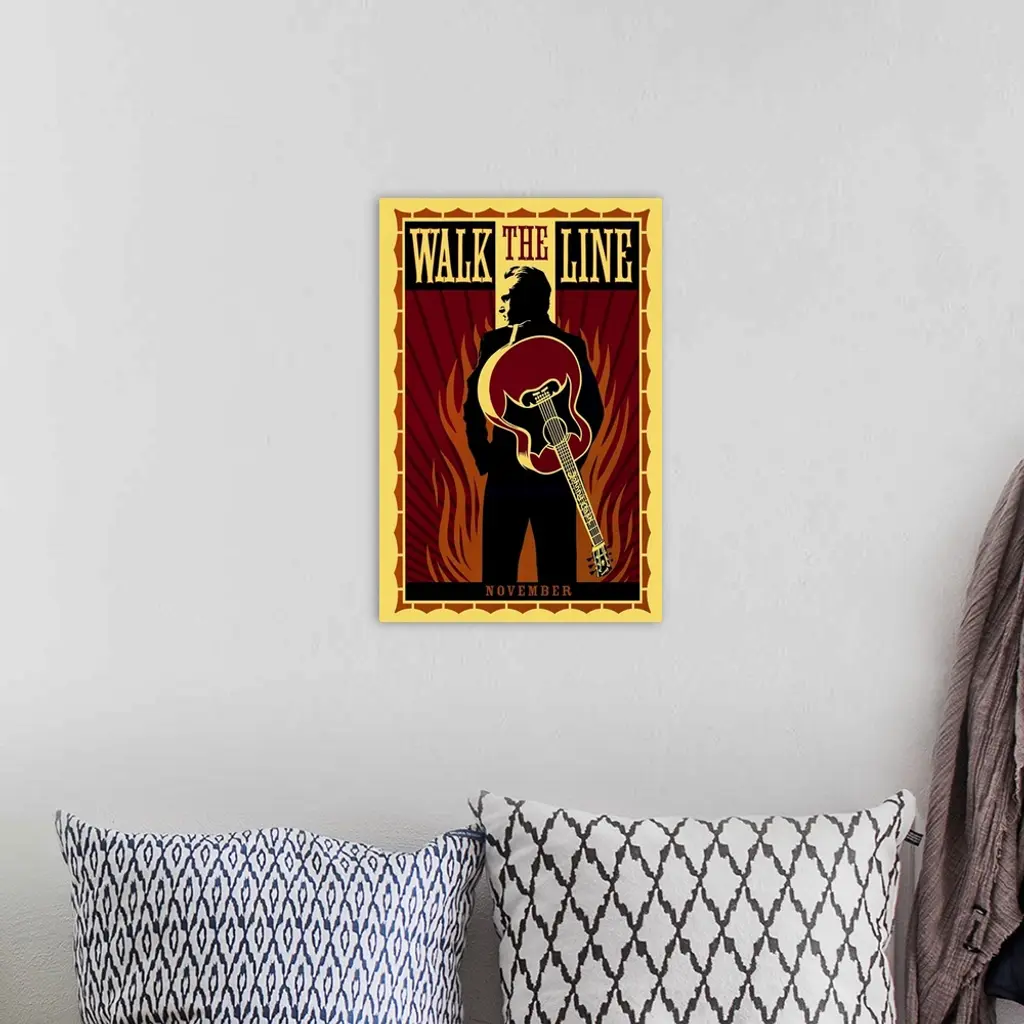 Retro art movie poster for "Walk The Line". It shows Johnny Cash from behind peering over his shoulder with his guitar swung around on his back.