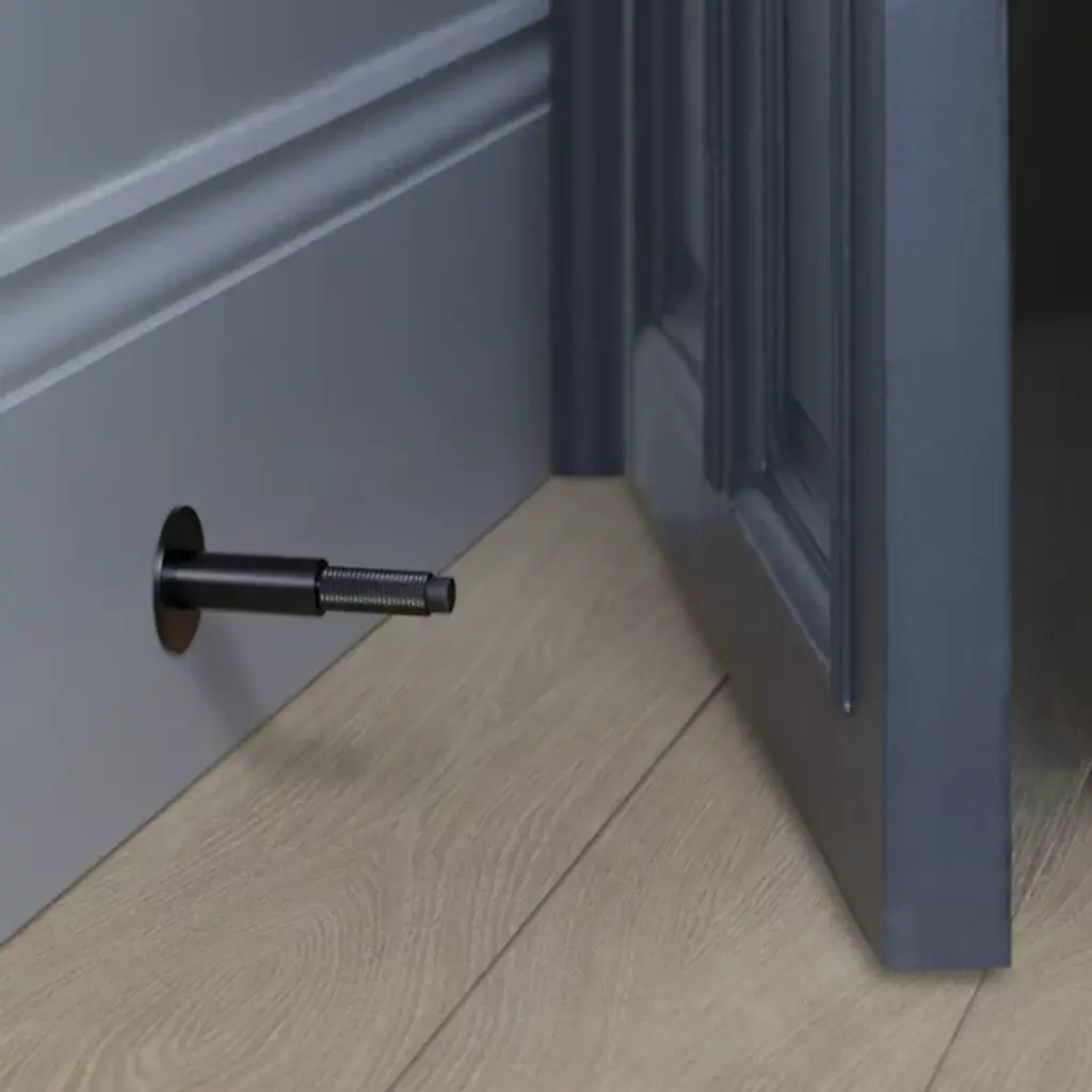 Protect indoor walls and keep your interiors quiet with the Wall Door Stop from Buster + Punch. A solid metal construction that pairs fine transitional accents with robust industrial design extends from a disc wall mount, telescoping out in thinner sections to create a stepped construction and ending in a black rubber buffer with a small B+P logo debossed across its surface. The smaller metal tube is enhanced with a cross-knurl diamond-cut pattern that has become a Buster + Punch signature, adding an element of complex texture to the otherwise direct design.