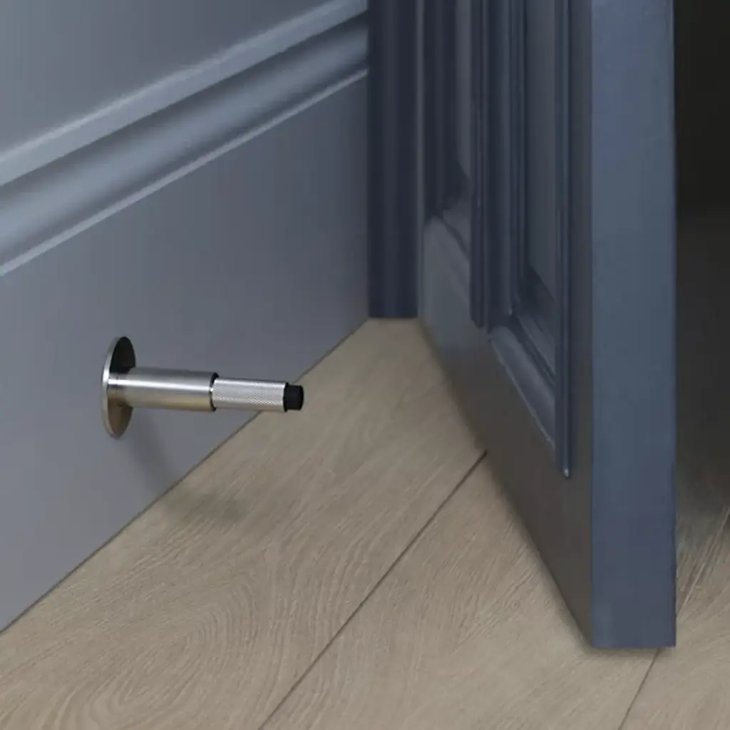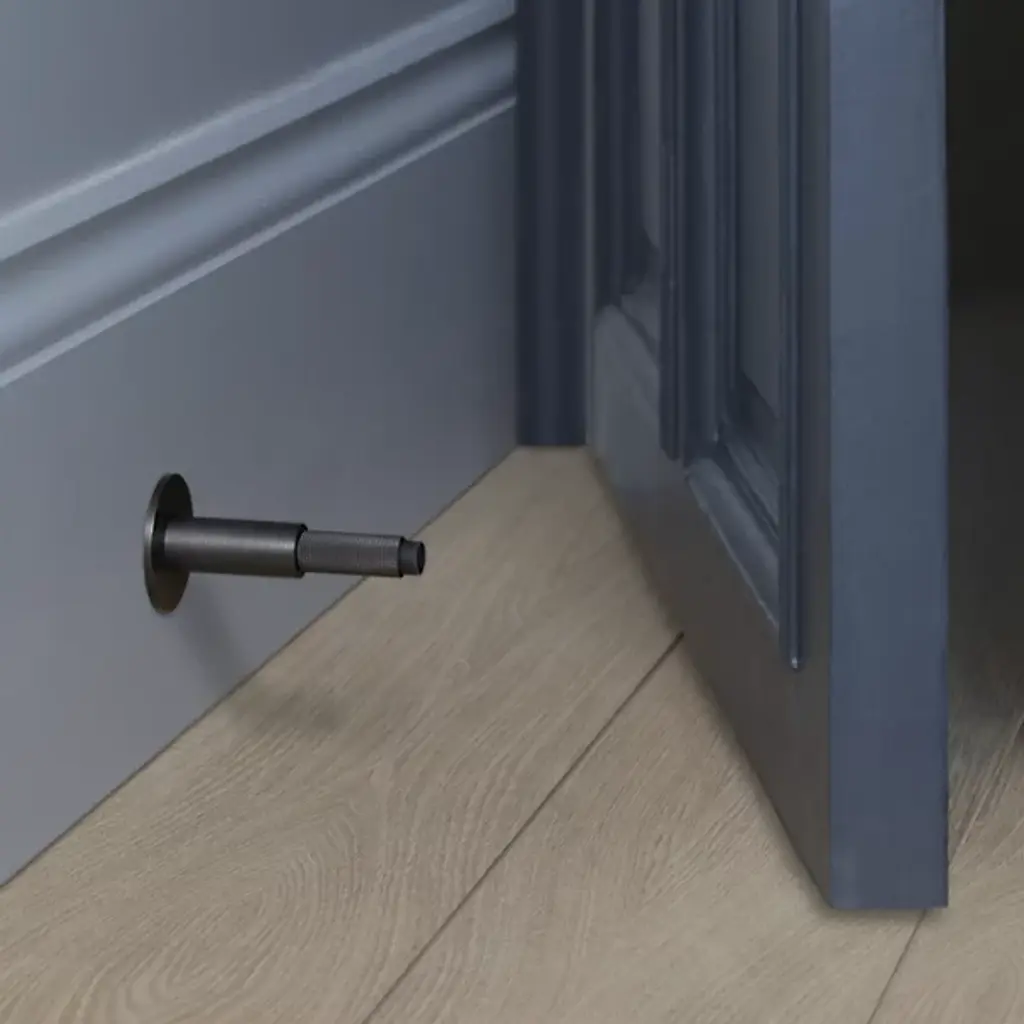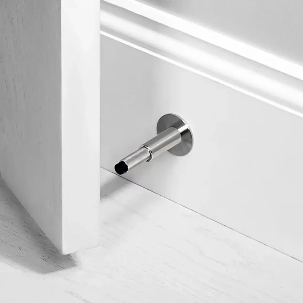 Protect indoor walls and keep your interiors quiet with the Wall Door Stop from Buster + Punch. A solid metal construction that pairs fine transitional accents with robust industrial design extends from a disc wall mount, telescoping out in thinner sections to create a stepped construction and ending in a black rubber buffer with a small B+P logo debossed across its surface. The smaller metal tube is enhanced with a cross-knurl diamond-cut pattern that has become a Buster + Punch signature, adding an element of complex texture to the otherwise direct design.