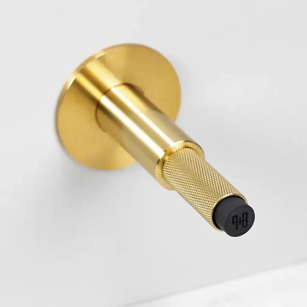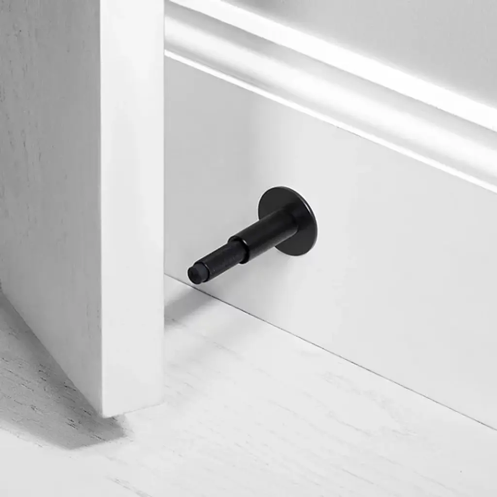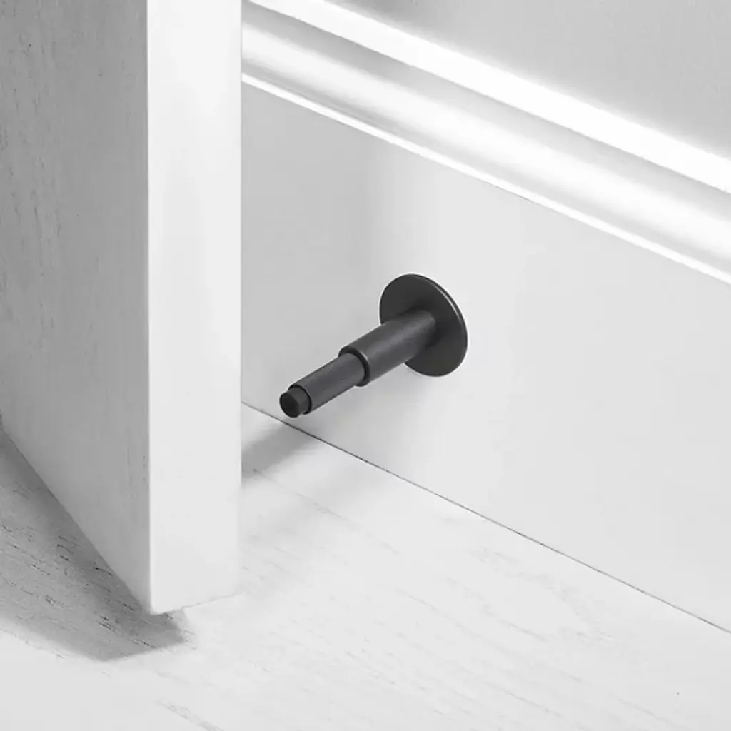 Protect indoor walls and keep your interiors quiet with the Wall Door Stop from Buster + Punch. A solid metal construction that pairs fine transitional accents with robust industrial design extends from a disc wall mount, telescoping out in thinner sections to create a stepped construction and ending in a black rubber buffer with a small B+P logo debossed across its surface. The smaller metal tube is enhanced with a cross-knurl diamond-cut pattern that has become a Buster + Punch signature, adding an element of complex texture to the otherwise direct design.