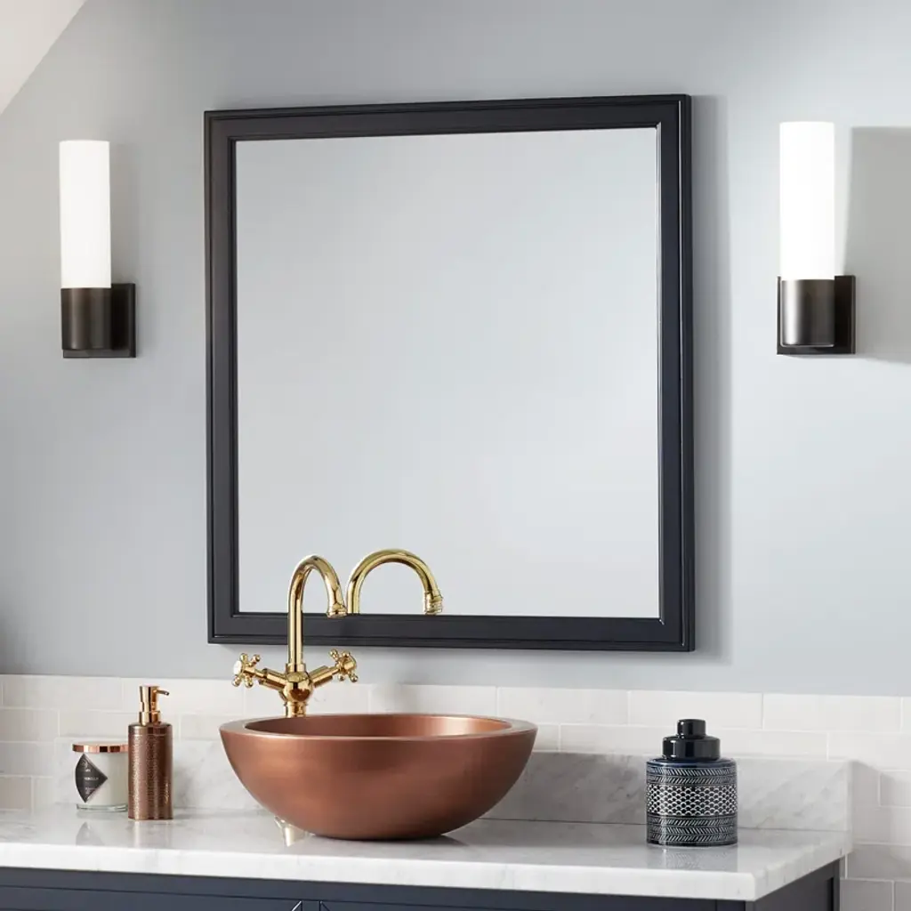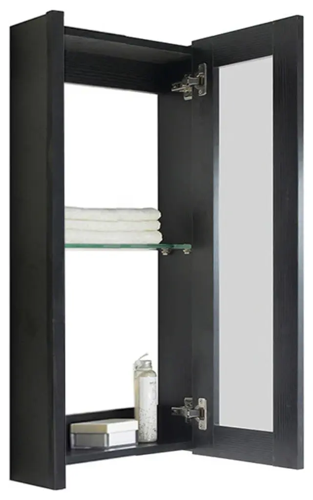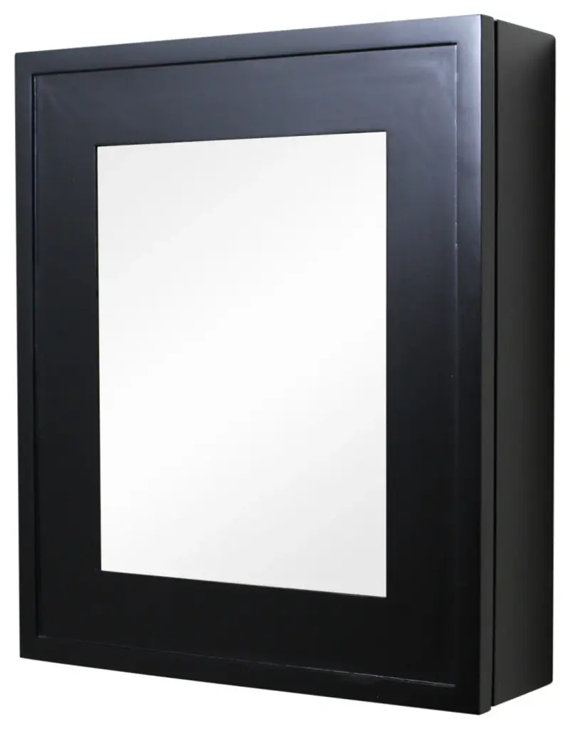 The Black Wall Mount Mirrored Medicine Cabinet features our raised edge profile door and is painted a rich, deep black, giving this a modern look. Looks great in contemporary designs. Mounts on your wall in minutes! Our unique design also allows you easy access to the mirror so you can remove it for thorough cleaning or replace it, should anything ever happen to it - without having to replace the entire cabinet.Individually handcrafted from US grown hardwoodsLacquer finish makes it resistant to moistureCompletely reversible; mounts with door opening in either directionIncludes 3 solid wood shelves adjustable to 7 different heightsDimensionsCabinet exterior, 19 7/8" H x 16 7/8" W x 5 1/8" DCabinet interior, 18 9/16" H x 15 9/16" W x 3 11/16" DHolds the included 11" x 14" mirror