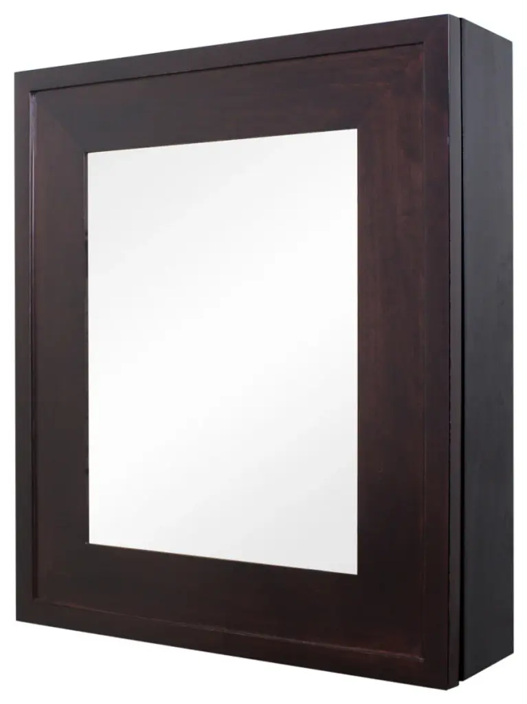 The Coffee Bean Wall Mount Mirrored Medicine Cabinet features our raised edge profile door and is stained inside and out with the darkest brown we could find. Works well with both modern and traditional decor. Mounts on your wall in minutes! Our unique design also allows you easy access to the mirror so you can remove it for thorough cleaning or replace it, should anything ever happen to it - without having to replace the entire cabinet.Individually handcrafted from US grown hardwoodsLacquer finish makes it resistant to moistureCompletely reversible; mounts with door opening in either directionIncludes 3 solid wood shelves adjustable to 7 different heightsDimensionsCabinet exterior, 19 7/8" H x 16 7/8" W x 5 1/8" DCabinet interior, 18 9/16" H x 15 9/16" W x 3 11/16" DHolds the included 11" x 14" mirror