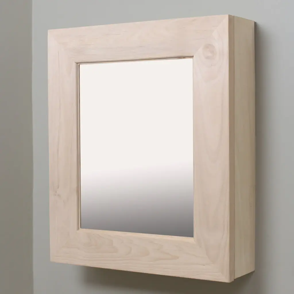 The Unfinished Flat Frame Wall Mount Mirrored Medicine Cabinet features our flat profile door and is made of unfinished wood. Paint or stain it yourself to match your decor perfectly! Mounts on your wall in minutes! Our unique design also allows you easy access to the mirror so you can remove it for thorough cleaning or replace it, should anything ever happen to it - without having to replace the entire cabinet.Individually handcrafted from US grown hardwoodsLacquer finish makes it resistant to moistureCompletely reversible; mounts with door opening in either directionIncludes 3 solid wood shelves adjustable to 7 different heightsDimensionsCabinet exterior, 19 7/8" H x 16 7/8" W x 5 1/8" DCabinet interior, 18 9/16" H x 15 9/16" W x 3 11/16" DHolds the included 11" x 14" mirror