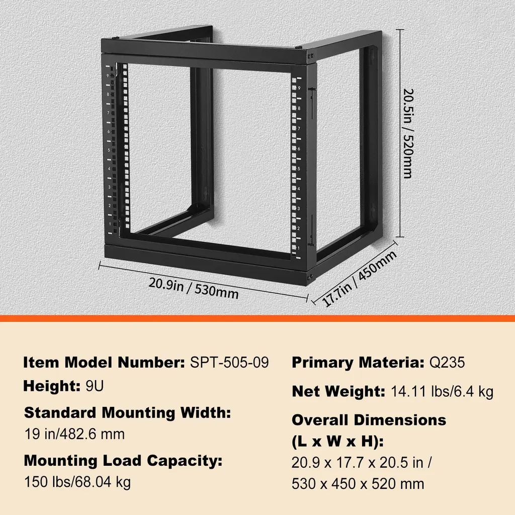 Hassle-Free Equipment Management: Our 9U open frame rack features an open hinged door that swings a full 180°, giving you unrestricted access to the rear panel and cables for quick and easy maintenance. You can fully disassemble the rotating door during assembly or servicing and effortlessly reinstall it when you're done. Manage your equipment with ease and efficiency! Heavy-Duty, Built to Last: Crafted from premium Q235 carbon steel, this wall mount network rack supports up to 150 lbs (68 kg), ensuring your equipment remains stable and secure, even under heavy loads. Say goodbye to wobbling and tilting—this rack stands firm, keeping your gear secure and steady 9U Wall-Mount Rack: Designed for standard 19" servers, A/V, and network equipment, our wall-mount rack features a depth of 18 inches. It comes with M6 screws and cage nuts, allowing you to securely mount switches, firewalls, and other devices directly onto the steel frame. Enjoy long-lasting stability and reliability, even during extended use. Designed for Your Convenience: Equipped with pre-drilled square holes, threaded holes, wall-mounting holes, and clear measurement markings, this open frame rack offers flexible installation options for both equipment and brackets. Adapt to various installation needs, ensuring stability and reliability for your entire system. Flexible Partition with Ease: Pair this wall mount network rack with our 1U & 2U server shelves (sold separately) to optimize your rack space and streamline your setup. Create a neatly organized space, reduce clutter, and minimizing interference and collision risks between devices. Enjoy a more efficient and tidy workspace with ease! Package Content 1 x 9U Wall Mount Server Rack