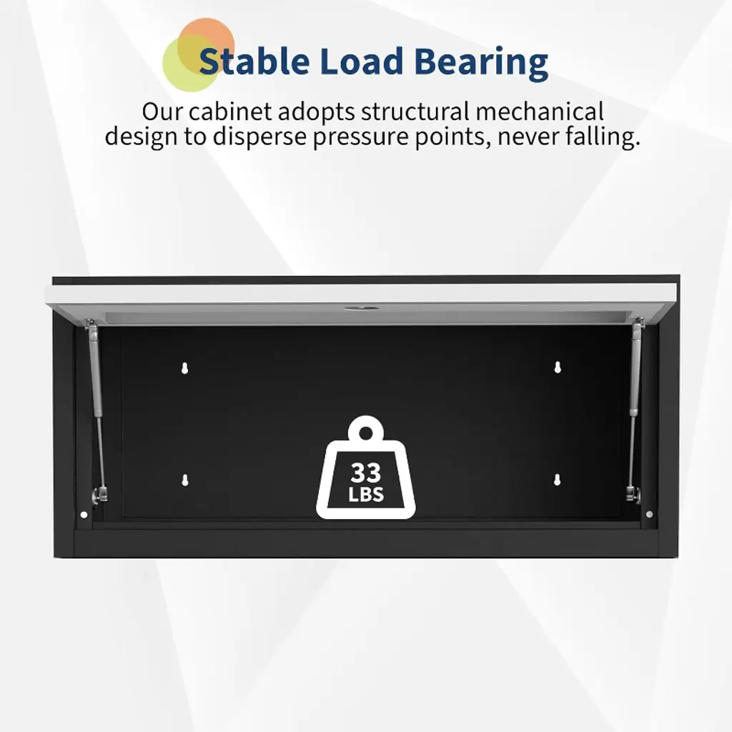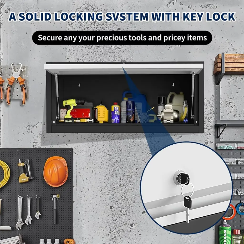 Features a stylish goose neck upward flip door powered by two hydraulic rods for smooth and effortless opening and closing, keeping your tools dust-free and easy to access.This cabinet provides exceptional durability and strength, ensuring your tools and valuables remain securely protected.