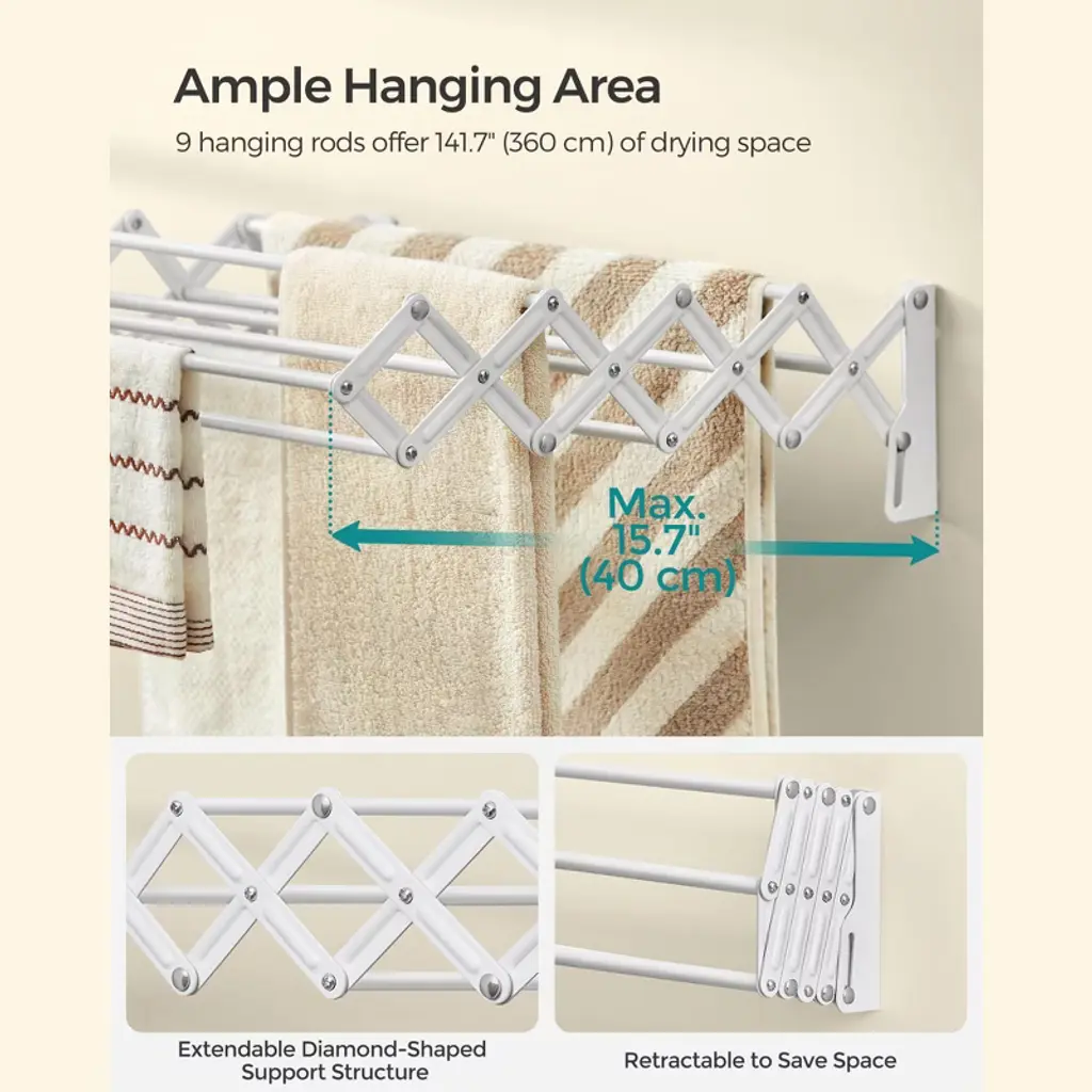 Wall-mounted Accordion Drying Rack With 9 Expandable Rods, 22 Lb Capacity Space-saving Laundry Rack, Cloud White