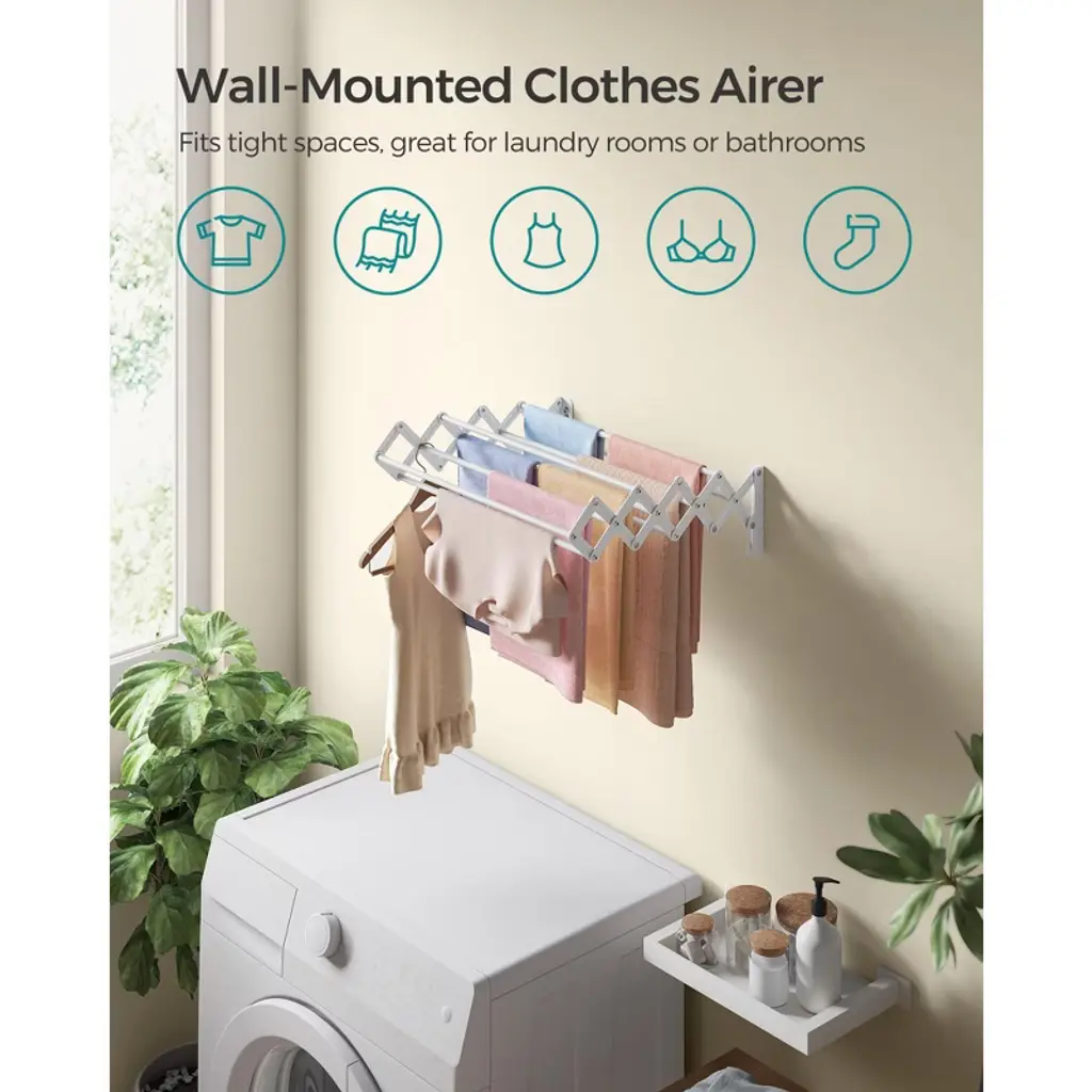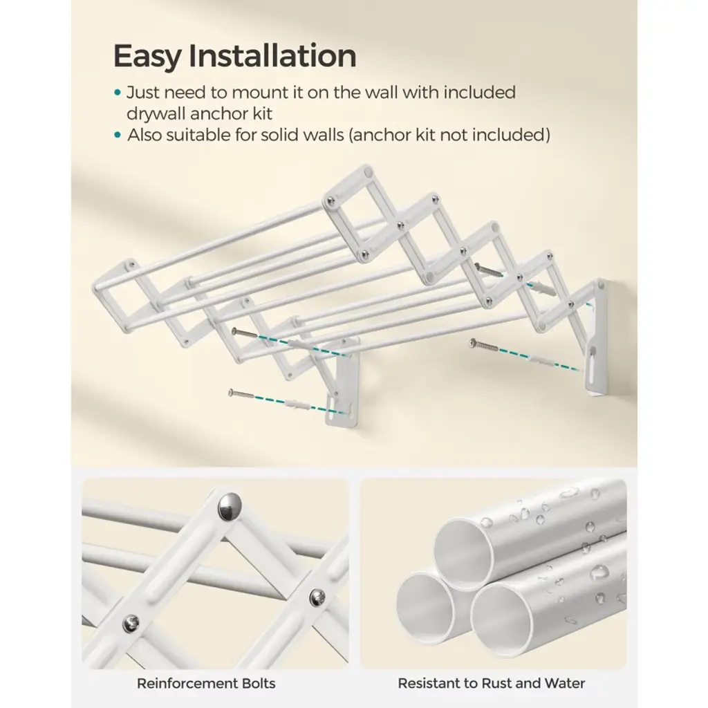 This space-efficient wall-mounted drying rack features 9 staggered rods providing 141.7" of drying space, expanding to 15.7"D and retracting to just 3.9"D when not in use. Constructed with reinforced steel and a diamond-shaped frame, it supports up to 22 lbs and includes drywall anchors for easy installation. Ideal for small bathrooms or laundry rooms, it promotes airflow and keeps clothes separated during drying. Product Size: 15.7"D x 16.5"W x 4.7"H (40 x 42 x 12 cm) Folded Size: 3.9"D x 16.5"W x 4.7"H (10 x 42 x 12 cm) Product Weight: 2 lb (0.9 kg) Max. Total Static Load Capacity: 22 lb (10 kg)