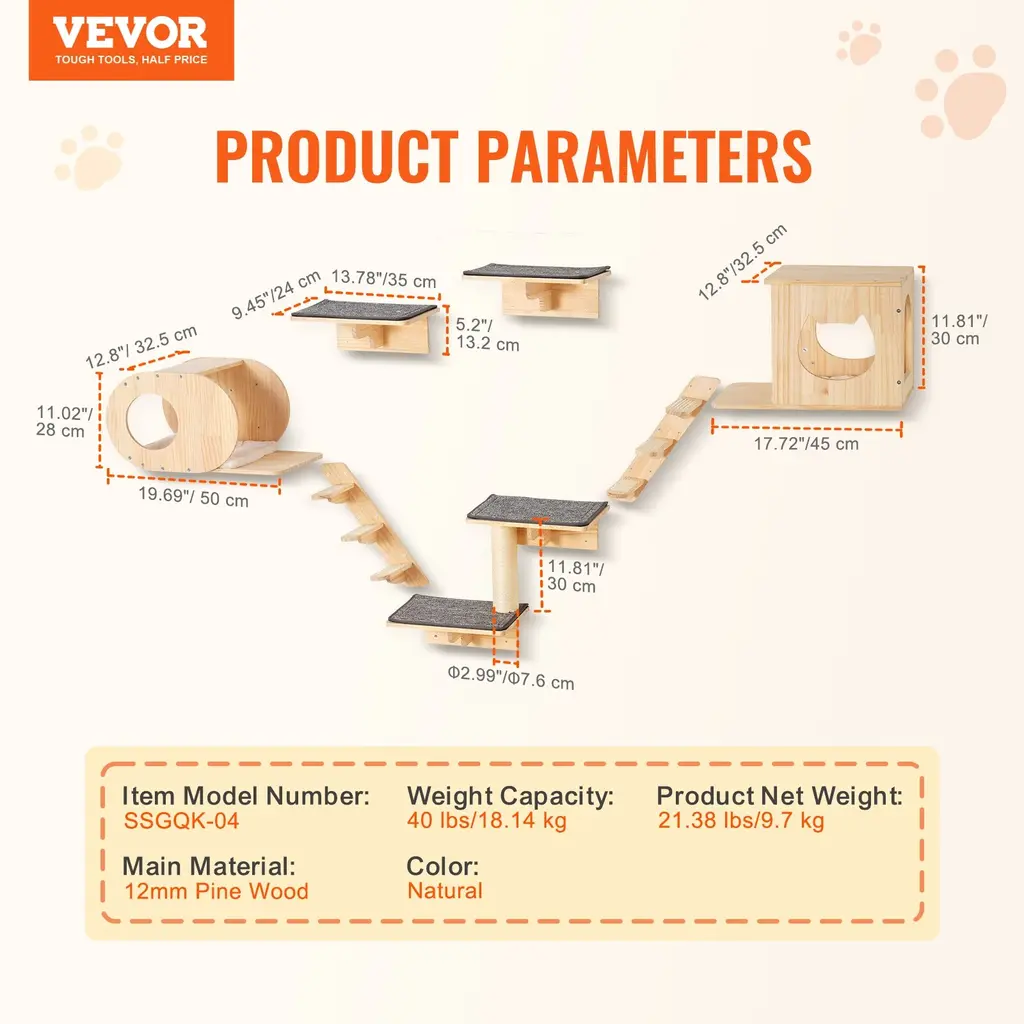 Fun Playground for Cats: For particle board option: This cat wall shelf includes 2 jumping boards, 1 hammock, 1 sofa, 1 cat tree & 1 cat grip, catering to your cat's needs for climbing, playing, resting, and scratching. It creates a rich environment for your feline to enjoy hours of fun and relaxation. For 9 set pine wood option: 4 jumping boards, 2 cat nests, 2 hammock and 1 cat tree. For 7 set pine wood option: 2 jumping boards, 2 cat nests, 2 hammock & 1 cat tree. For natural oak wood option: 2 jump posts and 2 hammocks. For 5 set pine wood option: 2 jumping boards, 1 cat nest, 1 barrier board & 1 cat tree. Comfortable and Durable Material: Made from particle board and a metal frame / E0-grade pine wood / natural oak wood , this wall mounted cat shelf is sturdy and durable, capable of supporting up to 40 lbs (18.14 kg). The natural pine wood is non-toxic and odorless, allowing cats to climb and play safely. The platform surface is covered with a plush pad for slip-resistance and softness, protecting your cat's paws. Easy Installation: The package includes all necessary accessories and an installation guide. Simply follow the steps, insert the expansion tubes into the wall, and secure the boards using screws. The installation process is straightforward, allowing one person to easily set it up in no time. Comprehensive Accessories: The cat wall furniture set comes with metal screws, expansion tubes, butterfly anchors, a screwdriver, T-shaped hex screwdriver, and an installation diagram for hassle-free mounting on various wall types. Versatile Use: Our cat wall furniture set can be freely arranged to suit different spaces and preferences. With its minimalist and cute design, the wall-mounted setup saves floor space and blends perfectly with your home decor, whether installed in the living room, bedroom, or patio wall. Package Content 1 x Cat Wall Shelf Set