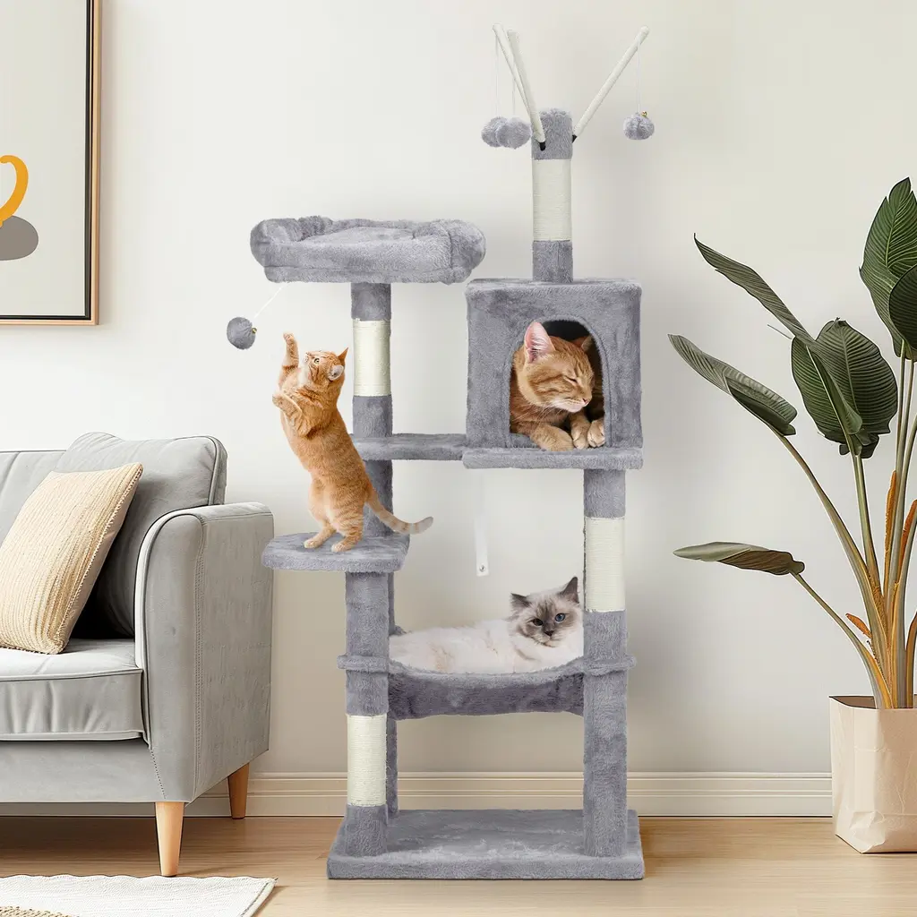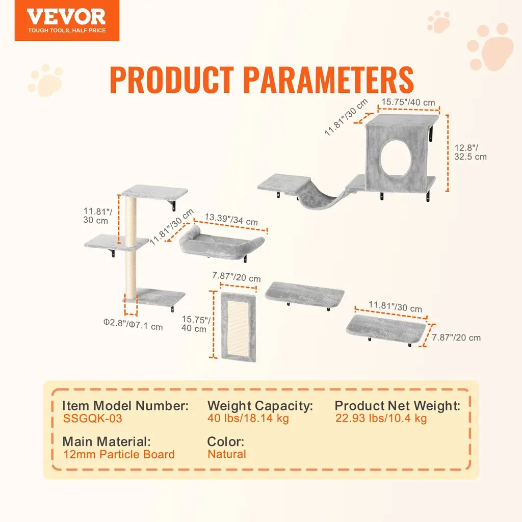 Fun Playground for Cats: For particle board option: This cat wall shelf includes 2 jumping boards, 1 hammock, 1 sofa, 1 cat tree & 1 cat grip, catering to your cat's needs for climbing, playing, resting, and scratching. It creates a rich environment for your feline to enjoy hours of fun and relaxation. For 9 set pine wood option: 4 jumping boards, 2 cat nests, 2 hammock and 1 cat tree. For 7 set pine wood option: 2 jumping boards, 2 cat nests, 2 hammock & 1 cat tree. For natural oak wood option: 2 jump posts and 2 hammocks. For 5 set pine wood option: 2 jumping boards, 1 cat nest, 1 barrier board & 1 cat tree. Comfortable and Durable Material: Made from particle board and a metal frame / E0-grade pine wood / natural oak wood , this wall mounted cat shelf is sturdy and durable, capable of supporting up to 40 lbs (18.14 kg). The natural pine wood is non-toxic and odorless, allowing cats to climb and play safely. The platform surface is covered with a plush pad for slip-resistance and softness, protecting your cat's paws. Easy Installation: The package includes all necessary accessories and an installation guide. Simply follow the steps, insert the expansion tubes into the wall, and secure the boards using screws. The installation process is straightforward, allowing one person to easily set it up in no time. Comprehensive Accessories: The cat wall furniture set comes with metal screws, expansion tubes, butterfly anchors, a screwdriver, T-shaped hex screwdriver, and an installation diagram for hassle-free mounting on various wall types. Versatile Use: Our cat wall furniture set can be freely arranged to suit different spaces and preferences. With its minimalist and cute design, the wall-mounted setup saves floor space and blends perfectly with your home decor, whether installed in the living room, bedroom, or patio wall. Package Content 1 x Cat Wall Shelf Set