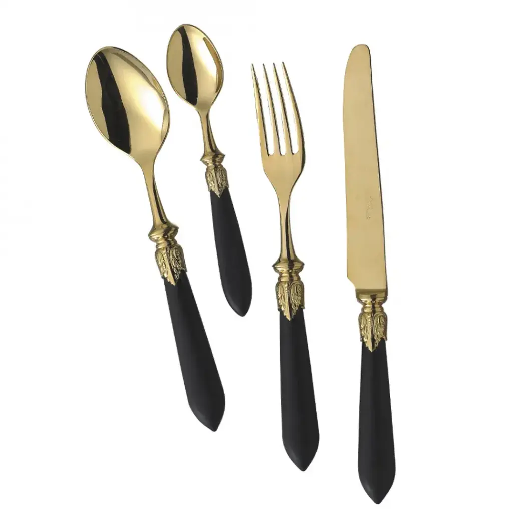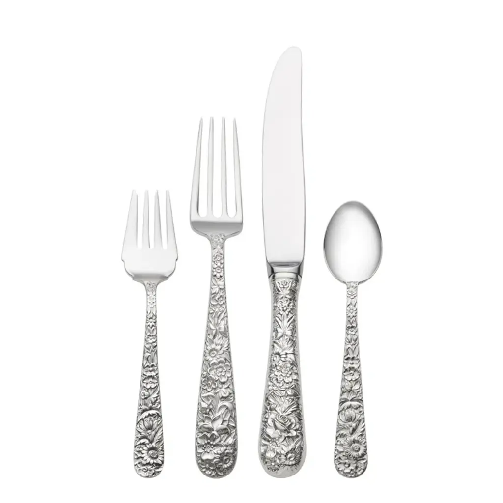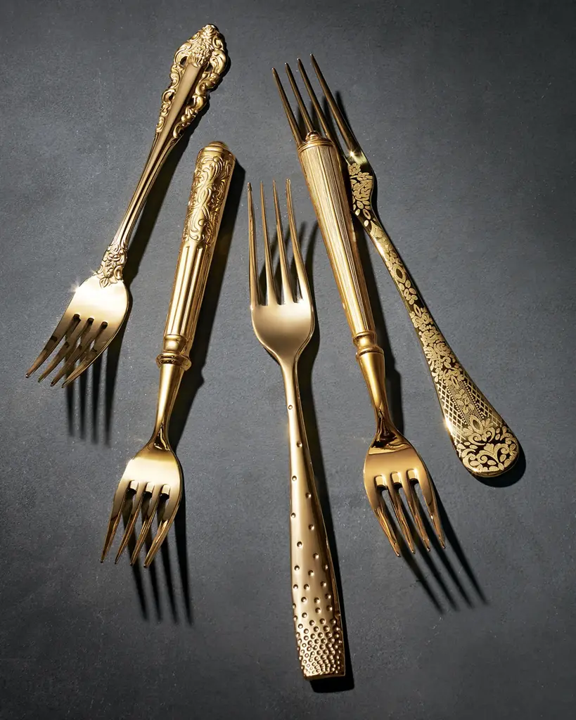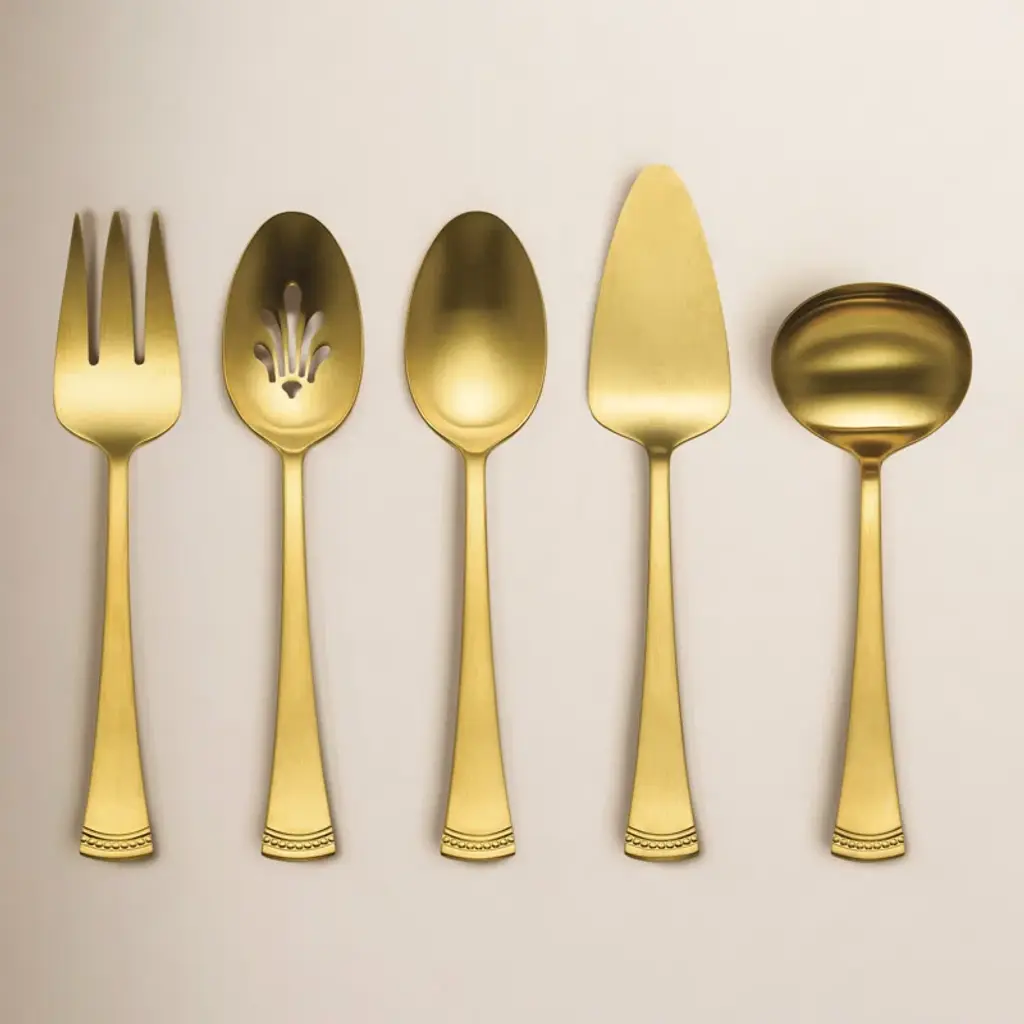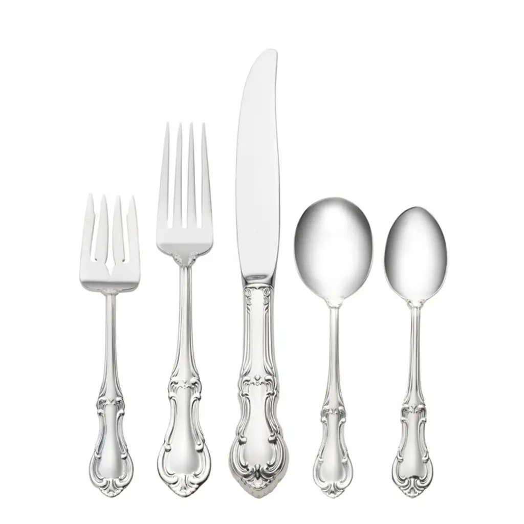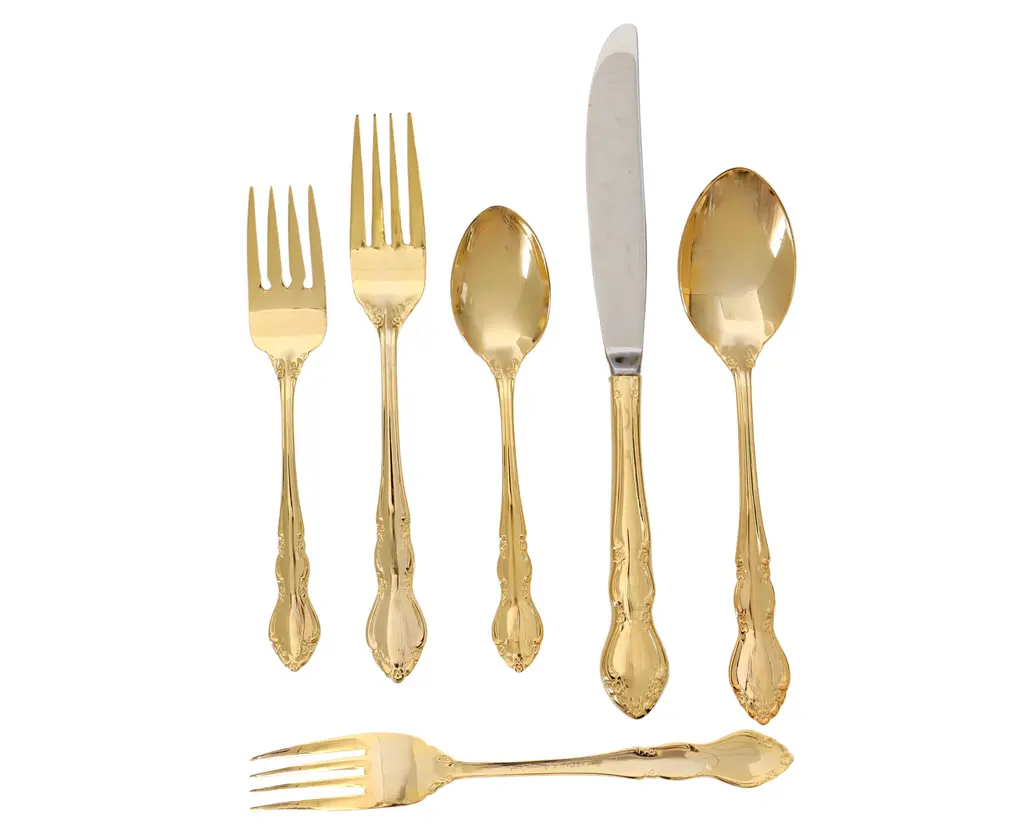 24-karat yellow gold-plated flatware has a scroll motif. 65-piece service includes 12 five-piece place settings and a five-piece hostess set. Place Setting: Dinner Fork: 8.25", Dinner Knife: 9.5", Dinner Spoon: 7.5", Salad Fork: 7.5", Teaspoon: 6.5" Hostess Set: Cold Meat Fork: 9", Butter Serving Knife: 7", Tablespoon: 9", Pierced Tablespoon: 9", Sugar Spoon: 6.5" Hand wash recommended. Imported. About Wallace® Silversmiths: For over 150 years, Wallace Silversmiths has been renowned for its exquisite sterling silver and fine stainless steel flatware. Wallace artisans employ a centuries-old method of craftsmanship to ensure the flawless composition of every piece bearing their hallmark. Available in a wide selection of designs, Wallace flatware is created for the discerning customer who appreciates beauty and tradition. From the understated to the ornate, Wallace flatware’s timeless styles reflect artistry from years past that continues to complement today’s tables.