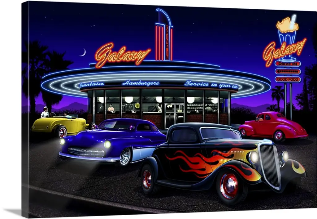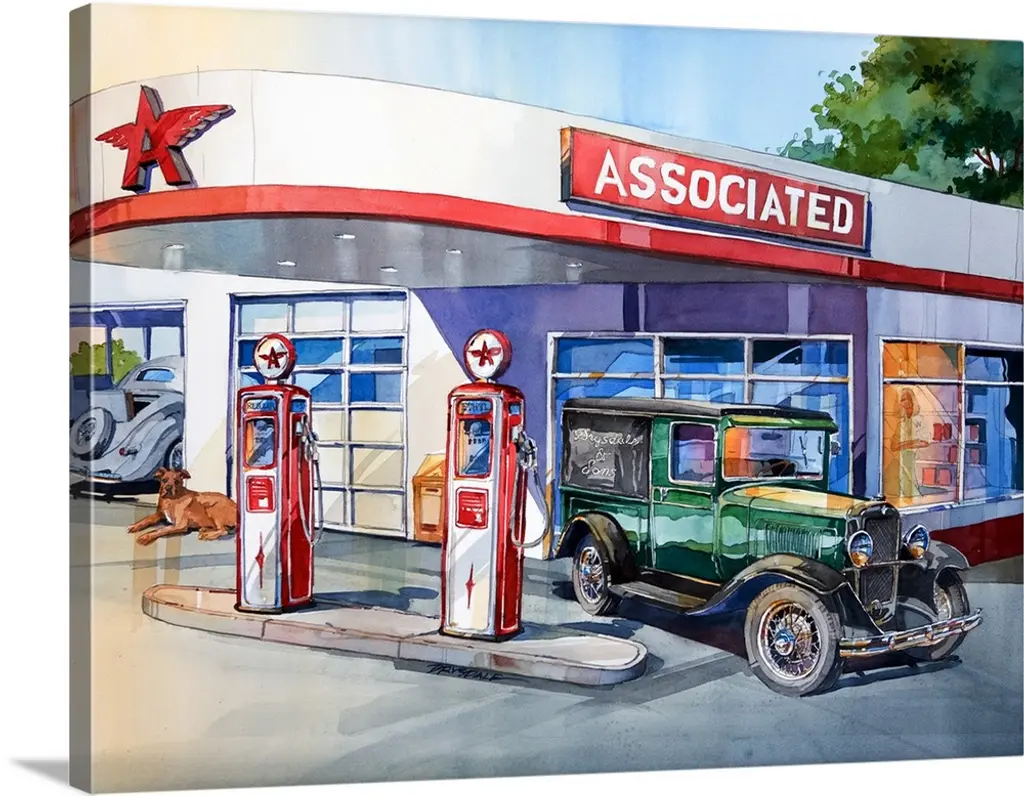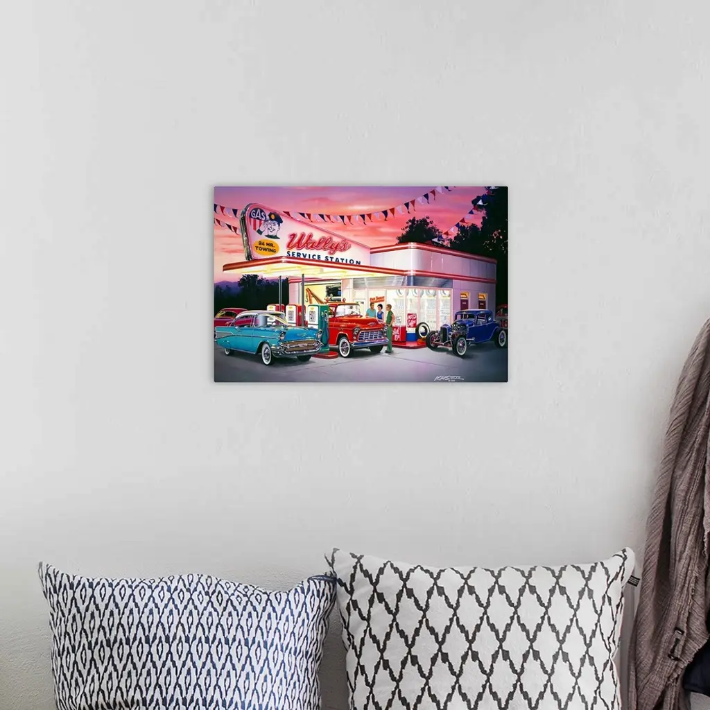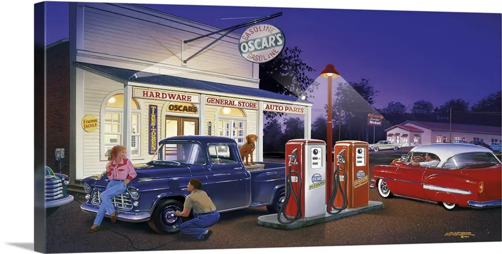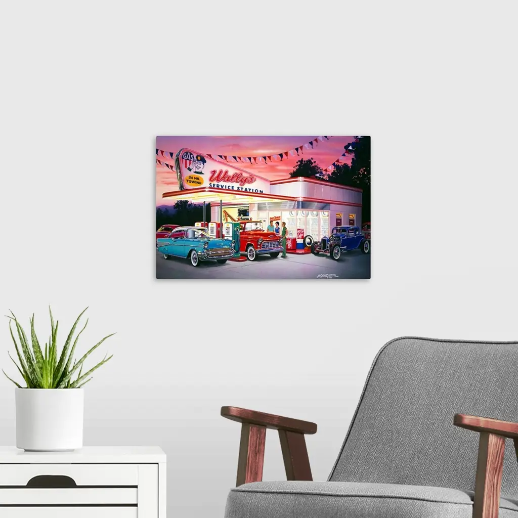 Old style gas station in late 50s. 1957 Chevolet Hardtop, 1956 Chevy truck, 1932 Ford Coupe Hot Rod
