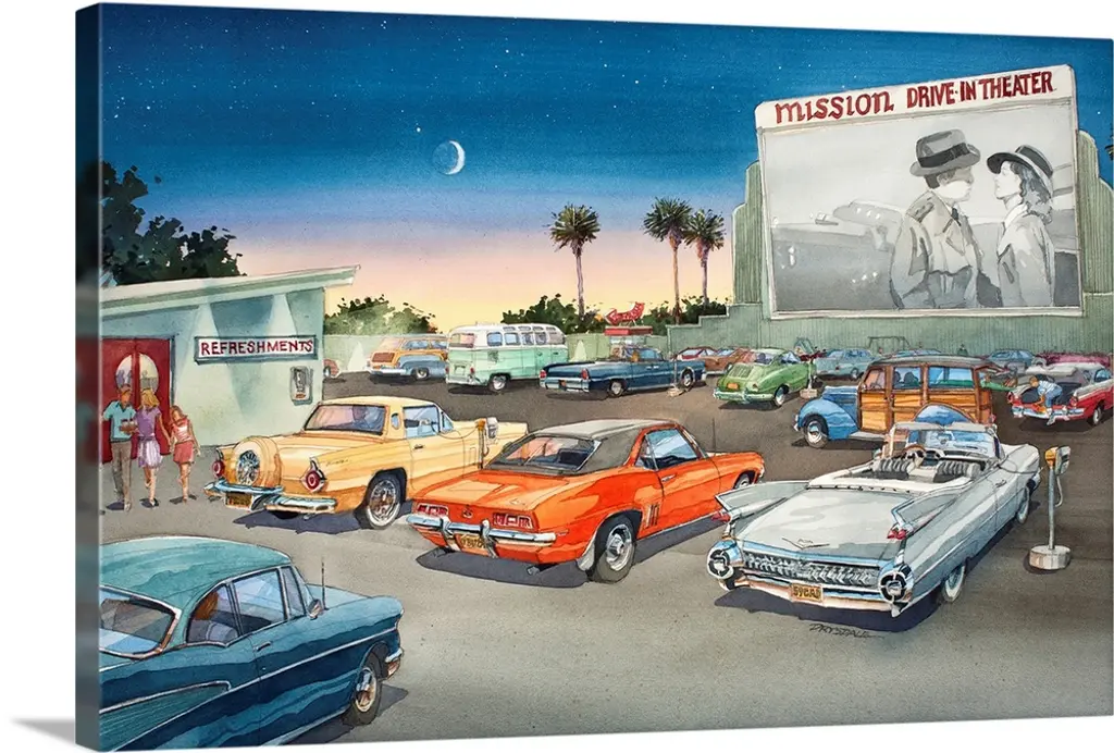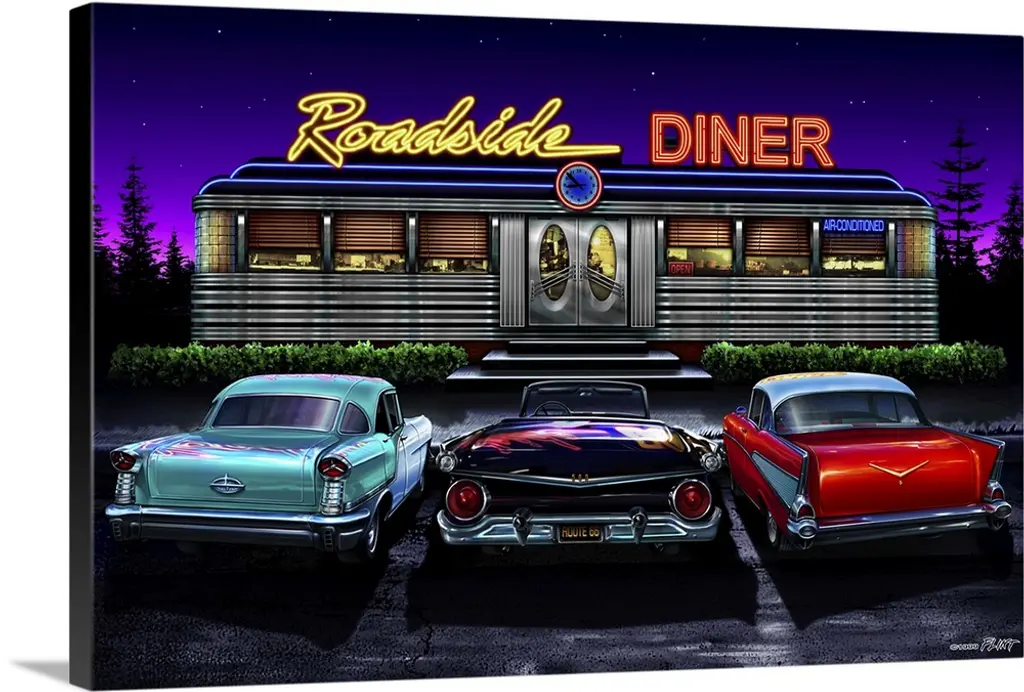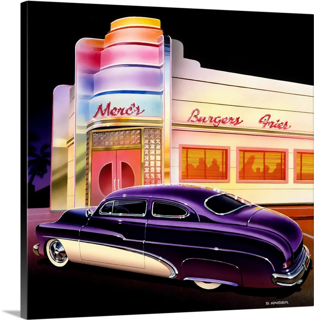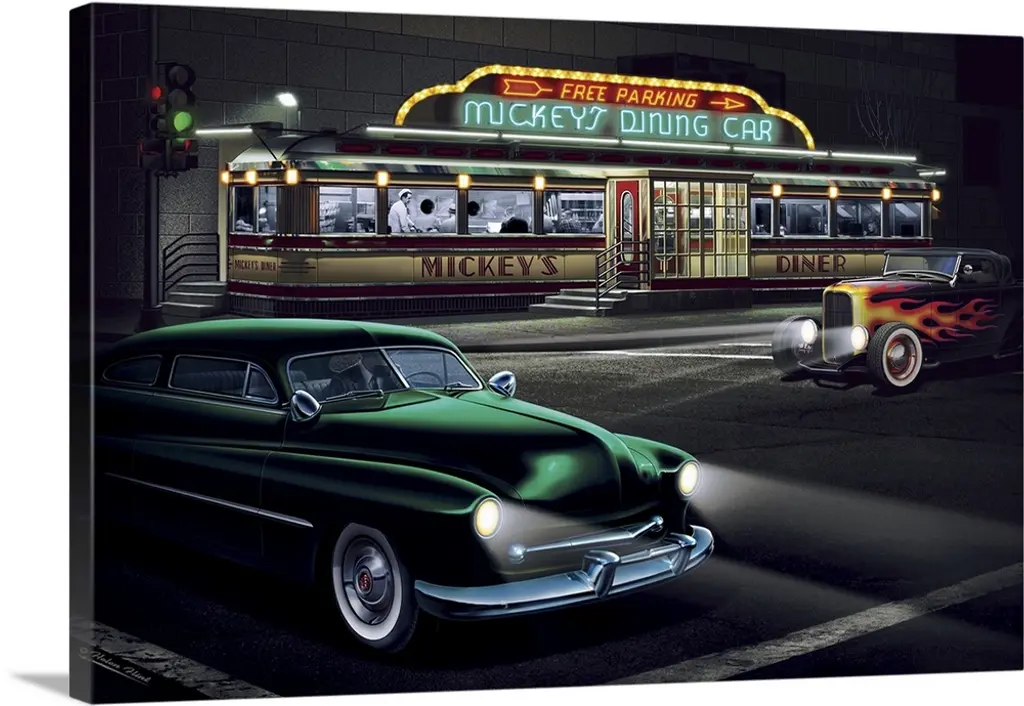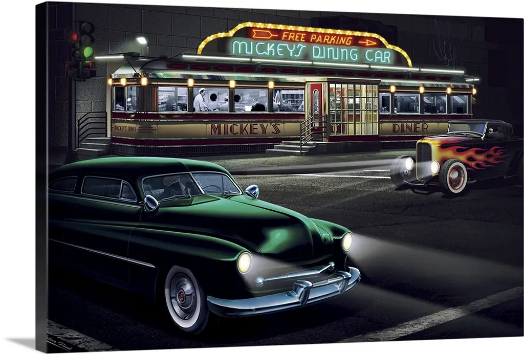 Old style gas station in late 50s. 1957 Chevolet Hardtop, 1956 Chevy truck, 1932 Ford Coupe Hot Rod