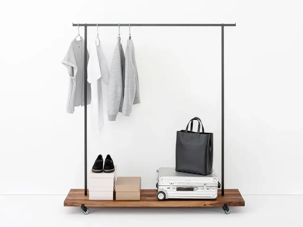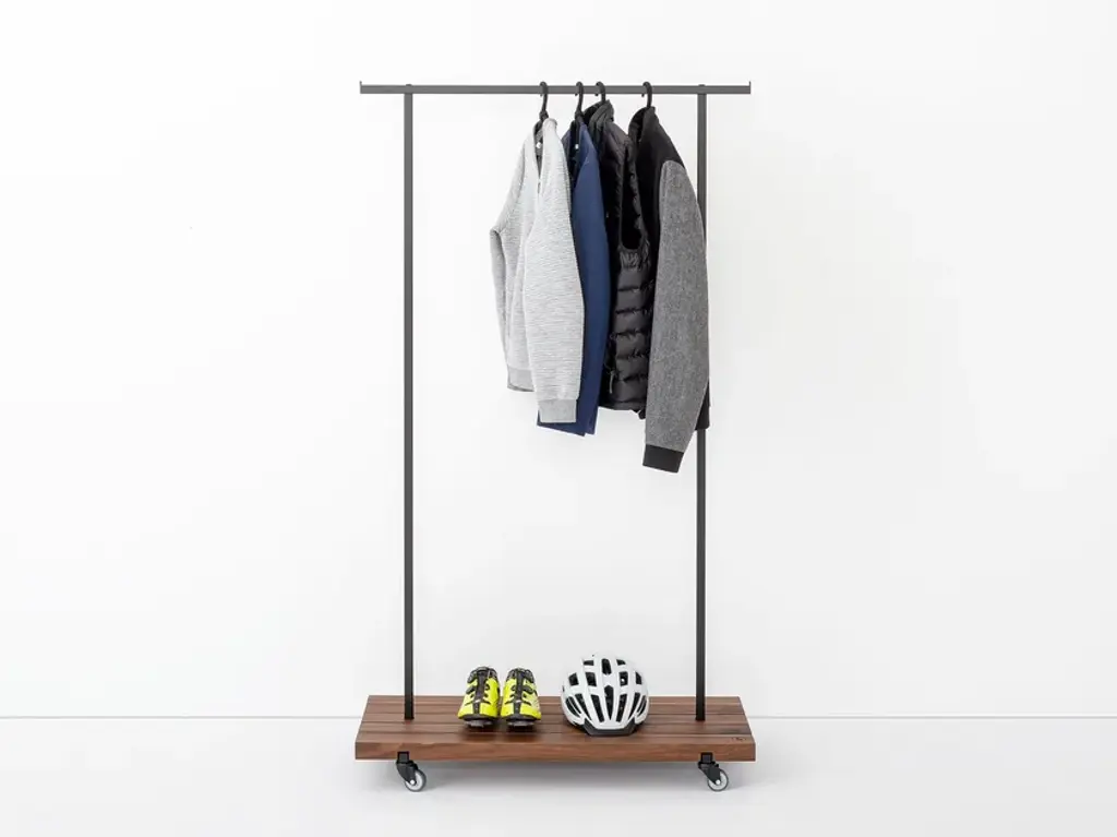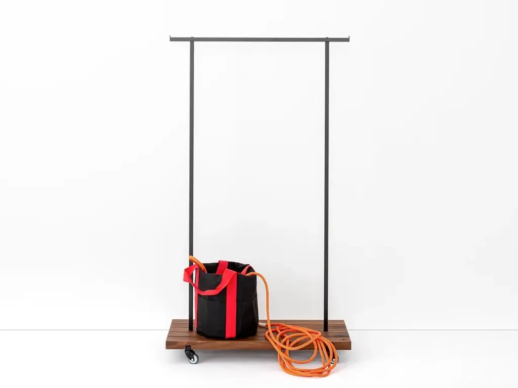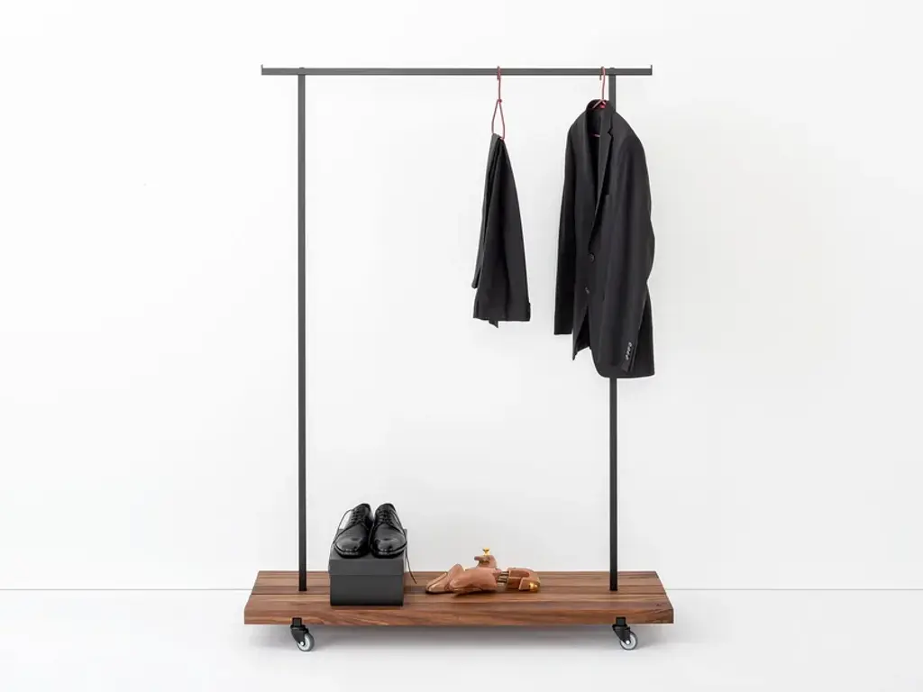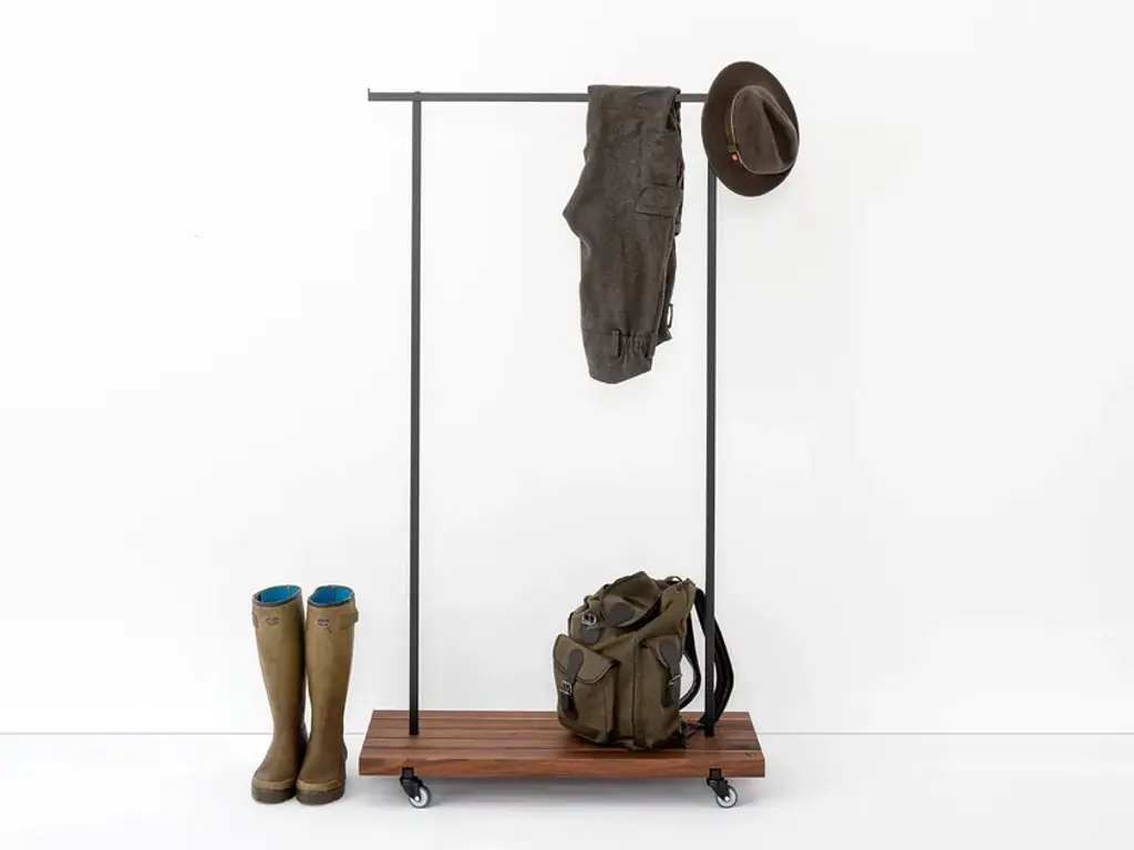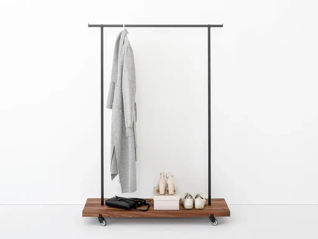 The WALNUT CLOTHES RACK #01 from weld & co unites form, function, and flexibility. Its solid walnut and elegant steel components harmonize in a subtle and understated design while also offering practical storage options. The base made of wooden planks serves as a shelf, while the rack provides hanging space. Its soft casters make it easy to move the clothes rack wherever it’s needed, on all types of flooring.In the bedroom and dressing room, it functions as a multi-purpose rack for your clothing or even a valet stand. In the hall or entryway, it provides a great place to hang coats and jackets. And in the bathroom, gym, exercise room, or next to the sauna, it’s a handy shelf or a rail to hang up clothes or towels.The WALNUT CLOTHES RACK #01 is available in three sizes, making it a great fit for almost any room. The frame and rail come in either black or white.Walnut will win you over with its nuanced shades of brown, which can range from light to dark, and the silky shimmer of its surface. The Walnut collection from weld & co showcases the special qualities of this premium wood. The warm tones of the wood used in our furniture and home accessories can complement the decor of a room or provide an attractive highlight. Black metal elements provide a distinctive contrast between wood and steel.