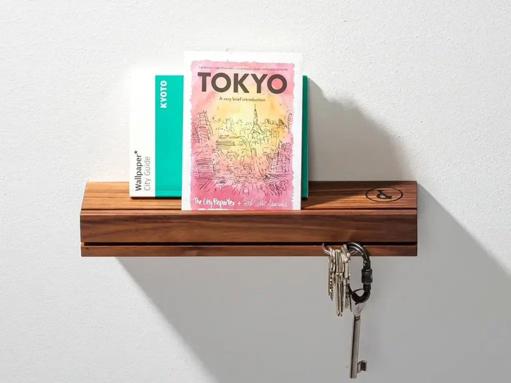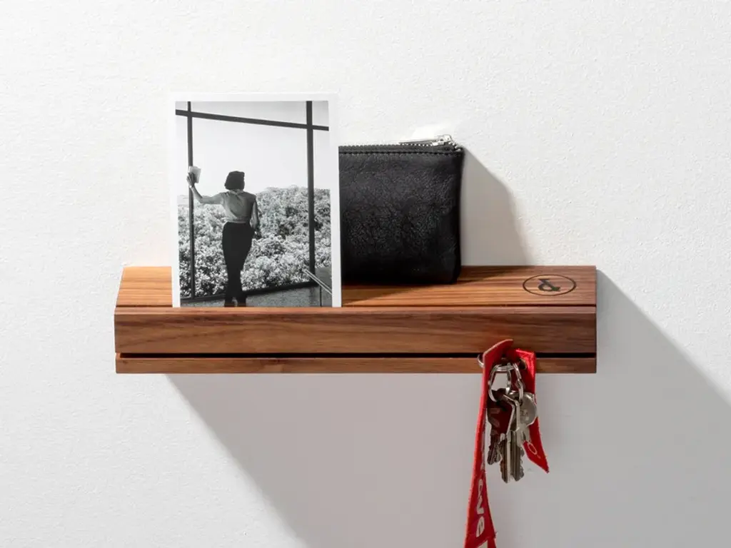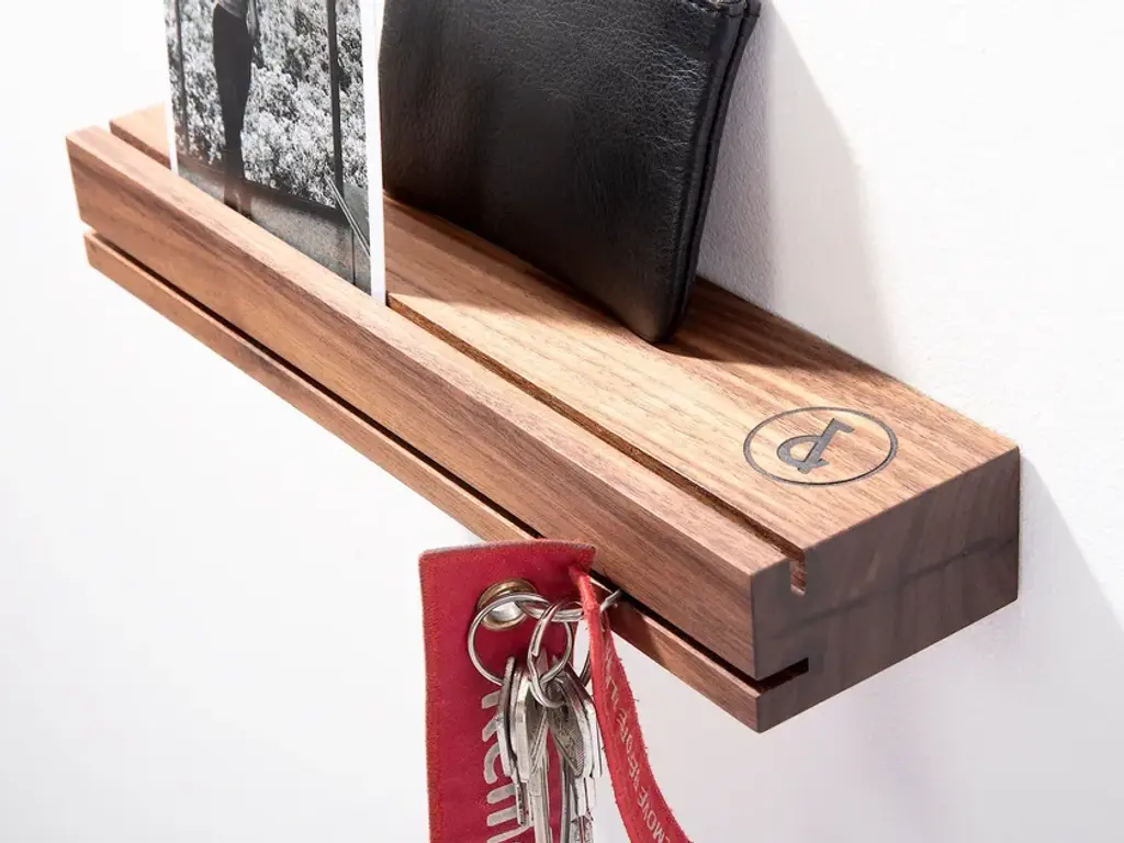 Keys, wallet, (sun-) glasses, smartphone, travel mug – there’s room for everything on the WALNUT KEY HOLDER #01 from weld & co, so you’ll never again go out the door without the things you need. The front of this small shelf features a lengthwise slot that can be used to hold keys and keyrings. Another groove on the upper surface of the key holder is a handy place for postcards, important letters, tickets, and much more.The WALNUT KEY HOLDER #01 is made from solid walnut wood. The surface its oiled, bringing out the dark, silky hue and fine grain of the wood. It is mounted on the wall using two screws.Walnut will win you over with its nuanced shades of brown, which can range from light to dark, and the silky shimmer of its surface. The Walnut collection from weld & co showcases the special qualities of this premium wood. The warm tones of the wood used in our furniture and home accessories can complement the decor of a room or provide an attractive highlight. Black metal elements provide a distinctive contrast between wood and steel.