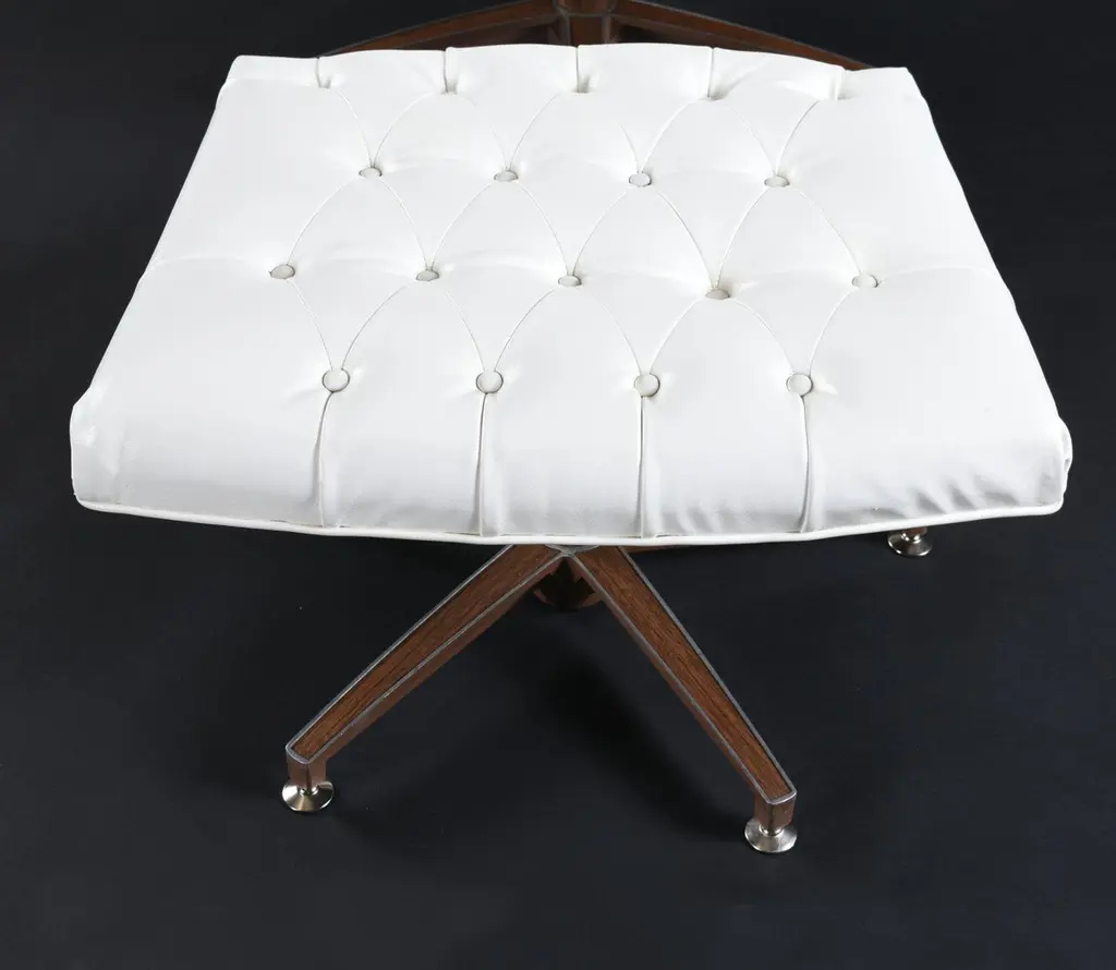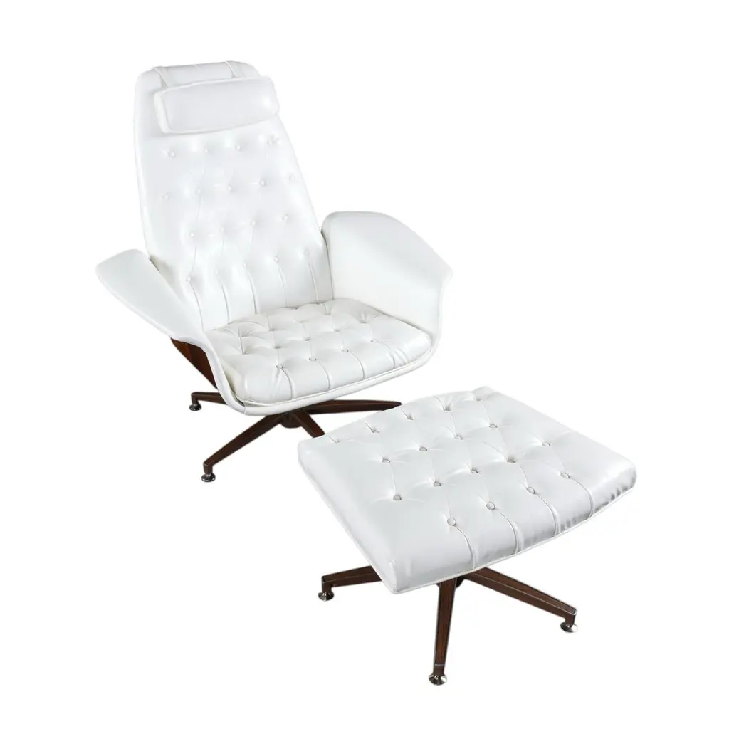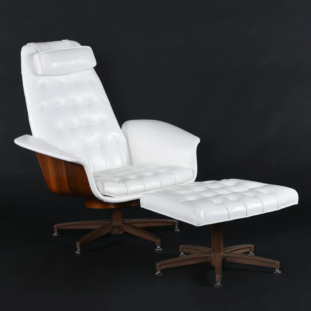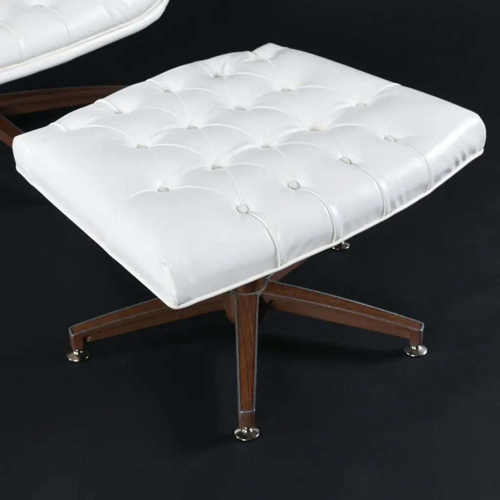 This listing is for ONE chair with ottoman. The second chair has been sold.Beautifully restored Mid-Century Modern white lounge chair with ottomans designed in the manner of George Mulhauser's "Mr. Chair". The chic white tufted upholstery is absolutely exquisite. The walnut wood shells are the perfect compliment to the luxuriously tailored upholstery. Cool, casual, and comfortable in their skin. If this chair became sentient, it would ask for a highball and a cigarette.This mid-century lounge set — designed by George Mulhauser for Plycraft in the 1960s — is a masterstroke of sculptural sophistication and ergonomic poise. The walnut plywood shells flow like liquid architecture, embracing the sitter with organic curvature and precise lines. The tufted upholstery adds tactile depth and vintage drama, contrasting beautifully with the frame’s smooth geometry.Design & AppealMulhauser’s vision fused the warmth of natural materials with bold, futuristic form. The chair’s high back gently reclines on a swivel star base, inviting a sense of relaxed ease, while the accompanying ottoman echoes the curves as a gracious nod to total comfort.Our in-house restoration team did a complete tear-down and rebuild to ensure every inch was inspected and delicately restored. A few loose buttons were retied and the fabric was completely rejuvenated to gleaming bright white using our proprietary techniques. Although the wood backs and under-arms were already in good condition, we went the extra distance to make sure every scratch was mitigated. 5 coats of hand buffed finish were applied to the walnut and new feet were attached on bases to finalize the restoration.Why This Listing Stands OutThis isn’t just seating—it’s mid-century sculpture. While “Mr. Chair” sets occasionally appear with basic finishes, this version stands apart for its sculptural integrity, premium restoration, and tactile appeal. The chair’s form reads as architectural, yet the upholstery invites leisurely repose.Ideal for collectors of American modernism and interiors seeking a statement lounge piece, the “Mr. Chair” set balances theatrical presence with homegrown craftsmanship. It promises to anchor a room with both design confidence and thoughtful comfort.The chair and ottoman both swivel on 5-star metal bases. The chair rocks back and returns to upright against the tension of a metal coil spring. Chair 38.5” Wide x 38” Deep x 39.5” High (14.5” seat height)Ottoman 25.25” Wide x 19.25” Deep x 13.25” High