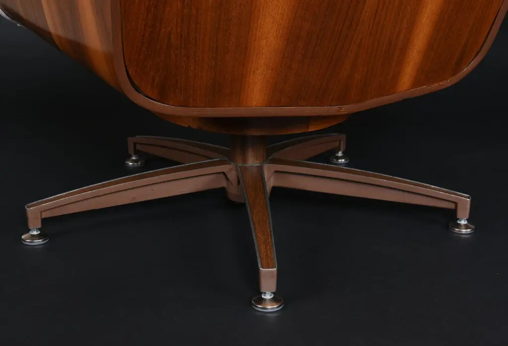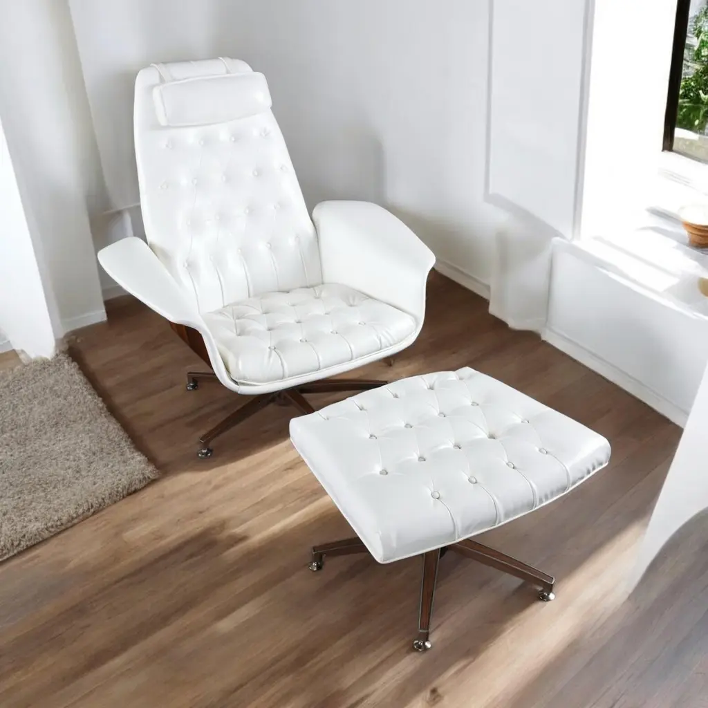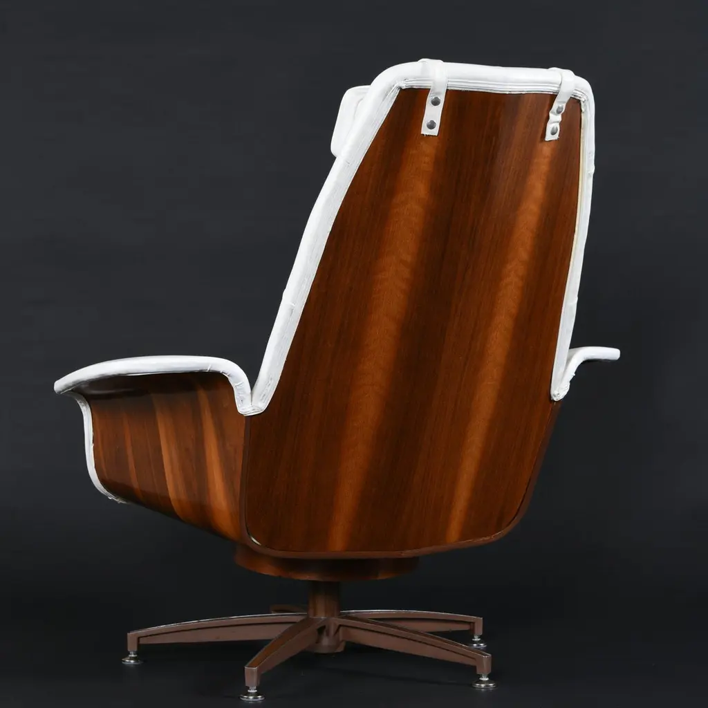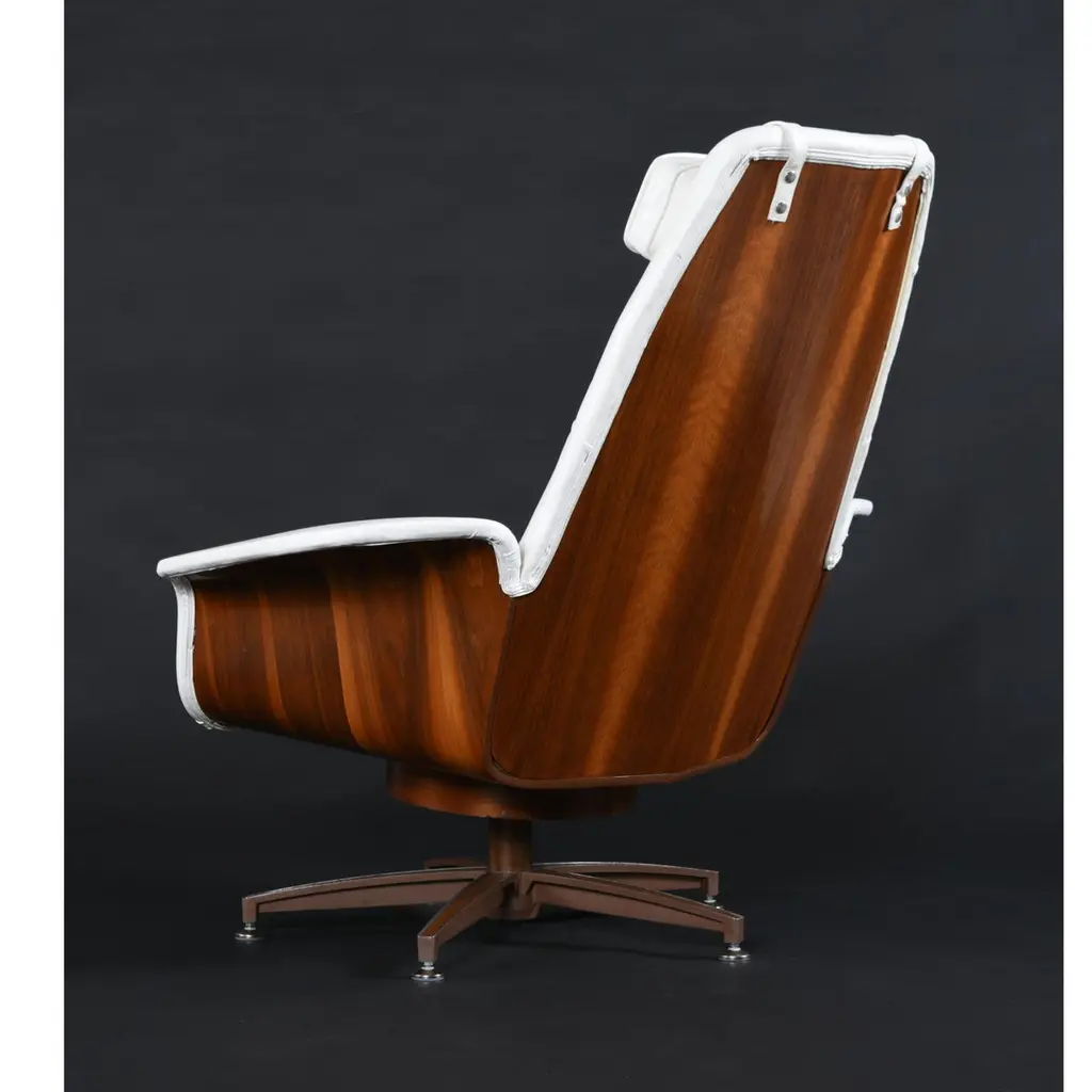 This listing is for ONE chair with ottoman. The second chair has been sold.Beautifully restored Mid-Century Modern white lounge chair with ottomans designed in the manner of George Mulhauser's "Mr. Chair". The chic white tufted upholstery is absolutely exquisite. The walnut wood shells are the perfect compliment to the luxuriously tailored upholstery. Cool, casual, and comfortable in their skin. If this chair became sentient, it would ask for a highball and a cigarette.This mid-century lounge set — designed by George Mulhauser for Plycraft in the 1960s — is a masterstroke of sculptural sophistication and ergonomic poise. The walnut plywood shells flow like liquid architecture, embracing the sitter with organic curvature and precise lines. The tufted upholstery adds tactile depth and vintage drama, contrasting beautifully with the frame’s smooth geometry.Design & AppealMulhauser’s vision fused the warmth of natural materials with bold, futuristic form. The chair’s high back gently reclines on a swivel star base, inviting a sense of relaxed ease, while the accompanying ottoman echoes the curves as a gracious nod to total comfort.Our in-house restoration team did a complete tear-down and rebuild to ensure every inch was inspected and delicately restored. A few loose buttons were retied and the fabric was completely rejuvenated to gleaming bright white using our proprietary techniques. Although the wood backs and under-arms were already in good condition, we went the extra distance to make sure every scratch was mitigated. 5 coats of hand buffed finish were applied to the walnut and new feet were attached on bases to finalize the restoration.Why This Listing Stands OutThis isn’t just seating—it’s mid-century sculpture. While “Mr. Chair” sets occasionally appear with basic finishes, this version stands apart for its sculptural integrity, premium restoration, and tactile appeal. The chair’s form reads as architectural, yet the upholstery invites leisurely repose.Ideal for collectors of American modernism and interiors seeking a statement lounge piece, the “Mr. Chair” set balances theatrical presence with homegrown craftsmanship. It promises to anchor a room with both design confidence and thoughtful comfort.The chair and ottoman both swivel on 5-star metal bases. The chair rocks back and returns to upright against the tension of a metal coil spring. Chair 38.5” Wide x 38” Deep x 39.5” High (14.5” seat height)Ottoman 25.25” Wide x 19.25” Deep x 13.25” High
