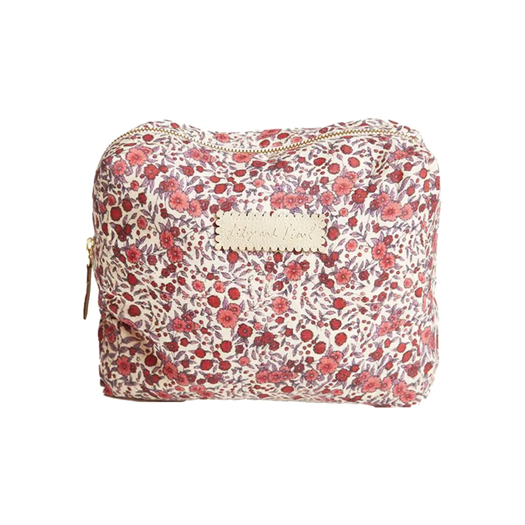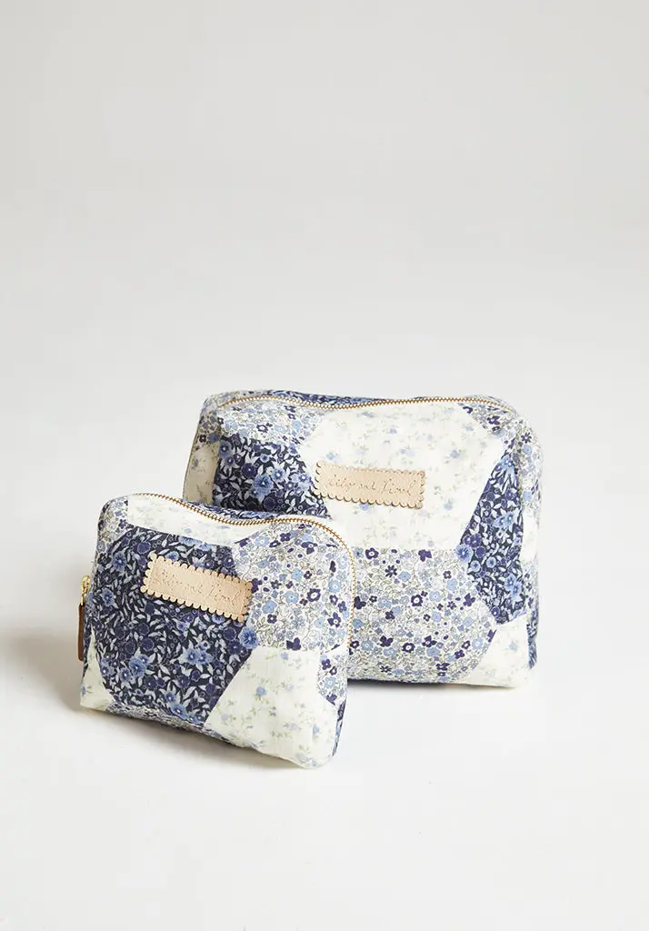 The wash bag is cut from 100% linen and features the Aster patchwork print. Lined with a waterproof layer to guard against spills and finished with tonal scalloped leather branding and leather zip tab.