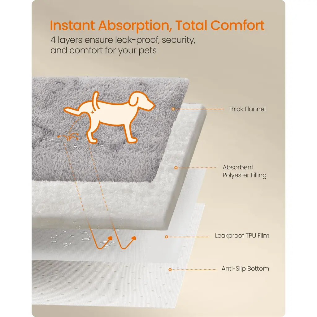 Specification:Description: Keep your pet dry and comfortable with these washable pee pads for dogs, designed with 4 layers of protection. The top layer channels liquids quickly, while the second layer absorbs efficiently, the third is waterproof to prevent leaks, and the bottom layer features rubber dots to keep the pad securely in place. These highly absorbent pads are perfect for puppies, adult dogs, and other small pets, ensuring a clean, dry environment. Made from durable polyester and featuring a TPU waterproof layer, they are machine washable, reusable, and built to withstand frequent washes. Ideal for use in dog crates, pens, car seats, sofas, and even as feeding mats, these versatile pads come in a convenient 2-pack for easy replacement and quick changes. Key Features: