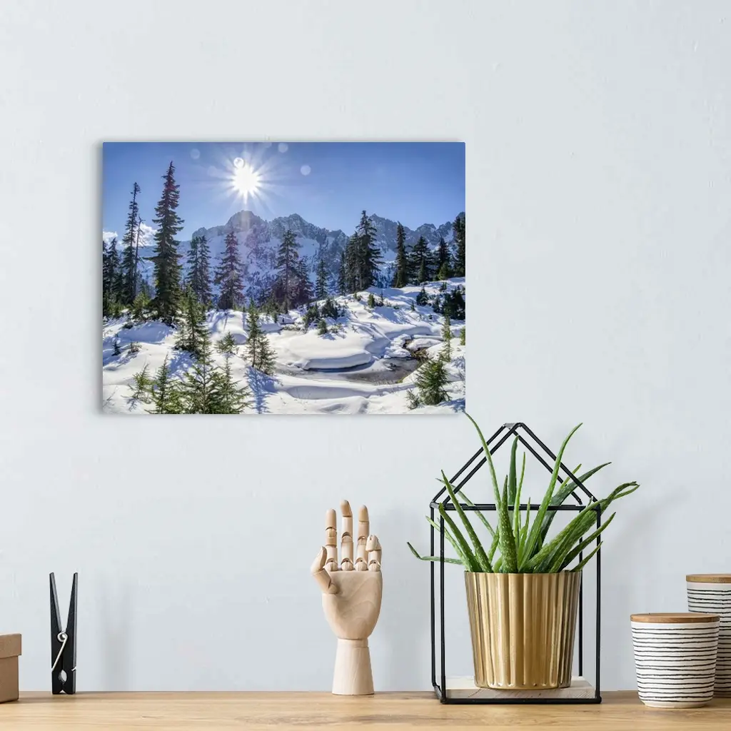 USA, Washington State, Alpine Lakes Wilderness. Frozen alpine pond with fresh snow and Cascade Range.