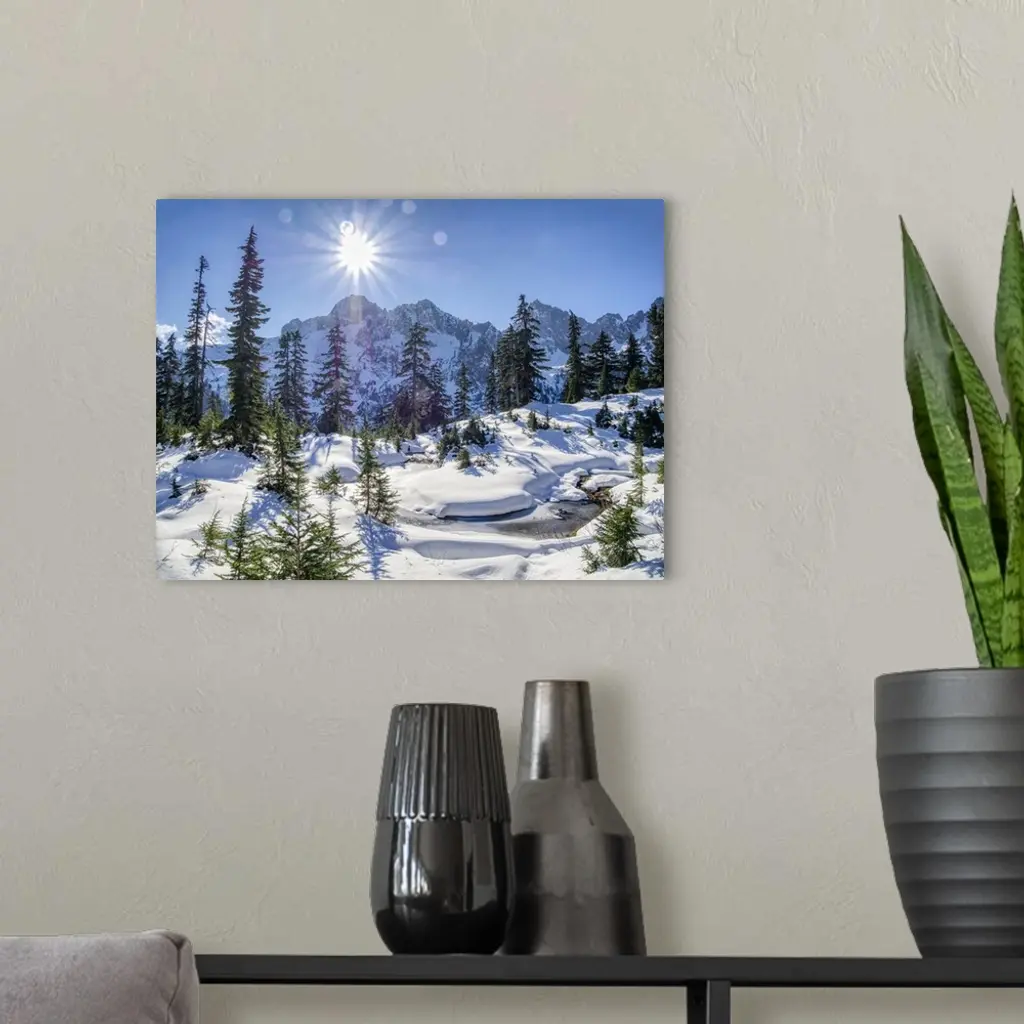 Washington, Alpine Lakes Wilderness, Frozen Alpine Pond, Fresh Snow And Cascade Range