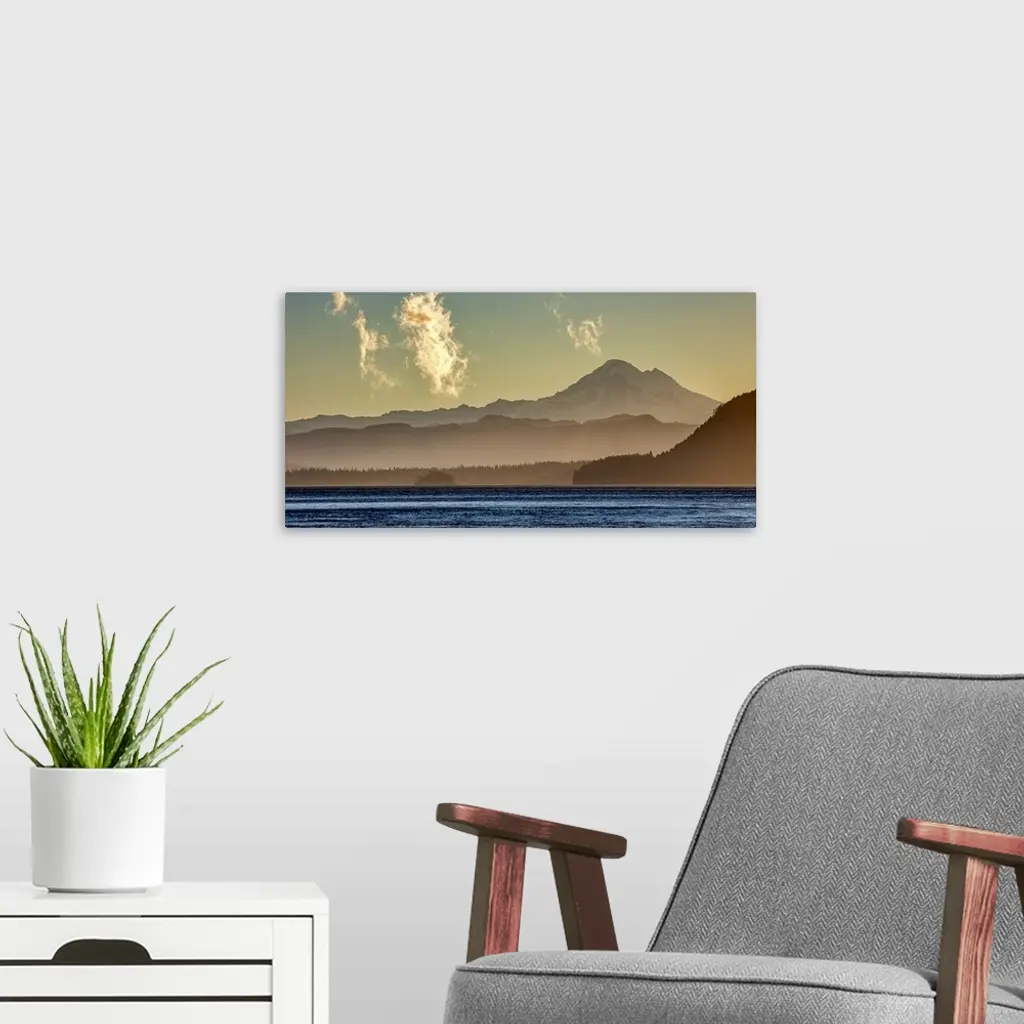 Mist surrounding the mountains on the Washington coast in dim sunlight with the bright blue ocean in the foreground.