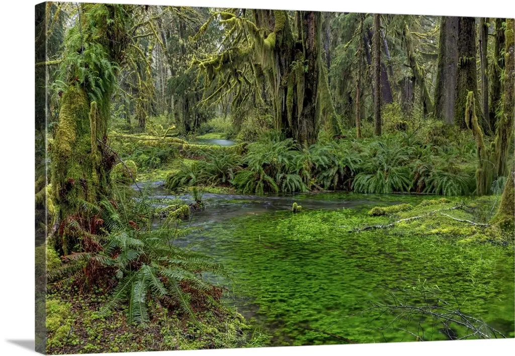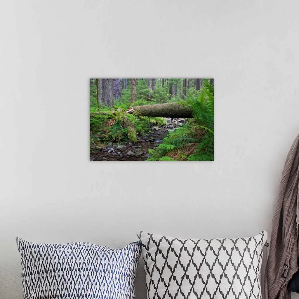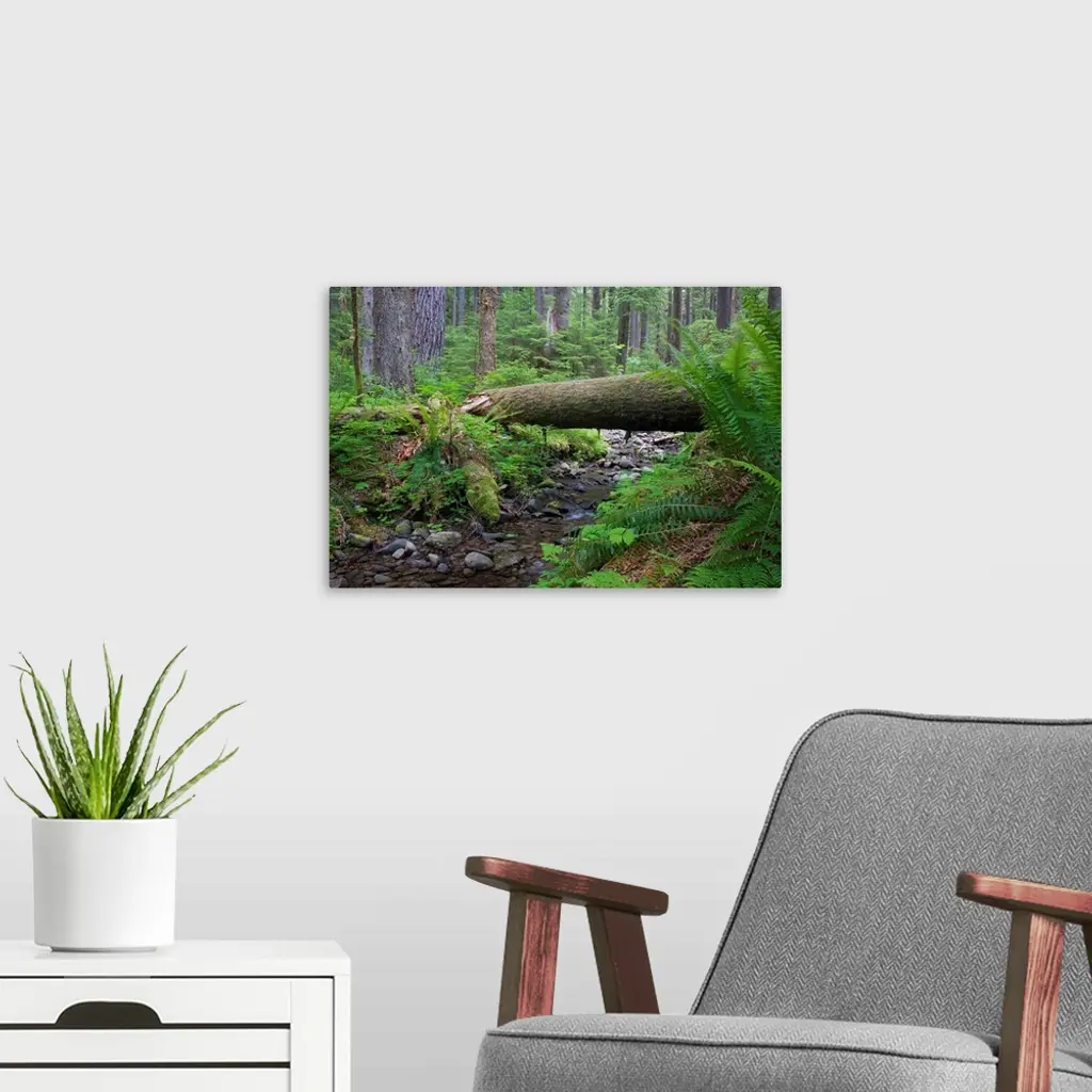 Washington, Olympic National Park, Fallen Log Over Creek In The Sol Duc Area