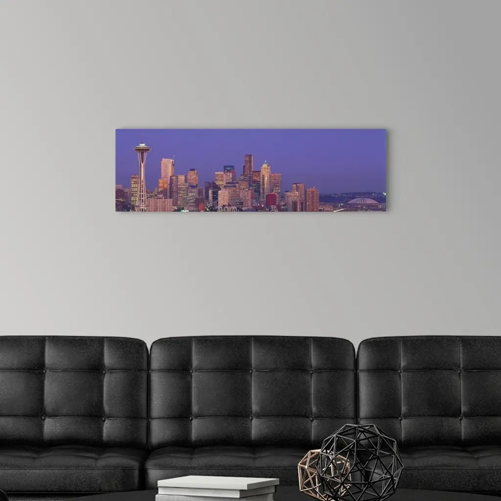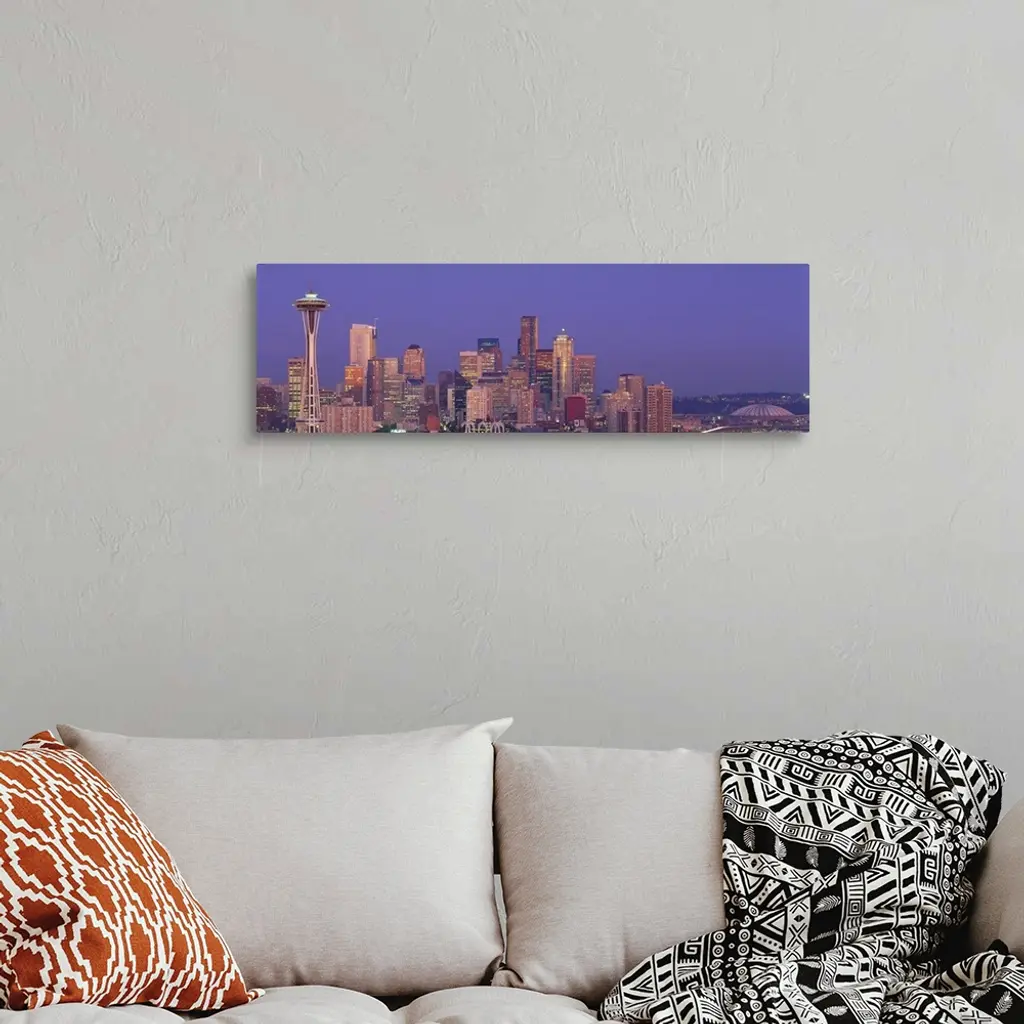 Panoramic photograph of lit up skyline at dusk with iconic buildings such as the Space Needle, Columbia Center, Smith Tower, and Seattle Municipal Building.