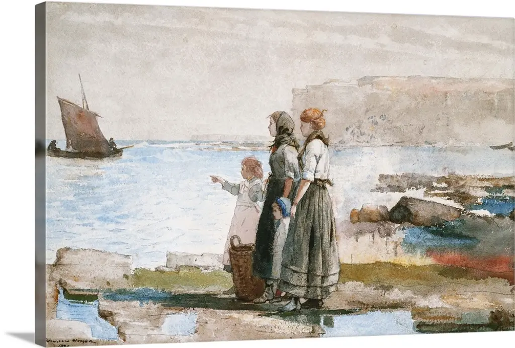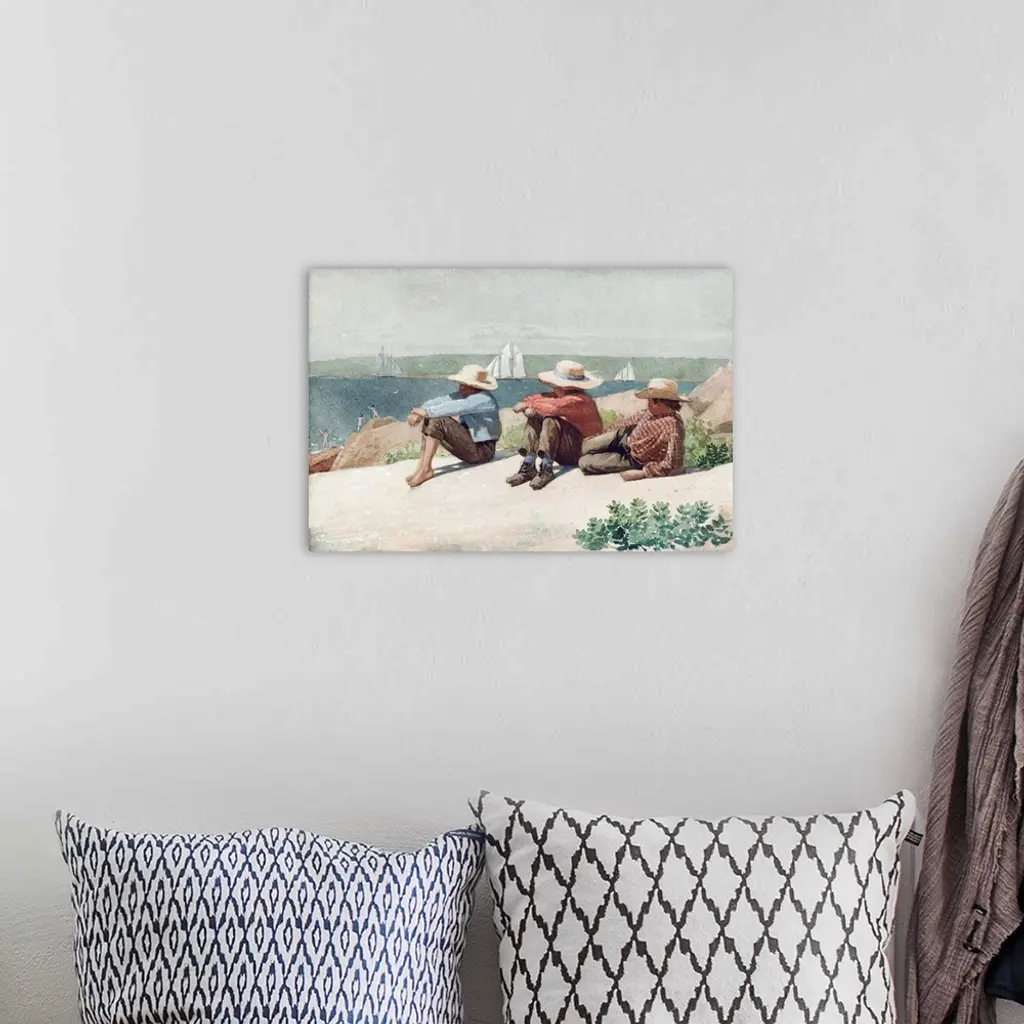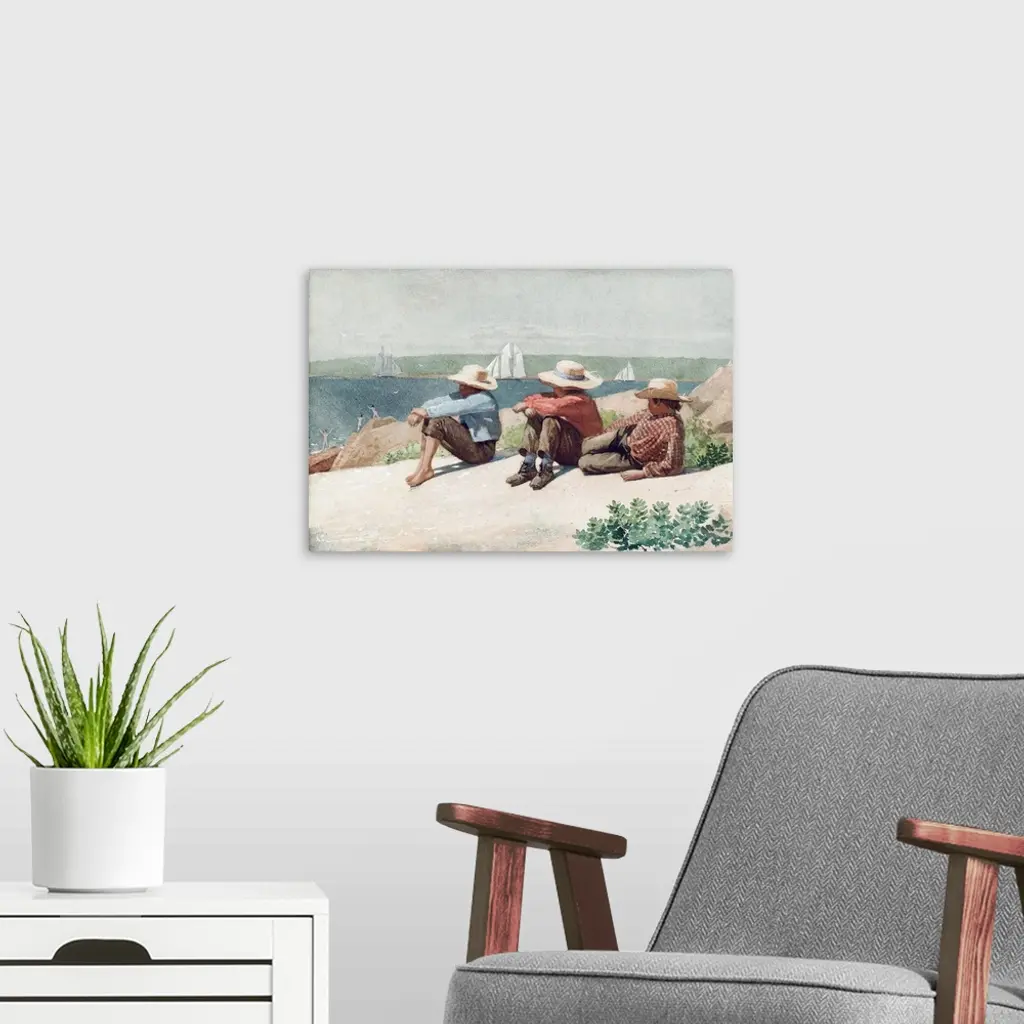 A serene coastal scene of three boys wearing straw hats and sitting on a large rock watching sailboats in the distance.