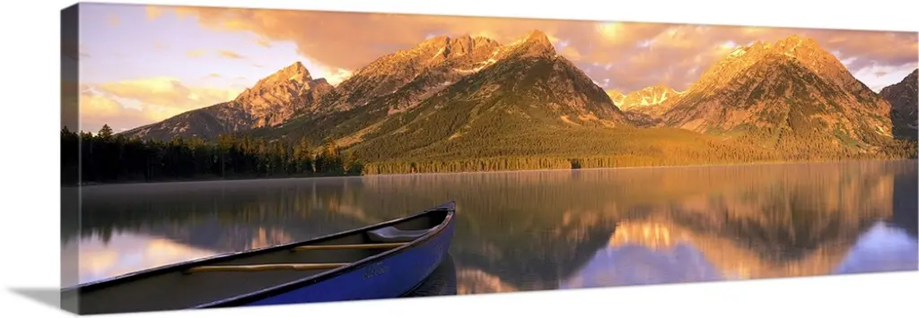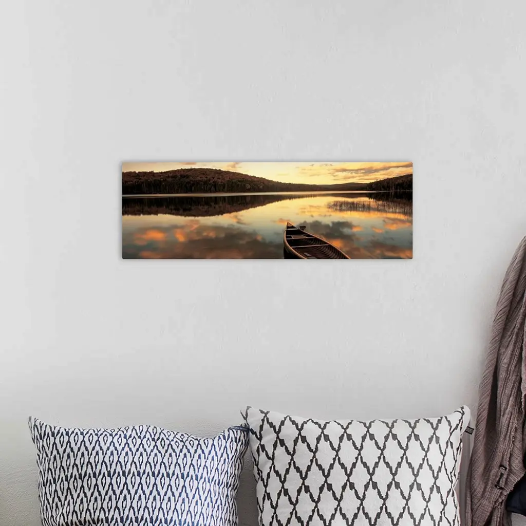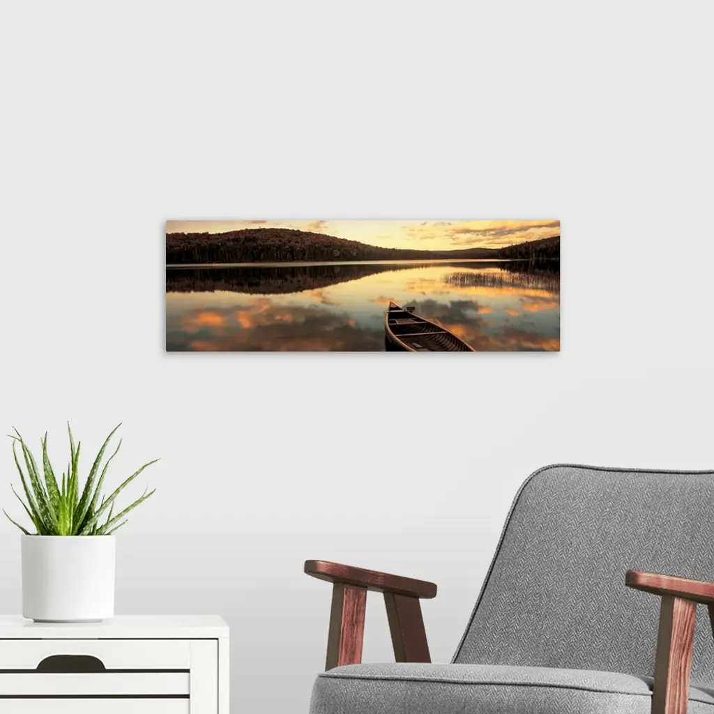 A canoe floats in a still lake at sunset in New England as clouds reflect in the water.