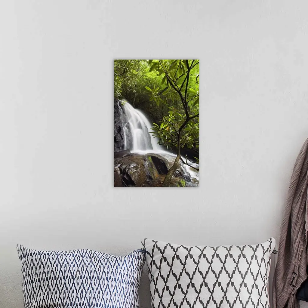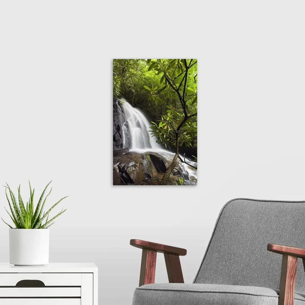 Vertical photograph on a big canvas of Laurel Creek Falls spilling over large rocks, surrounded by dense, green foliage, in the Great Smoky Mountains National Park, Tennessee.
